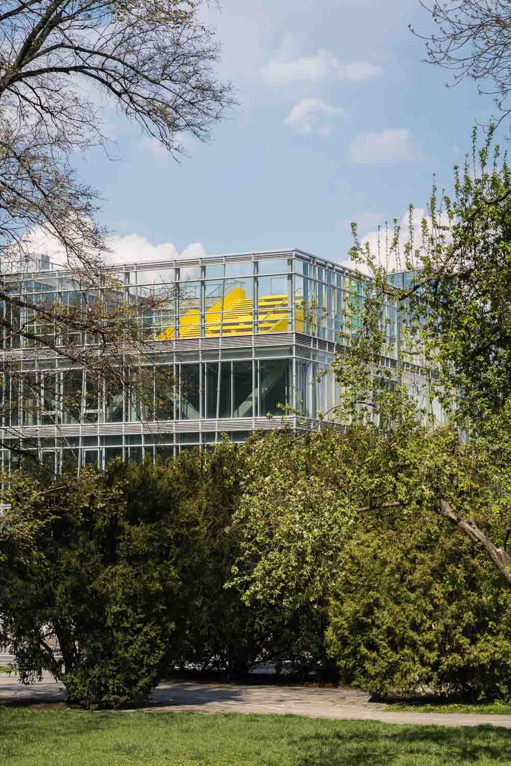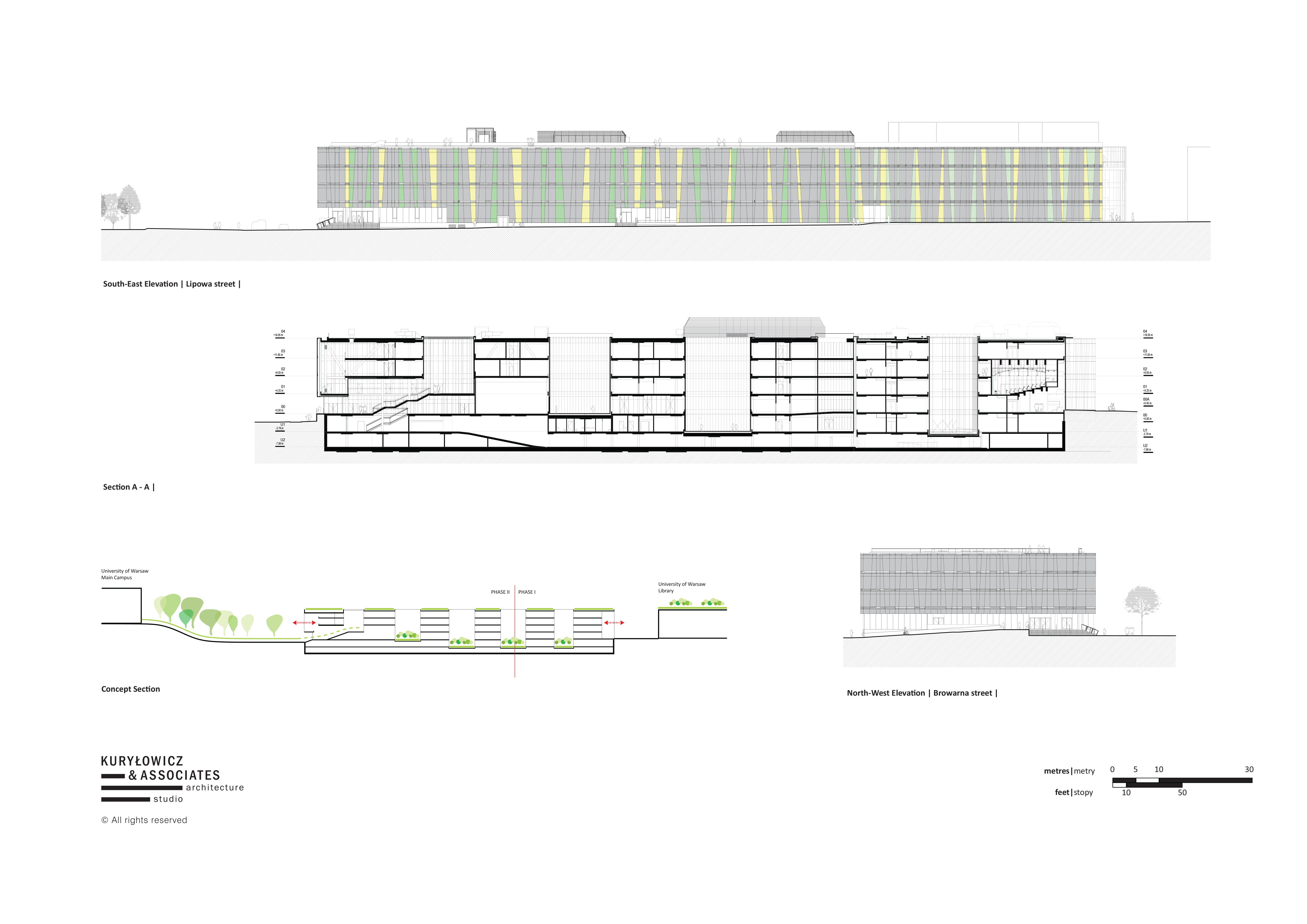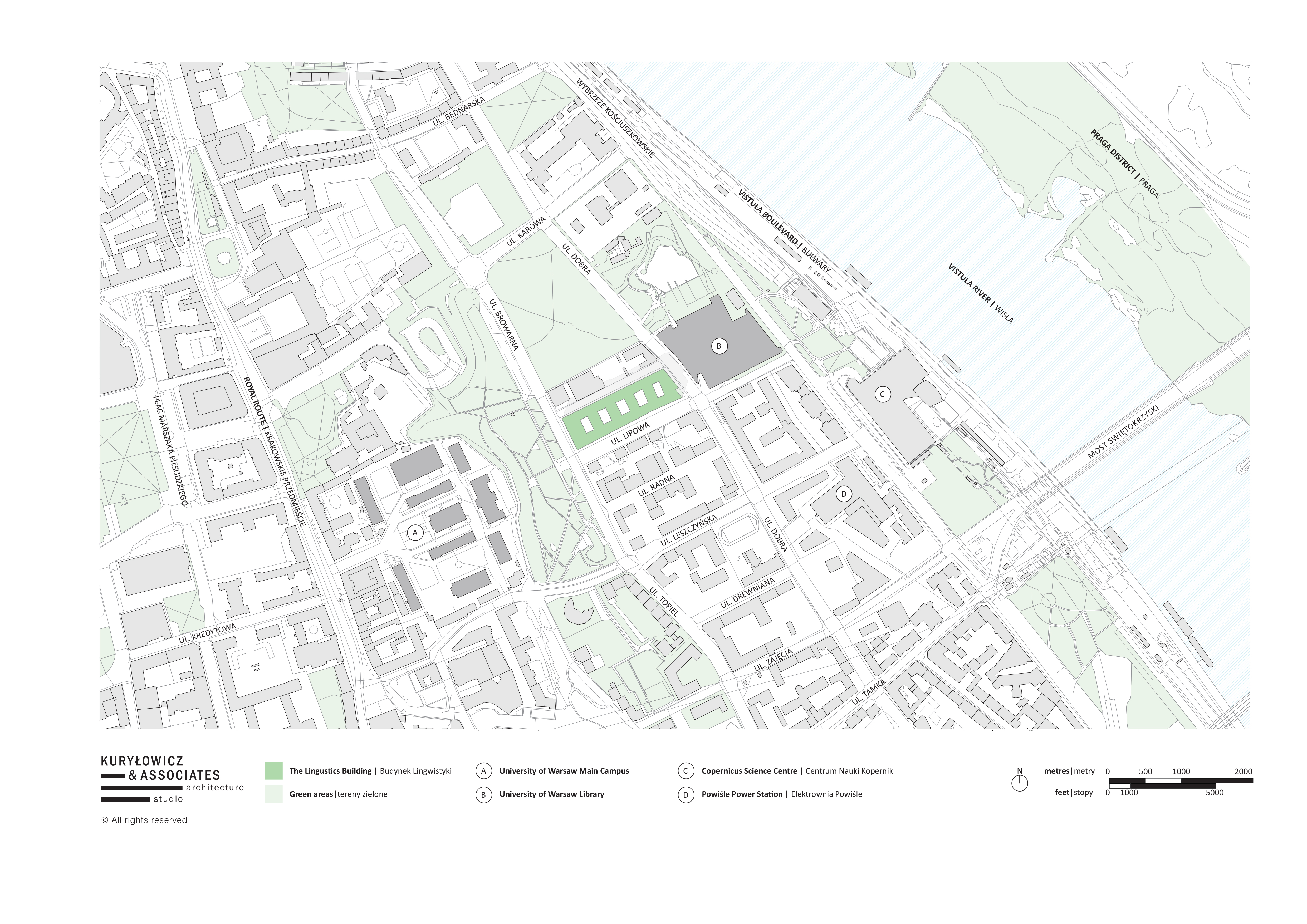 메인 캠퍼스와 강변의 동네 그리고 많은 사랑을 받는 도서관을 연결했고, 건물의 투명한 입면은 이웃과 자연을 향해 열리게 했다. 비슬라나(Wislana) 거리를 향한 반짝이는 유리 입면은 콘크리트 구조를 드러내고, 연속해서 비워진 중정 디자인은 공동의 에너지를 증폭시킨다.