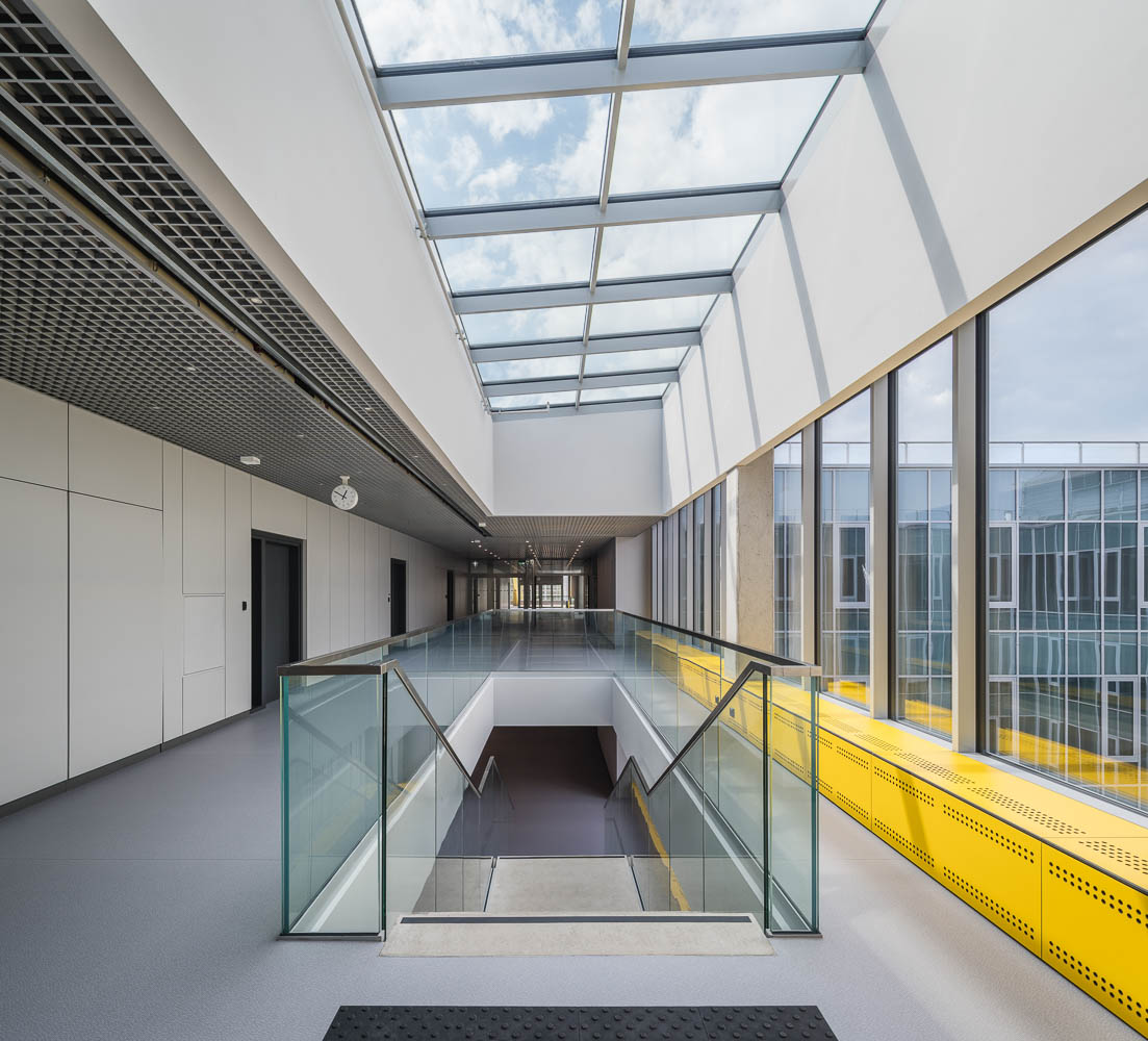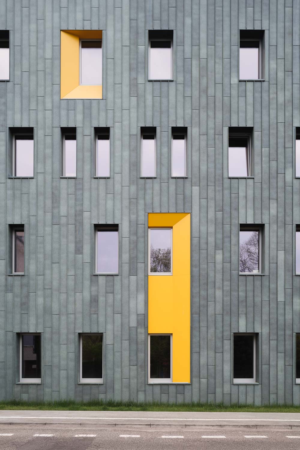 Accessible to all, the building provides a generous urban entrance in which the street corner is set back to form an entrance plinth and breakout spaces for every visitor to the building. Next, the spatial sequences continue with a flight of theatrical stairs which form a back bone and a social ‘connector’ throughout the remaining floors. This ‘connector’ starts at the street level and ends at the rooftops of the neighborhood with views over the city. The building not only strives for state-of-the-art teaching facilities, but also for an innovative way of tackling climate change. It does so via renewable energy and energy saving solutions. These include: heat pumps with ground heat exchangers, and the use of photovoltaic panels. The project also incorporates the use of energy-efficient chillers, energy-saving lighting systems and use of rainwater for garden irrigation.