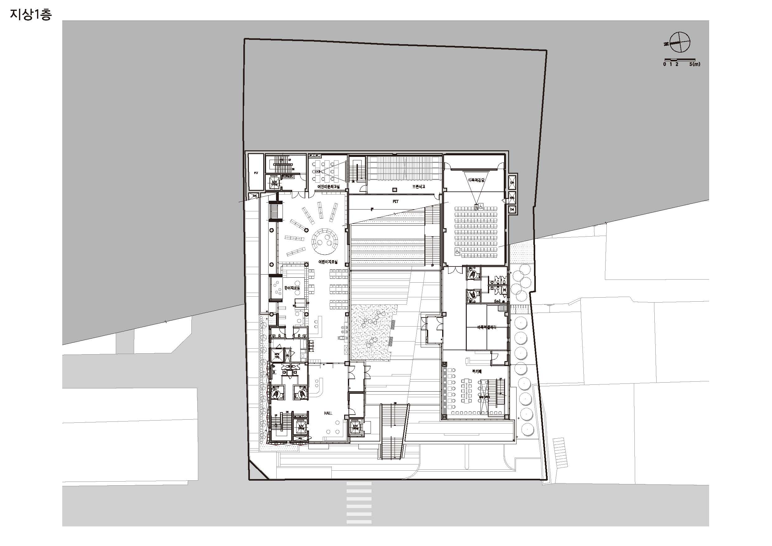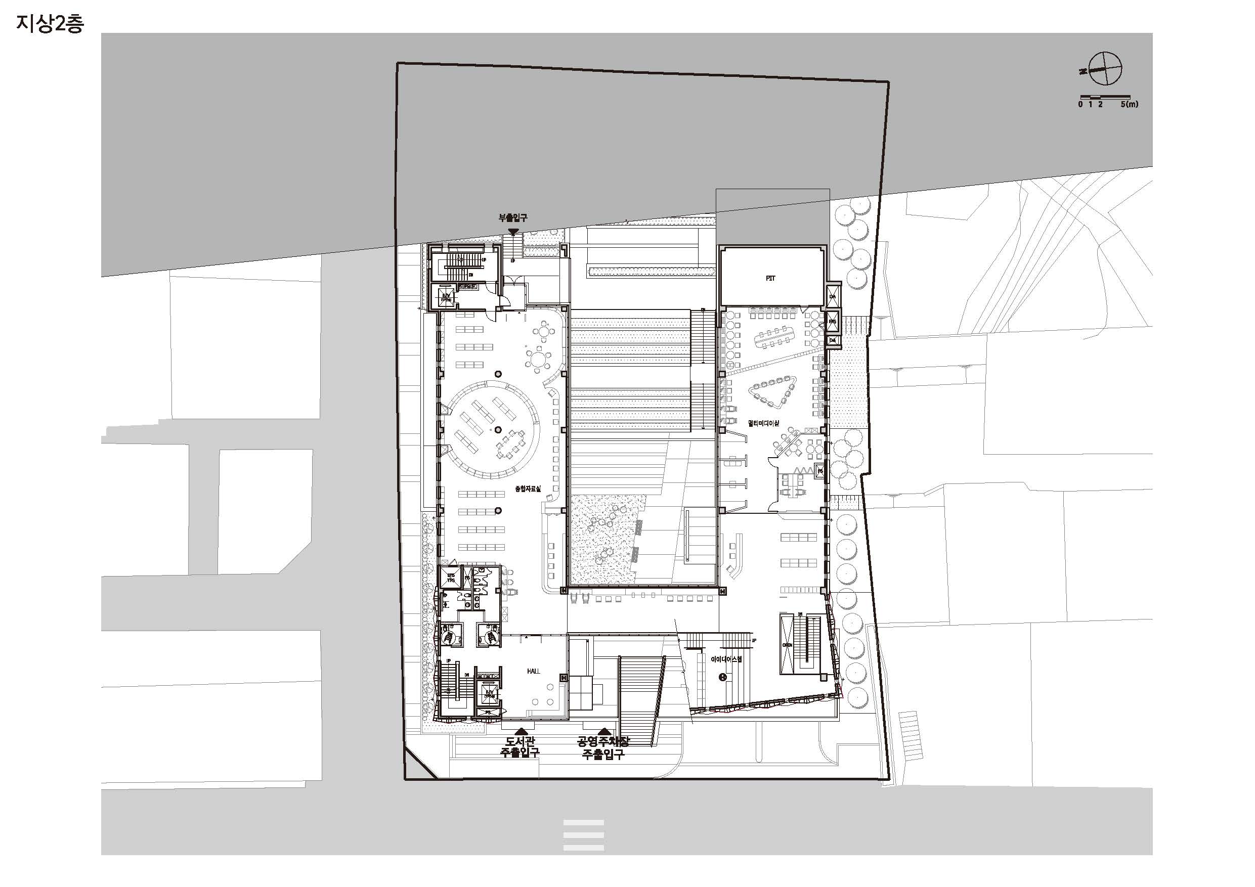 It is a project to plan a Geumsaem Library and a public parking lot by utilizing the idle land on the upper part of the Yunsan Tunnel. The planned site is a slope with a level difference of 15M in the east-west direction, with a small park on the front and a mountain on the back. The slope of the site and the nearby natural environment(small park, Mt.Yunsan) provided a big clue to the start of the plan. It focuses on creating a library that people go up and down and read books naturally as if climbing a mountain, the new large courtyard planned from the name of Geumsaem and a place of interaction where the residents can easily meet, talk and communicate each other. Judging the expression of the library viewed from Jungang-daero as the most important point, it was expressed in the form of ‘BOOK GATE’, which represents Geumjeong-gu and symbolizes Geumsaem Library. In addition to the symbolism of the entire mass, the elevation pattern modularized the unfolded book and expressed it rhythmically. The library were divided into the materials use section (children reference room, reference room) and the cultural education section (auditorium, cultural lecture room), to consider the use time and management of each section. The children’s archives located on the first floor were connected to Geumsaem Madang (courtyard) and Sunshine Maru (Sunken) to accommodate open and diverse programs. On the second and third floors, there are comprehensive reference rooms and book cafe that provide a three-dimensional reading environment, so that libraries that are easy to get bored are energized. The public parking lot is planned to be located on the 2nd and 3rd basement floors to help resolve parking lots in residential areas so that it can be operated separately from the Geumsaem Library.