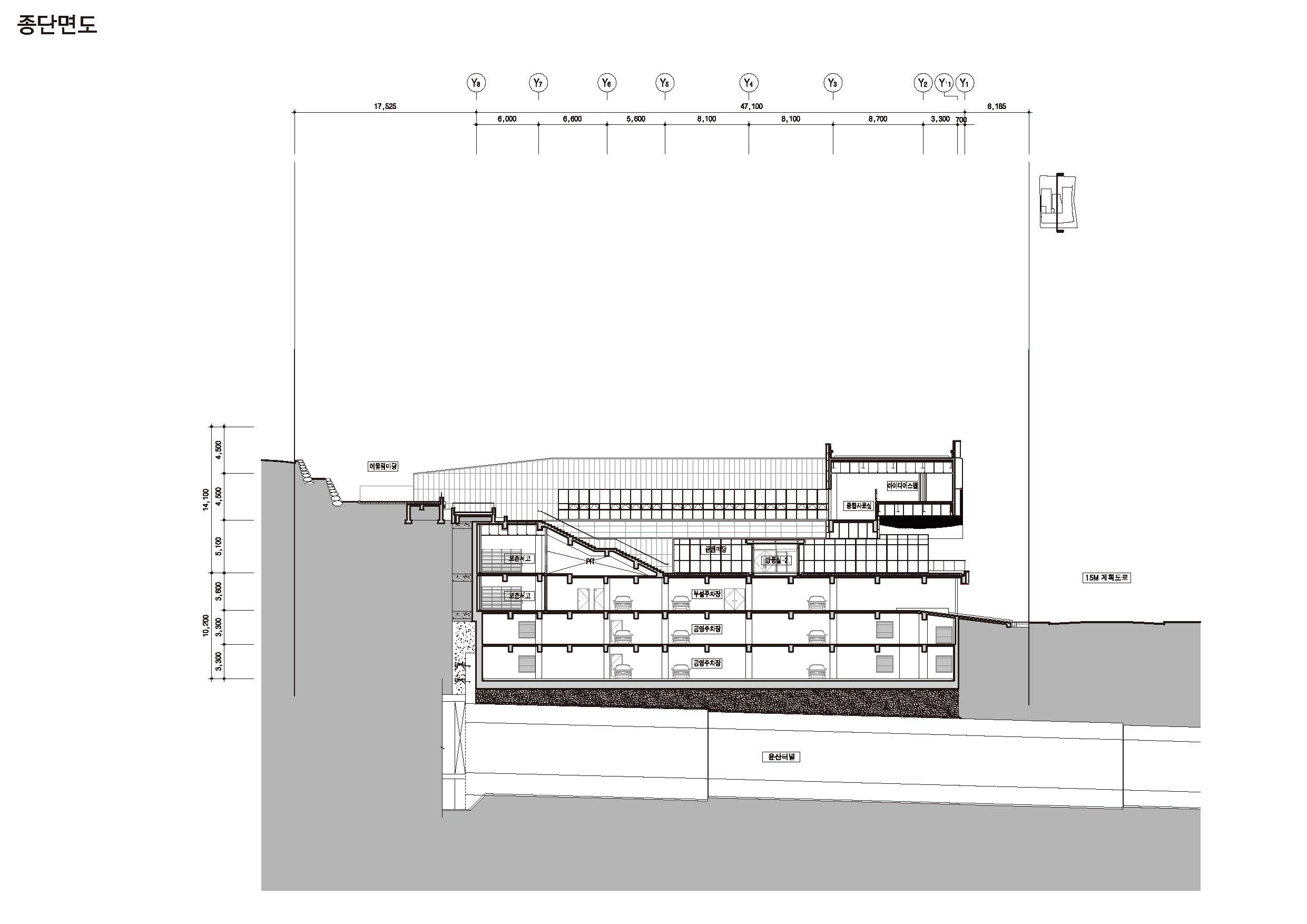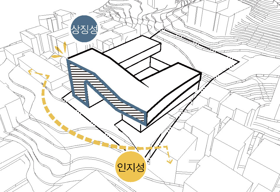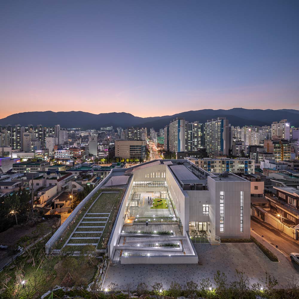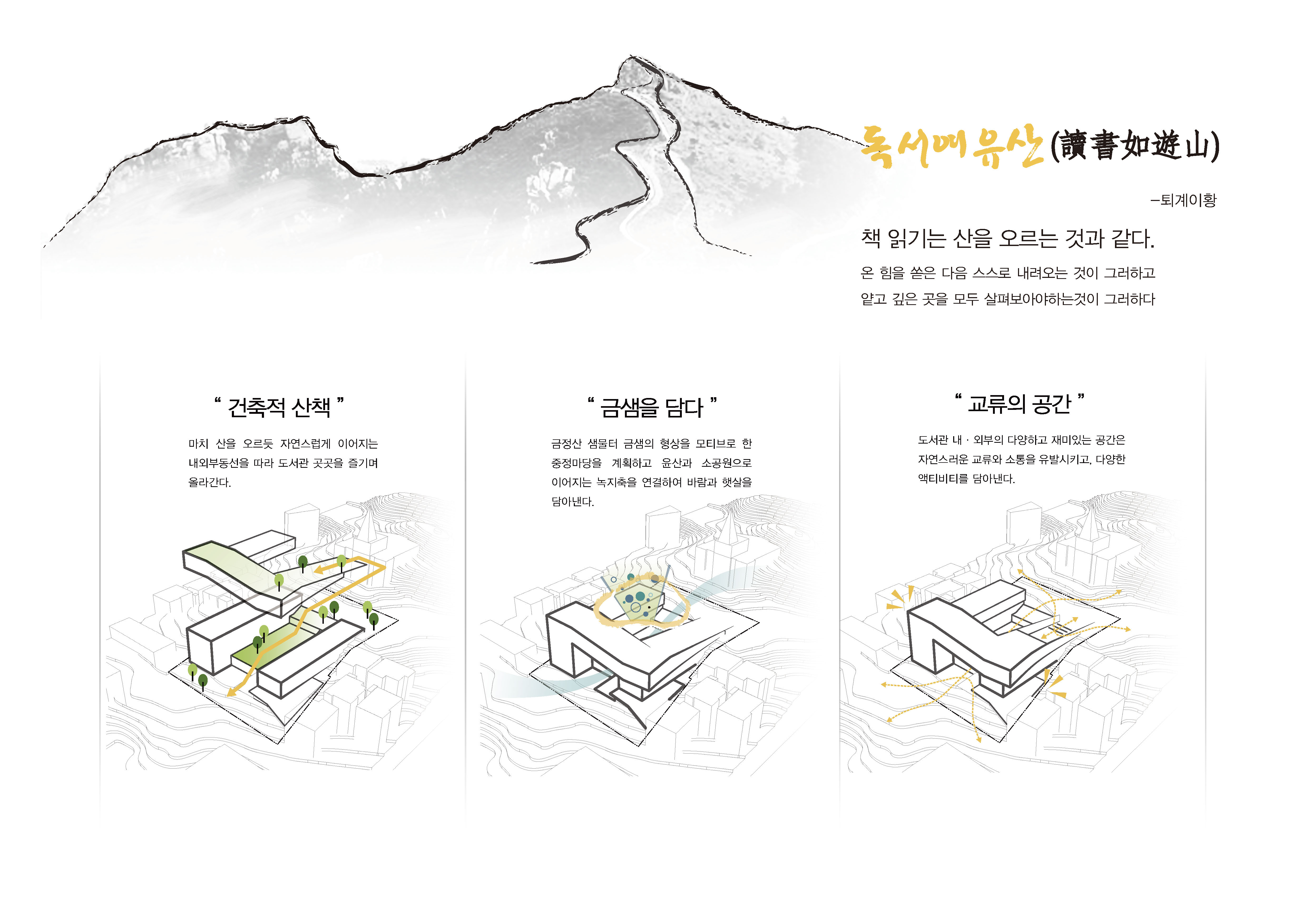 It is a project to plan a Geumsaem Library and a public parking lot by utilizing the idle land on the upper part of the Yunsan Tunnel. The planned site is a slope with a level difference of 15M in the east-west direction, with a small park on the front and a mountain on the back. The slope of the site and the nearby natural environment(small park, Mt.Yunsan) provided a big clue to the start of the plan. It focuses on creating a library that people go up and down and read books naturally as if climbing a mountain, the new large courtyard planned from the name of Geumsaem and a place of interaction where the residents can easily meet, talk and communicate each other. Judging the expression of the library viewed from Jungang-daero as the most important point, it was expressed in the form of ‘BOOK GATE’, which represents Geumjeong-gu and symbolizes Geumsaem Library. In addition to the symbolism of the entire mass, the elevation pattern modularized the unfolded book and expressed it rhythmically. The library were divided into the materials use section (children reference room, reference room) and the cultural education section (auditorium, cultural lecture room), to consider the use time and management of each section. The children’s archives located on the first floor were connected to Geumsaem Madang (courtyard) and Sunshine Maru (Sunken) to accommodate open and diverse programs. On the second and third floors, there are comprehensive reference rooms and book cafe that provide a three-dimensional reading environment, so that libraries that are easy to get bored are energized. The public parking lot is planned to be located on the 2nd and 3rd basement floors to help resolve parking lots in residential areas so that it can be operated separately from the Geumsaem Library.
