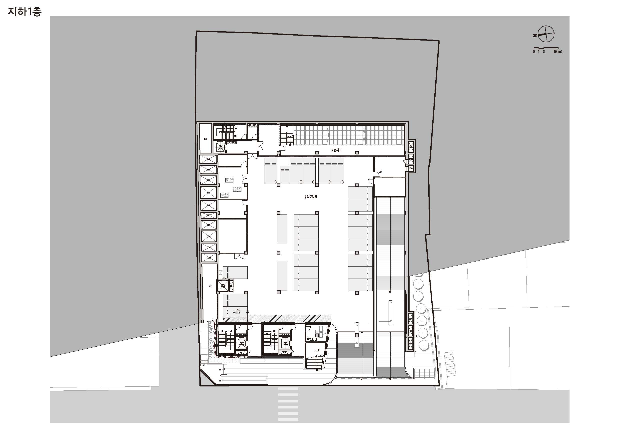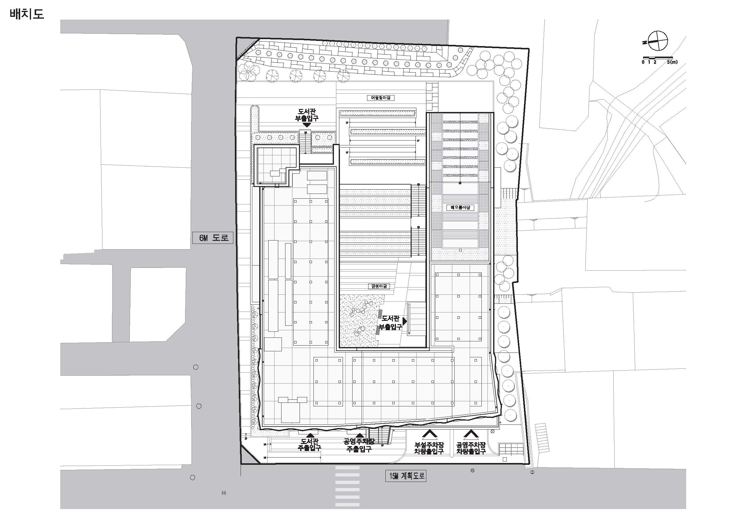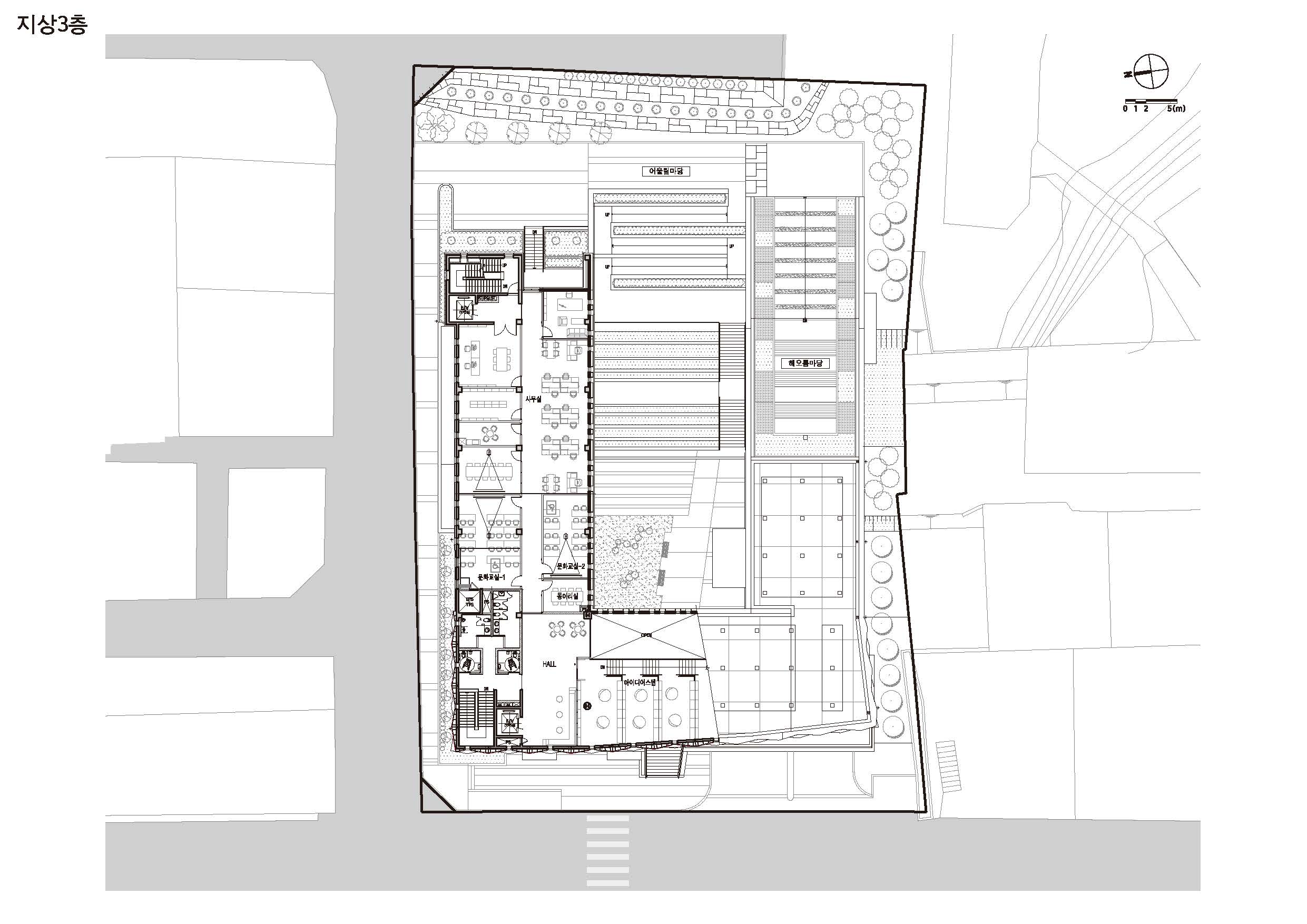 It is a project to plan a Geumsaem Library and a public parking lot by utilizing the idle land on the upper part of the Yunsan Tunnel. The planned site is a slope with a level difference of 15M in the east-west direction, with a small park on the front and a mountain on the back. The slope of the site and the nearby natural environment(small park, Mt.Yunsan) provided a big clue to the start of the plan. It focuses on creating a library that people go up and down and read books naturally as if climbing a mountain, the new large courtyard planned from the name of Geumsaem and a place of interaction where the residents can easily meet, talk and communicate each other. Judging the expression of the library viewed from Jungang-daero as the most important point, it was expressed in the form of ‘BOOK GATE’, which represents Geumjeong-gu and symbolizes Geumsaem Library. In addition to the symbolism of the entire mass, the elevation pattern modularized the unfolded book and expressed it rhythmically. The library were divided into the materials use section (children reference room, reference room) and the cultural education section (auditorium, cultural lecture room), to consider the use time and management of each section. The children’s archives located on the first floor were connected to Geumsaem Madang (courtyard) and Sunshine Maru (Sunken) to accommodate open and diverse programs. On the second and third floors, there are comprehensive reference rooms and book cafe that provide a three-dimensional reading environment, so that libraries that are easy to get bored are energized. The public parking lot is planned to be located on the 2nd and 3rd basement floors to help resolve parking lots in residential areas so that it can be operated separately from the Geumsaem Library.