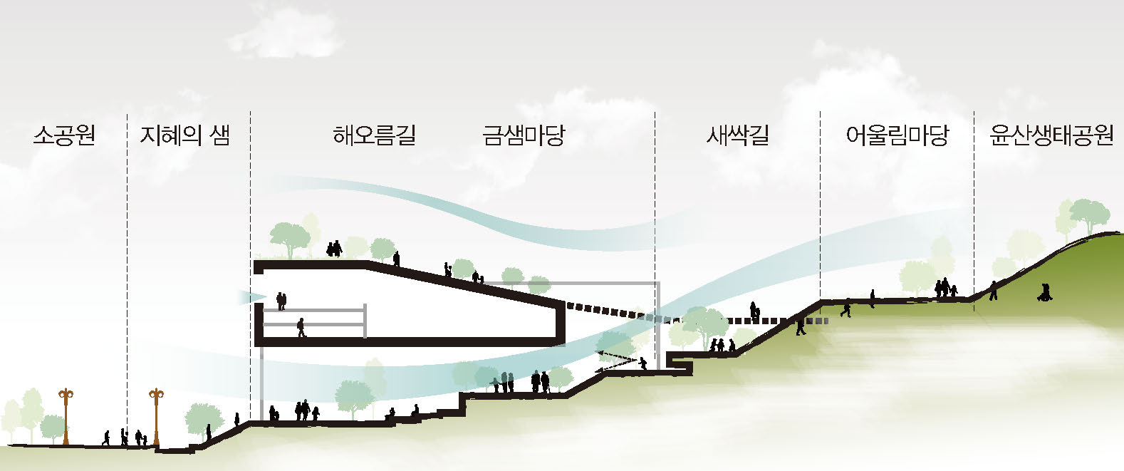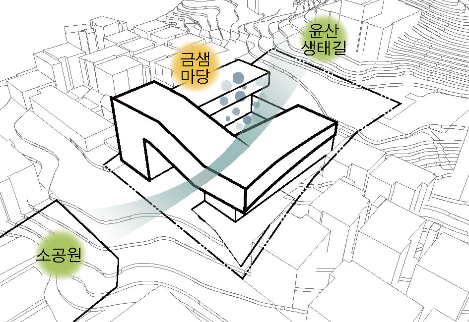 부산 윤산을 관통하는 터널 상부 유후 부지에 산을 따라 오르내리며 책을 읽는 도서관이 들어섰다. 금샘도서관은 윤산터널 근처에 공영주차장을 포함한 공공시설로, 동서 방향으로 15m의 레벨 차이가 있는 경사 지형에 세워졌다. 전면부는 소공원, 배면에는 윤산이 단단히 자리잡고 있다. 퇴계 이황의 ‘책 읽기는 산을 오르는 것과 같다(讀書如遊山)’라는 말에서 영감을 얻어 설계된 금샘도서관은 경사 지형을 활용한 동선과 산을 배경으로 독서와 다양한 활동을 할 수 있는 중정을 가지고 있다. 인근 주민들은 도서관에서 쉽게, 자연스럽게 만나며 이야기를 나누고 정보를 교환할 수 있다.