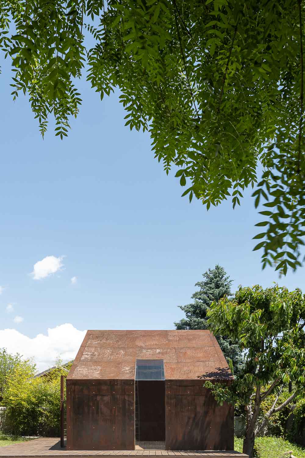 Furthermore, some little lights are placed inside the oversized bookshelves giving the effect of fireflies. Two technical lights placed 4 meters high, lit the main table of the writer. The continuous envelope of the cabin roof is made of folded oxidized iron. The finishing and tones are controlled by the level of oxidation. The architects custom-made an extremely thin oxidized iron frame for each main façade allowing the laminated glass to offer total integration of the house into the stunning garden.
