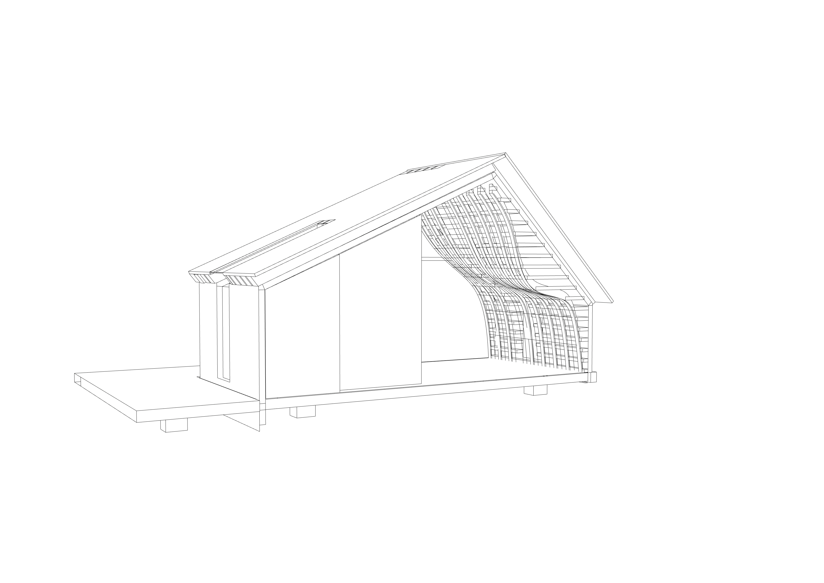 책장은 CNC로 절단된 100개의 다른 조각으로 구성되어 있으며, 가능한 가장 분산된 효과를 내기 위해 다양한 종류의 건식 조립 테스트를 했다. 천장의 가장 높은 지점에는 검은색 주철 키미네아가 걸려 있어, 오두막집에 균형감을 준다. 이 집의 테라스는 실내의 나무 바닥과 매끄럽게 이어진다. 이 프로젝트의 가장 큰 도전은 디지털과 수작업 시공이 아닌, 건축주가 꿈꾸는 집을 완성할 수 있게 하는 감성의 수준에 있었다.