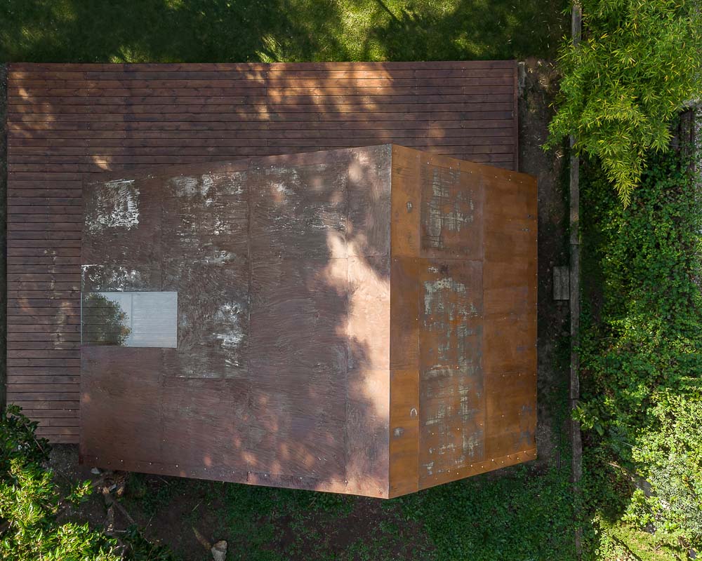 Yes the continuous folded envelope is of oxidated iron. The idea was the the client would control the level of oxydation playing with the different leatherly tones combined with the naturally ocurring orange. Inside the seamless smooth maple wood board are oiled with darker coating to match the leartherly effect of the outside. The pale untreated and exposed veins of the bookshelves pile wood contrasts with the darker maple wood of the rest of the cabin.