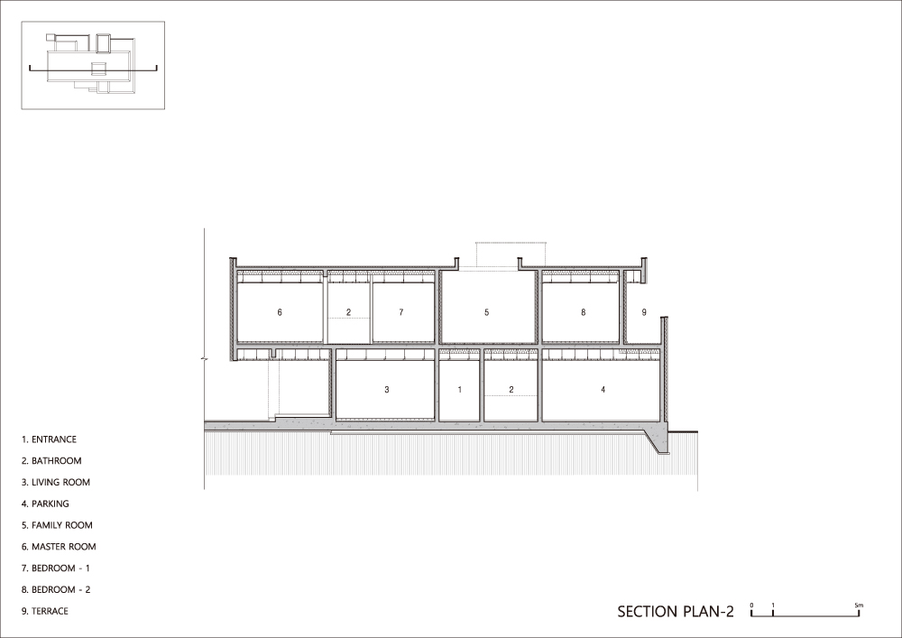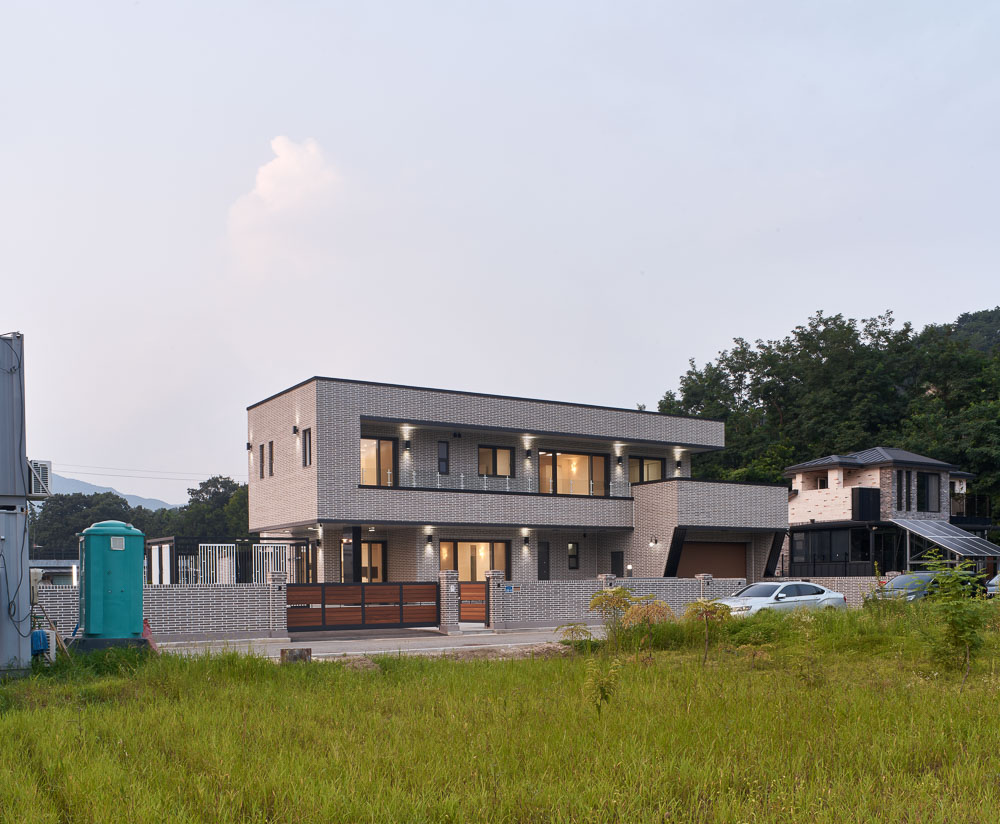 There is a house built along a small hill in Jinae-ri, Dong-myeon, Chucheon city. Gasan 60-9 is a house for a young couple with two children. The client moved to the suburbs of Chuncheon to be close to work, and for the education of their children, who are to enter elementary school soon, as well as to escape from the noise between floors of apartment complexes. Even in the tranquil neighborhood of Jinae-ri, the site of Gasan 60-9 has a long form stretching from east to west, as well as a hill in the east and the main access road in the south.