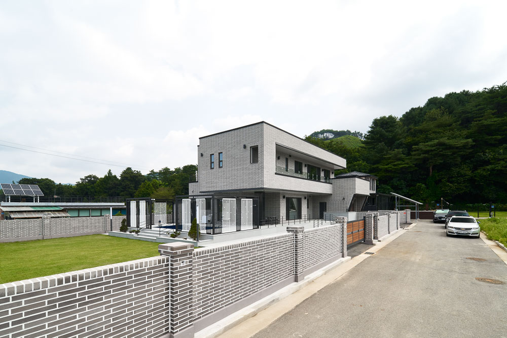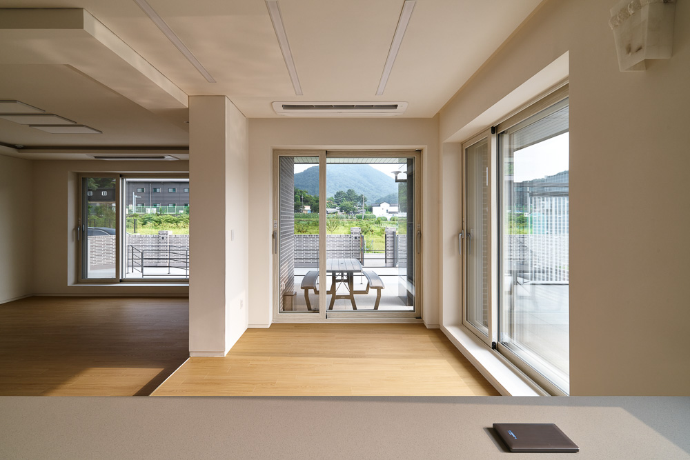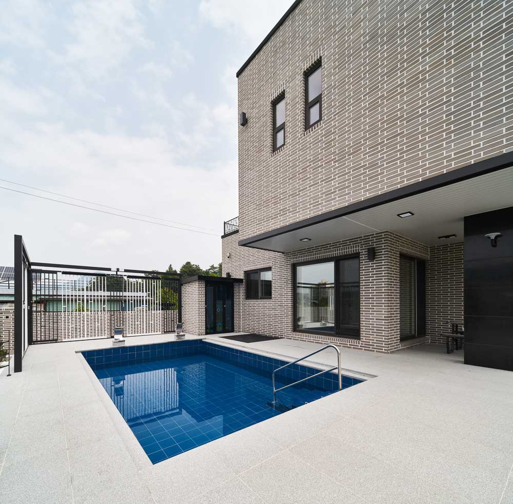 The young couple didn’t have many belongings other than their children’s things, and since they were used to urban life, the space that allowed easy management of the large house in the countryside mattered, and there had to be a yard where the client and their children, who like soccer, can run around. The first floor of Gasan 60-9 is composed around the reception and a space for guests, and the second floor has the living space for the family. Furthermore, there is also an interior parking space as well as a small pool just for the family in the deck area. The first floor can be accessed with the front entrance through the interior parking lot. The laundry room is located next to the front door so that the husband can take a shower and do the laundry right after he gets home from work, and there is a separate space for guests at the end of the hallway. The living room in the south was distinguished by giving it a difference in floor height from the kitchen, and there is a small exterior pool right next to the kitchen that allows the children to be watched over from the wife’s line of sight. The circulation from the front door of the first floor through the stairs to the second floor, the main living space, is clear and short. The second floor is the living space for the children and the couple, and the family room is the children’s education and play space for the couple. Two children’s rooms and a bedroom for the couple are arranged around this family room. In particular, all spaces on the second floor are arranged to face the south, allowing the stretched-out nature to be seen from the inside and outside through the wide terrace.