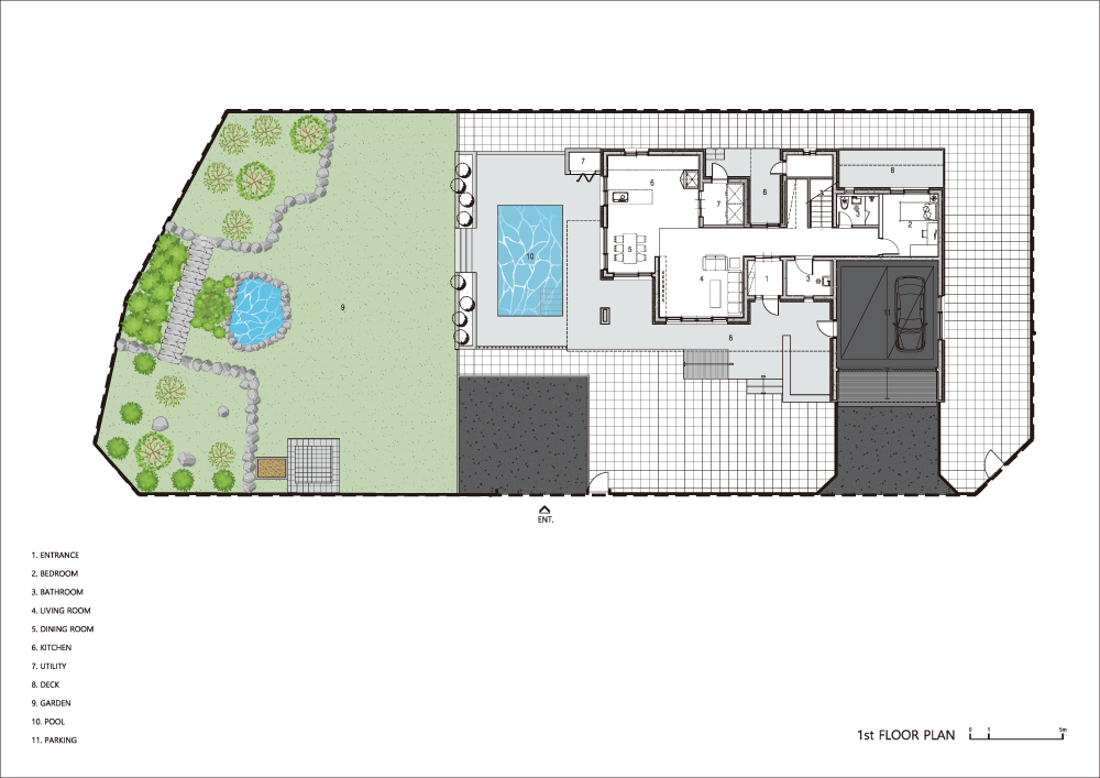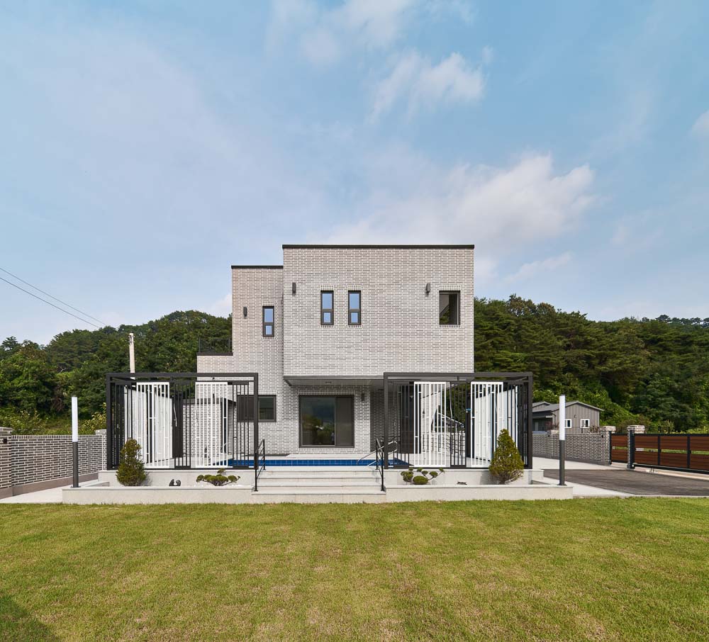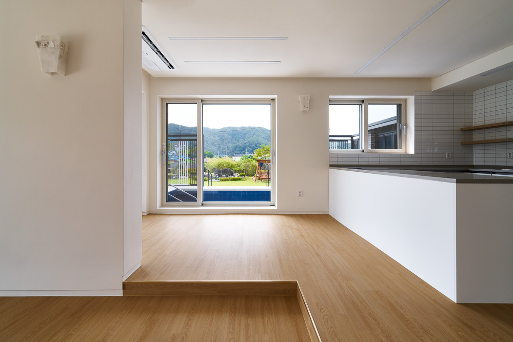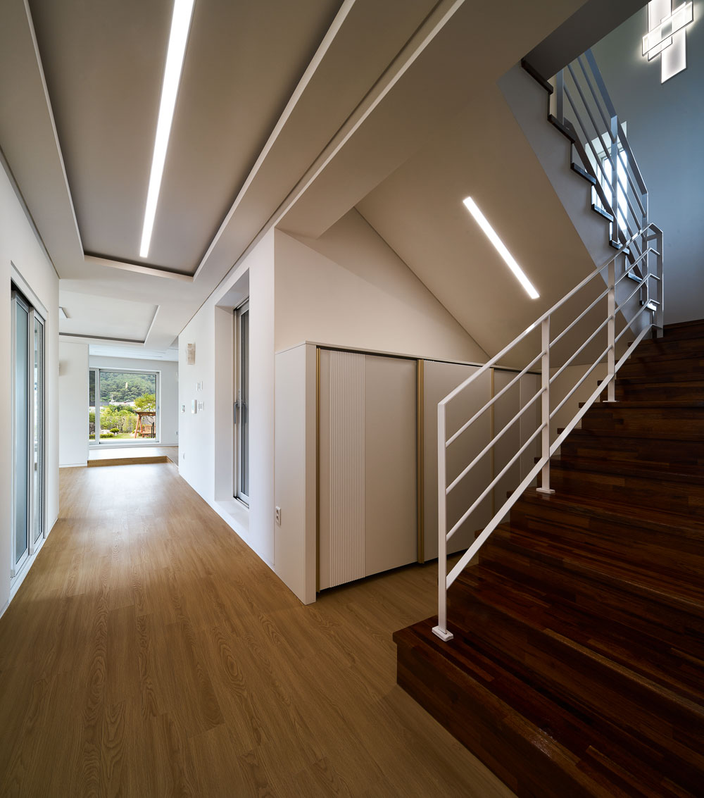 The young couple didn’t have many belongings other than their children’s things, and since they were used to urban life, the space that allowed easy management of the large house in the countryside mattered, and there had to be a yard where the client and their children, who like soccer, can run around. The first floor of Gasan 60-9 is composed around the reception and a space for guests, and the second floor has the living space for the family. Furthermore, there is also an interior parking space as well as a small pool just for the family in the deck area. The first floor can be accessed with the front entrance through the interior parking lot. The laundry room is located next to the front door so that the husband can take a shower and do the laundry right after he gets home from work, and there is a separate space for guests at the end of the hallway. The living room in the south was distinguished by giving it a difference in floor height from the kitchen, and there is a small exterior pool right next to the kitchen that allows the children to be watched over from the wife’s line of sight. The circulation from the front door of the first floor through the stairs to the second floor, the main living space, is clear and short. The second floor is the living space for the children and the couple, and the family room is the children’s education and play space for the couple. Two children’s rooms and a bedroom for the couple are arranged around this family room. In particular, all spaces on the second floor are arranged to face the south, allowing the stretched-out nature to be seen from the inside and outside through the wide terrace.
