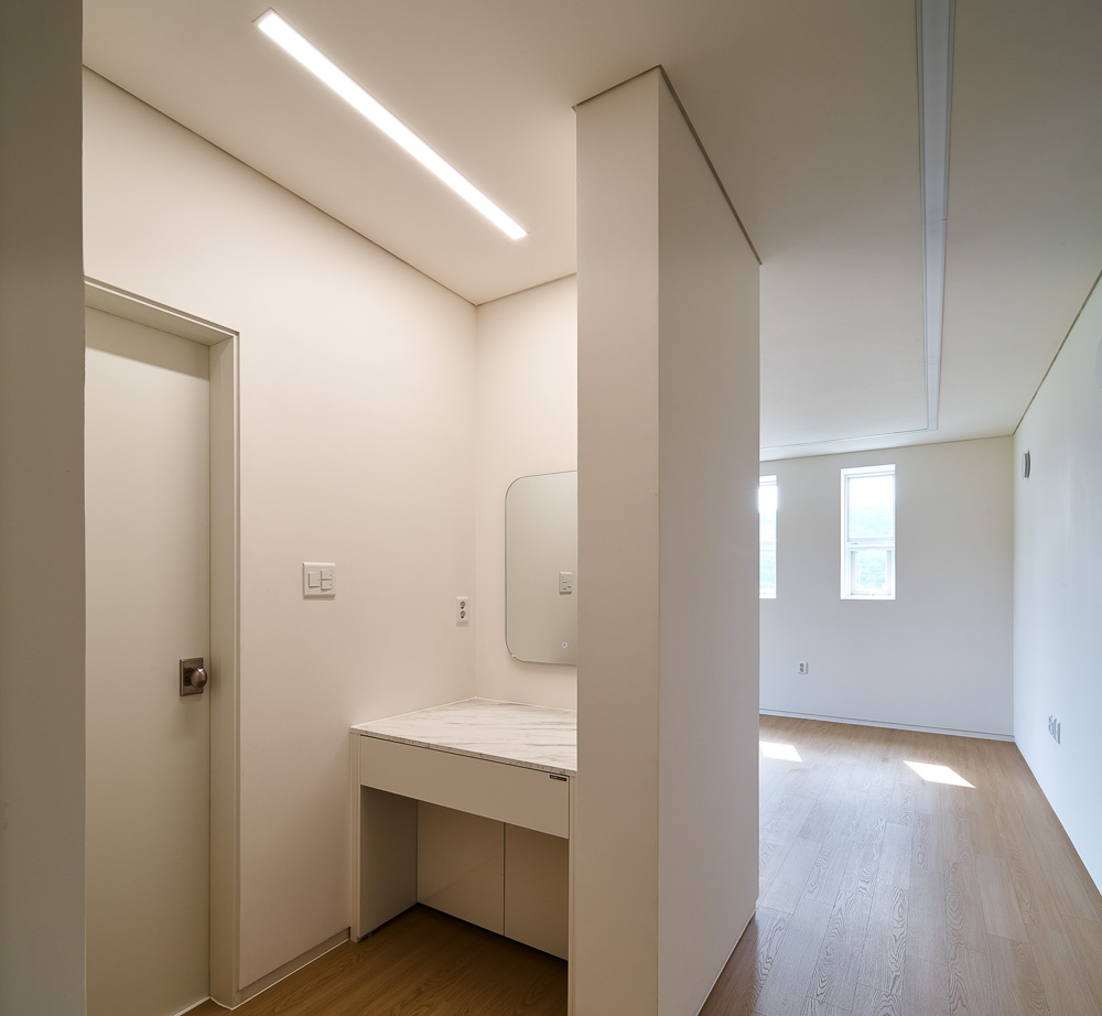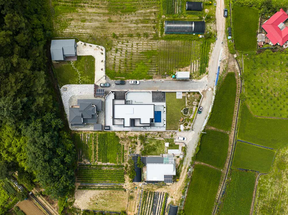 There is a house built along a small hill in Jinae-ri, Dong-myeon, Chucheon city. Gasan 60-9 is a house for a young couple with two children. The client moved to the suburbs of Chuncheon to be close to work, and for the education of their children, who are to enter elementary school soon, as well as to escape from the noise between floors of apartment complexes. Even in the tranquil neighborhood of Jinae-ri, the site of Gasan 60-9 has a long form stretching from east to west, as well as a hill in the east and the main access road in the south.