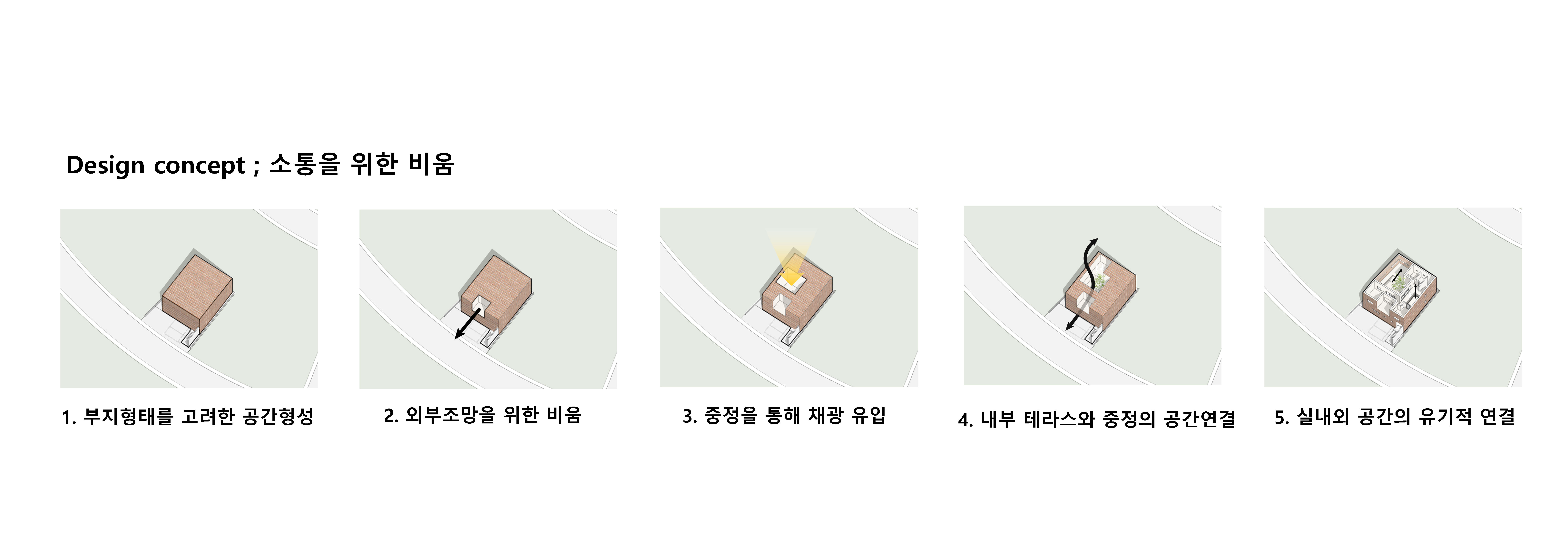 이 집의 핵심 공간은 중정이다. 중정은 소통을 위한 비움으로 모든 공간에서 시선을 공유할 수 있도록 한다. 거실에서만 소통하던 기존 주거공간과 달리 각자의 공간에서도 함께 있다는 것을 느낄 수 있도록 했다. 또한, 건물을 들어서면 만나는 실외공간으로 빛, 바람, 눈과 비가 들어와 집 안에서도 자연을 느낄 수 있다. 인공적인 장치가 아닌 자연으로 식물이 자라는 것을 볼 수 있는 아이들과 식물이 함께 자라는 공간이다.