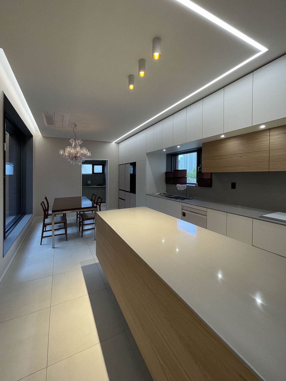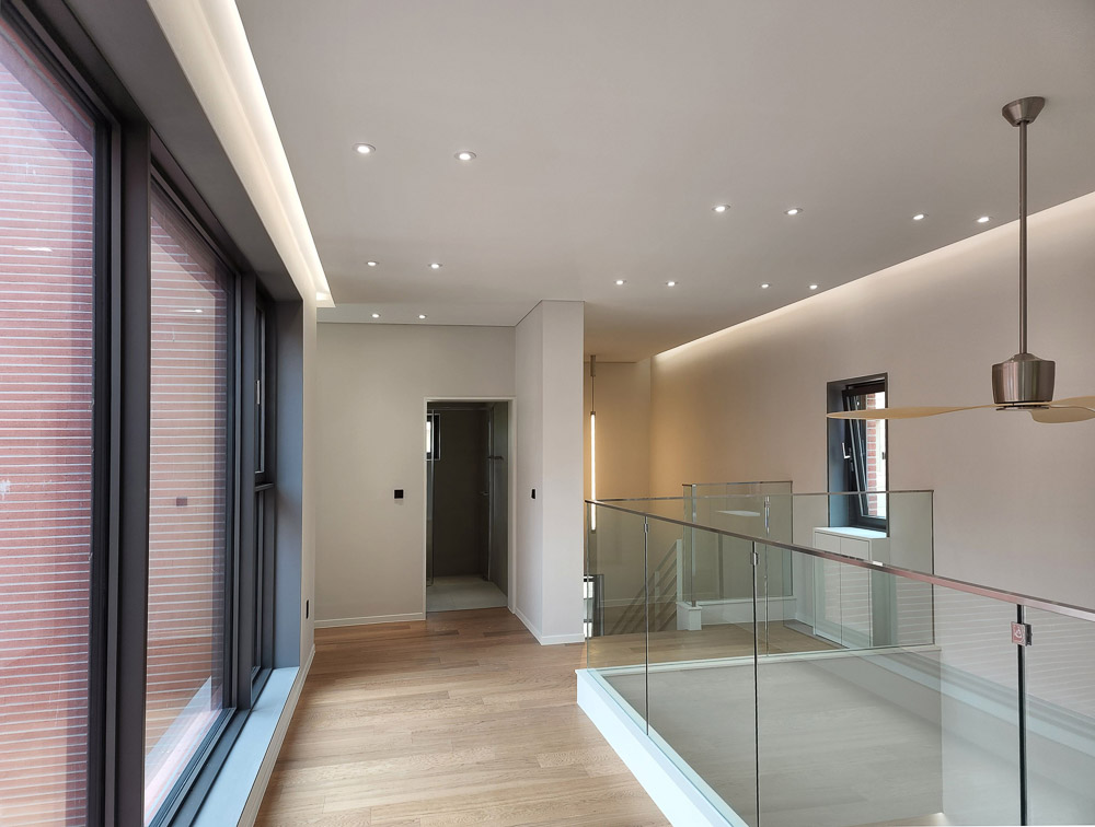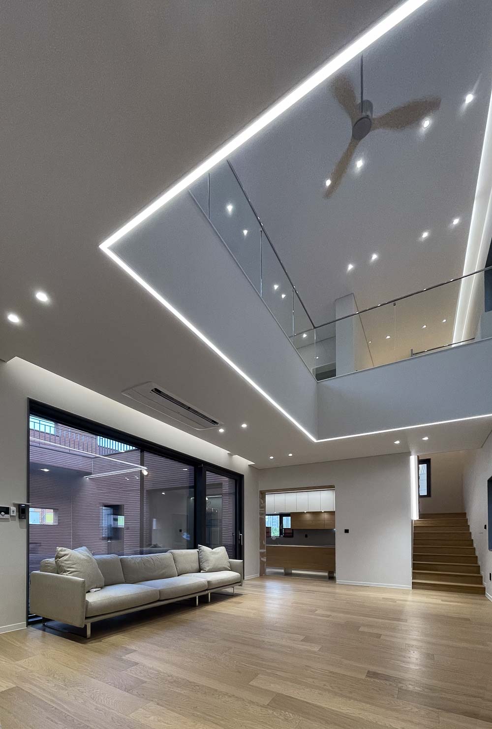 조금은 무겁고 단조로운 외부와 달리 내부로 들어서는 순간 탁 트인 공간이 드러난다. 마치 ‘이상한 나라의 앨리스’의 토끼굴을 지나 만나는 것 같은 공간의 반전은 집에 대한 흥미를 더한다. 현관과 붙어있는 비워진 내부공간은 높은 층고로 집에 들어오면서 느끼는 답답함을 덜어낸다. 또한, 공간을 이동하려면 필연적으로 지나야 하는 공간을 비워내, 가족들이 눈을 맞추고, 손 인사를 하며 소통이 계속해서 이어지도록 했다.