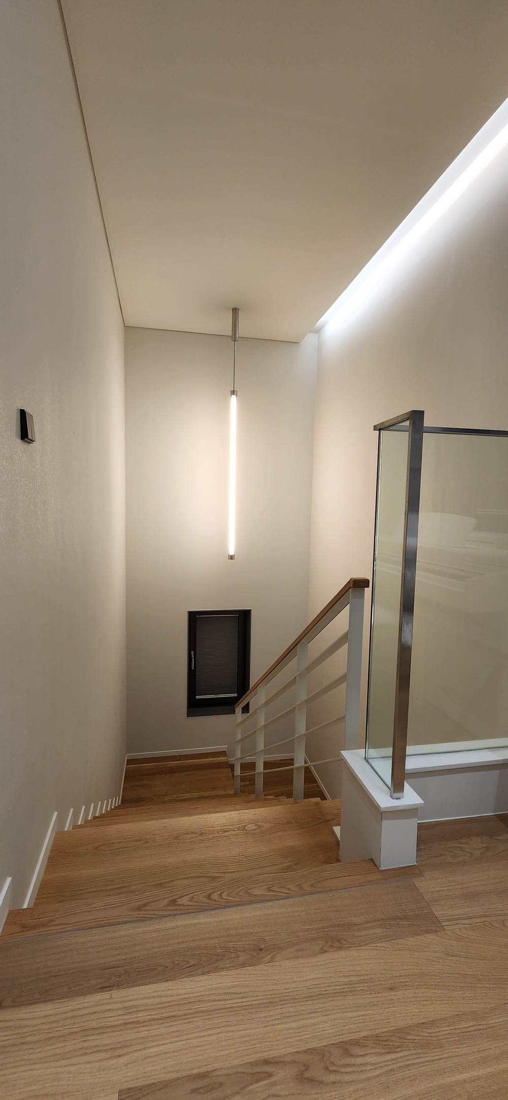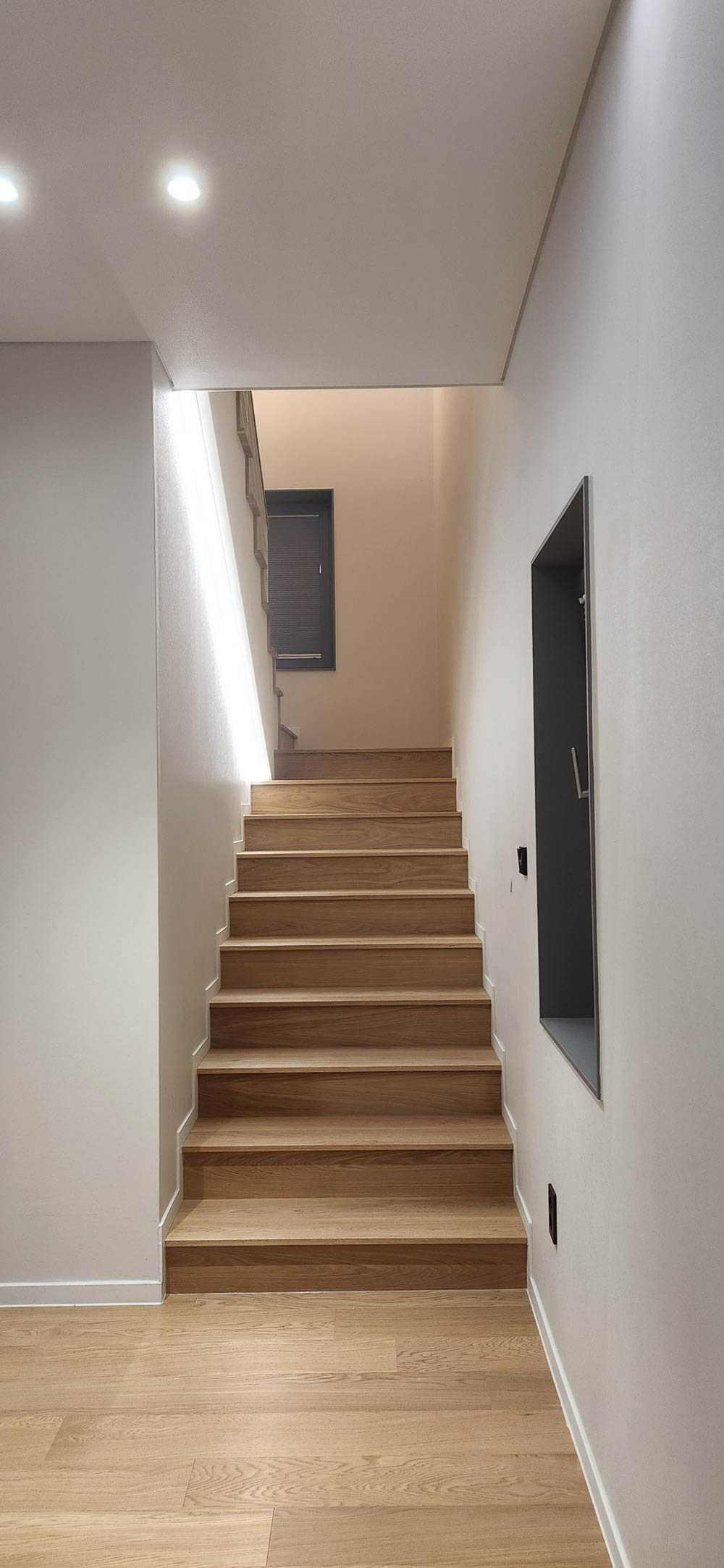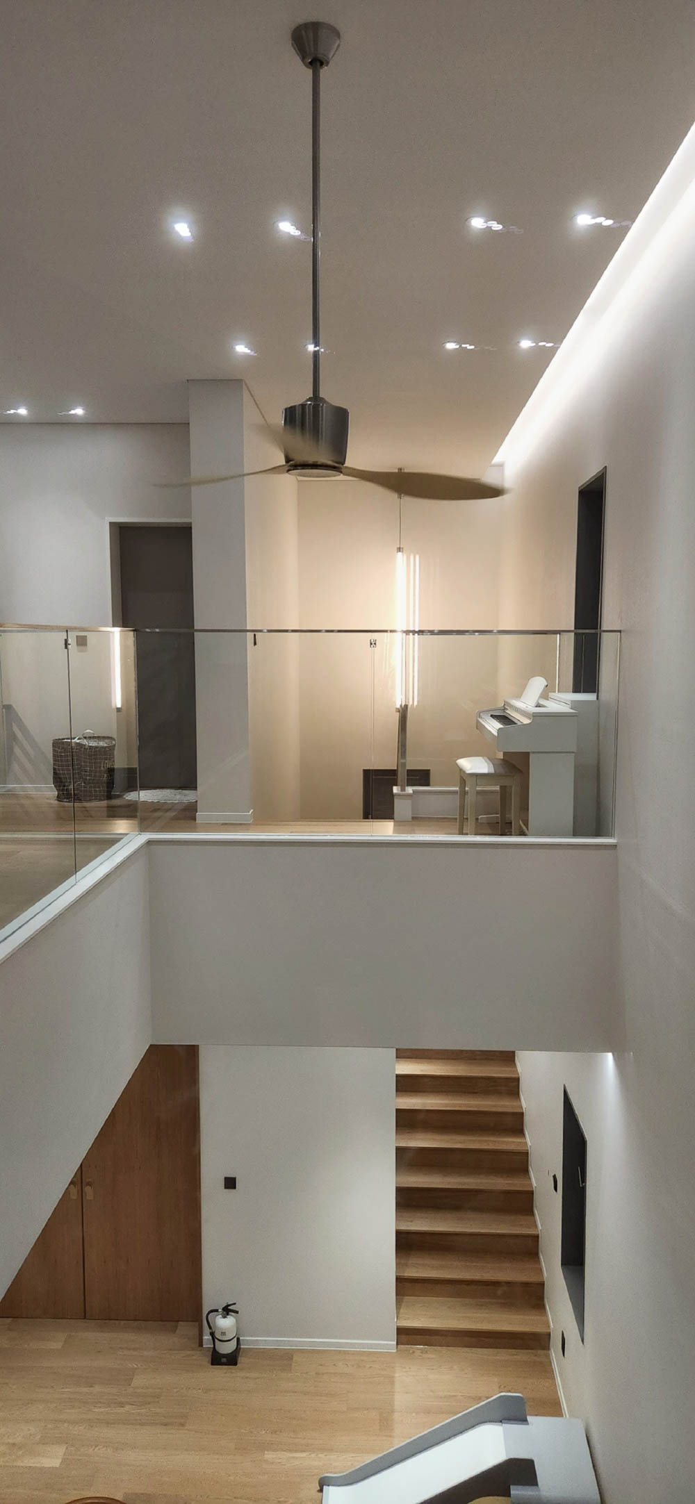 조금은 무겁고 단조로운 외부와 달리 내부로 들어서는 순간 탁 트인 공간이 드러난다. 마치 ‘이상한 나라의 앨리스’의 토끼굴을 지나 만나는 것 같은 공간의 반전은 집에 대한 흥미를 더한다. 현관과 붙어있는 비워진 내부공간은 높은 층고로 집에 들어오면서 느끼는 답답함을 덜어낸다. 또한, 공간을 이동하려면 필연적으로 지나야 하는 공간을 비워내, 가족들이 눈을 맞추고, 손 인사를 하며 소통이 계속해서 이어지도록 했다.