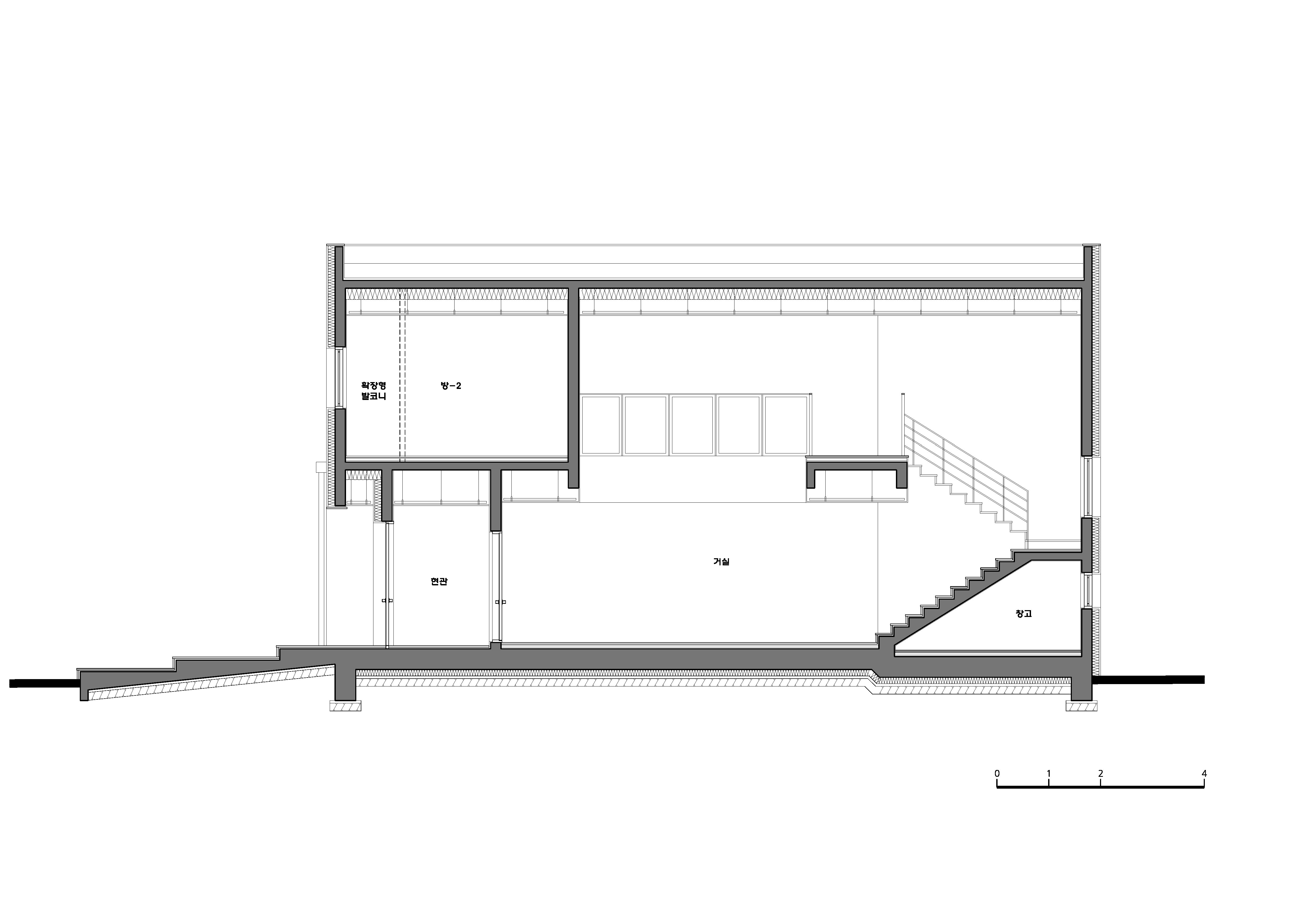 Unlike the slightly heavy and monotonous exterior, the open space is revealed as soon as you enter the interior. The reversal of the space, as if meeting through the rabbit hole in Alice in Wonderland, adds to the interest in the house. The empty interior space attached to the porch relieves the frustration of entering the house with a high floor. In addition, the space that must be passed to move the space was emptied so that the family could make eye contact, greet with hands, and make communication continues.