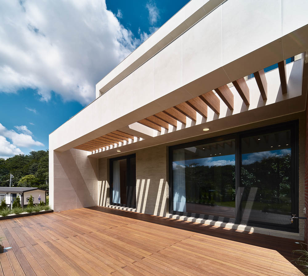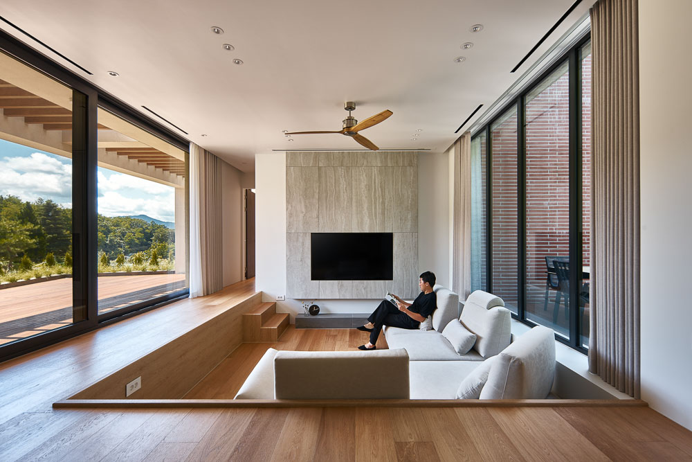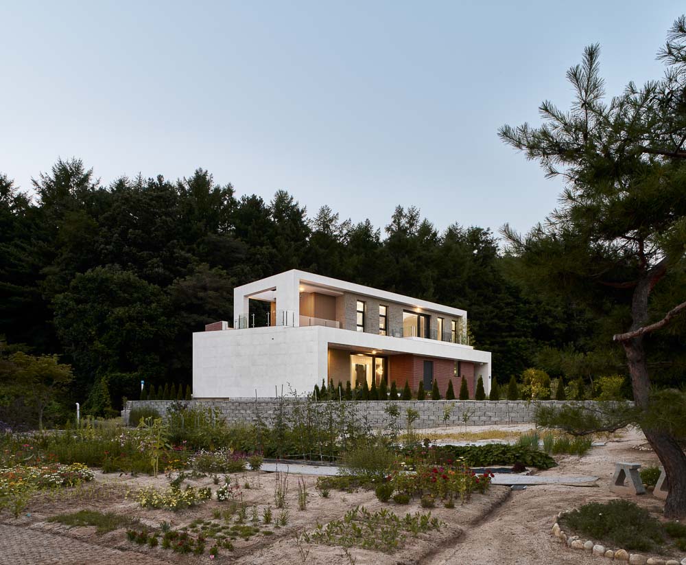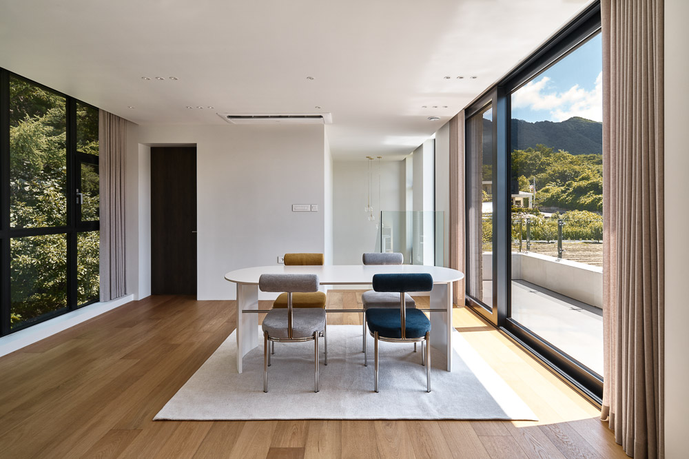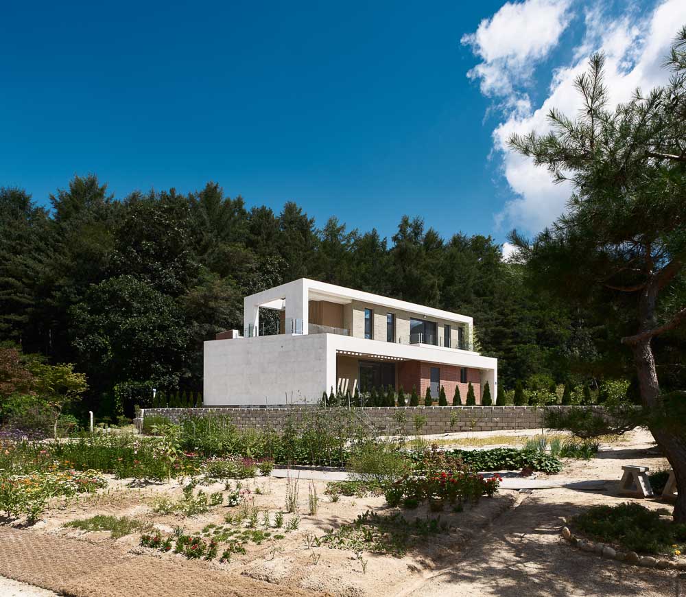 The site was adjacent to the ring road that crosses Chuncheon-si, but it was surrounded by low mountains, giving the client’s family a sense of stability and the south-facing sunlight planted warmth in every corner of the house. The shape of the building is designed to blend in with the surrounding landscape through simple mass and elevation design, avoiding fancy or excessive decorations. It provides a secret view of the main room and bathroom through the gap of the wall twisted diagonally in line with the shape of the earth. The yard in the front actively accepts nature, secures lighting, and communicates with the surroundings over the low vegetation fence. The terrace space on the back, connected to the living room, kitchen, and dining room, becomes a private rest and small group space where you can relate to nature and enjoy relaxation. On the first floor, storage spaces are arranged everywhere at the request of the builder, and the entrance, kitchen-linked grocery storage rooms, and large dress rooms are spaces that embody the minimal life desired by the builder. The living room space, which is connected to the kitchen, and dining, shows a space that can be expanded, and the living room with steps interacts with the front yard and the rear terrace, giving a variety of space and openness. The second floor is a children’s space, reflecting the educational view of the client couple. The large family room is a learning space and play space for children. The window on the back is framed as if the natural scenery changes all year round, and the panoramic view that unfolds in a distant view is drawn into the family room.