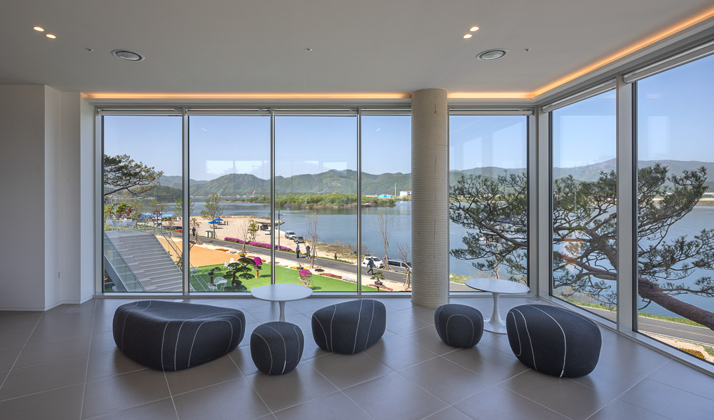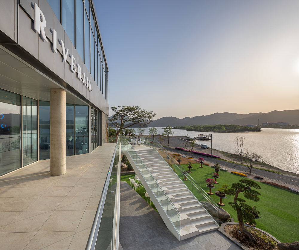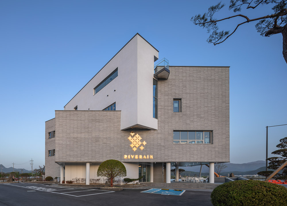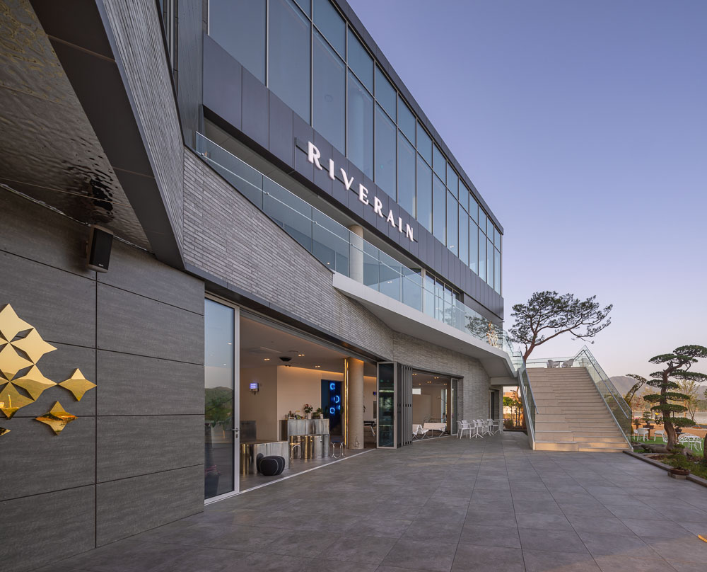 RIVERAIN is standing opposite Uiam Lake. Bongui Mountain is adjacent to the east of the site, Samak Mountain and Legoland to the west, and you can see downtown Chuncheon at a glance to the south. The architect, who wanted to create a space to enjoy the glitter of the sunset falling over the ripple of Uiam Lake while feeling the scenery of Chuncheon, designed it thinking about how people would see it in the space, not the building to be seen by people. This major design orientation made it possible to set the axes of various buildings and to see new landscapes at each intersection. Visitors to RIVERAIN will enjoy the scenery of Uiam Lake, which is approaching like a new scene, whenever they turn their heads while walking through space.