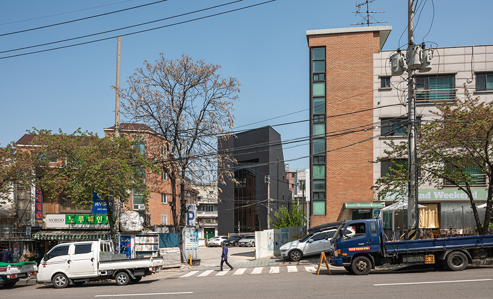 As a long-time resident, the owner of the building had a special affection here, so he asked us to make detailed plans so that the existing residents of the old residence would not be burdened with privacy and other burdens. Someone quietly built a new nest here, which was left empty in an old neighborhood. There is a black building between several old houses consisting of red bricks and gray granite. The building, full of strange feelings that cannot be known whether it was hoped to stand out or whether it was a stranger who came to the wrong place, will give a mysterious feeling with a strong contrast and strong presence compared to the surroundings. Not only the exterior wall, but also the roof tilted by the sun's rays, the curtain wall window opened by the Han River, all of which are black, are reminiscent of a crow. The crow was also called the auspicious sign of direction when it lost its direction in the open sea, so as a subject that evokes the aging atmosphere of this neighborhood, he hoped to draw someone's eyes with a strange atmosphere as if they were standing in a nice tuxedo in the wilderness. Omyo has an artificial sense of proportion that is quite different from the surrounding buildings. The height of the high front and terrace railing design, which are designed to be as sharp as possible within the legal limit, is completely different from the height proportion of a neighborhood full of three-story multi-family houses. In addition, as the material and color of the surface are applied in the same tone as the whole, the black lump, which looks relatively large, is very unfamiliar. The twist doesn't end here. You may think that the interior is vaguely dark following the outside, but in fact, the interior space has a bright atmosphere in contrast to this. The space, which will be used as an office, solves basic indoor lighting by maximizing the open side of the front with a wide electric window extending from the first to fourth floors, while the adjacent building is planned to minimize privacy infringement with existing residents.