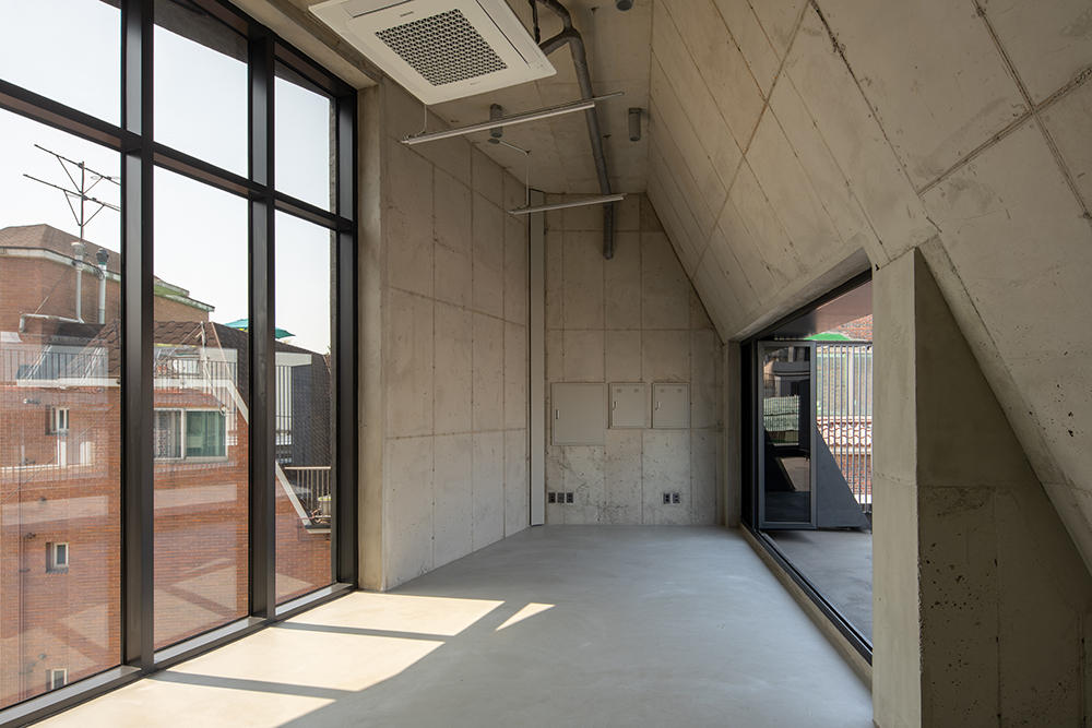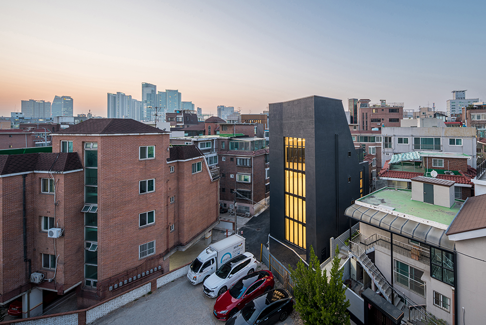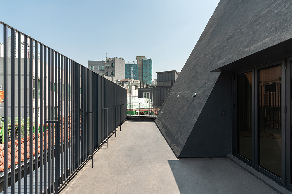 As a long-time resident, the owner of the building had a special affection here, so he asked us to make detailed plans so that the existing residents of the old residence would not be burdened with privacy and other burdens. Someone quietly built a new nest here, which was left empty in an old neighborhood. There is a black building between several old houses consisting of red bricks and gray granite. The building, full of strange feelings that cannot be known whether it was hoped to stand out or whether it was a stranger who came to the wrong place, will give a mysterious feeling with a strong contrast and strong presence compared to the surroundings. Not only the exterior wall, but also the roof tilted by the sun's rays, the curtain wall window opened by the Han River, all of which are black, are reminiscent of a crow. The crow was also called the auspicious sign of direction when it lost its direction in the open sea, so as a subject that evokes the aging atmosphere of this neighborhood, he hoped to draw someone's eyes with a strange atmosphere as if they were standing in a nice tuxedo in the wilderness. Omyo has an artificial sense of proportion that is quite different from the surrounding buildings. The height of the high front and terrace railing design, which are designed to be as sharp as possible within the legal limit, is completely different from the height proportion of a neighborhood full of three-story multi-family houses. In addition, as the material and color of the surface are applied in the same tone as the whole, the black lump, which looks relatively large, is very unfamiliar. The twist doesn't end here. You may think that the interior is vaguely dark following the outside, but in fact, the interior space has a bright atmosphere in contrast to this. The space, which will be used as an office, solves basic indoor lighting by maximizing the open side of the front with a wide electric window extending from the first to fourth floors, while the adjacent building is planned to minimize privacy infringement with existing residents.
