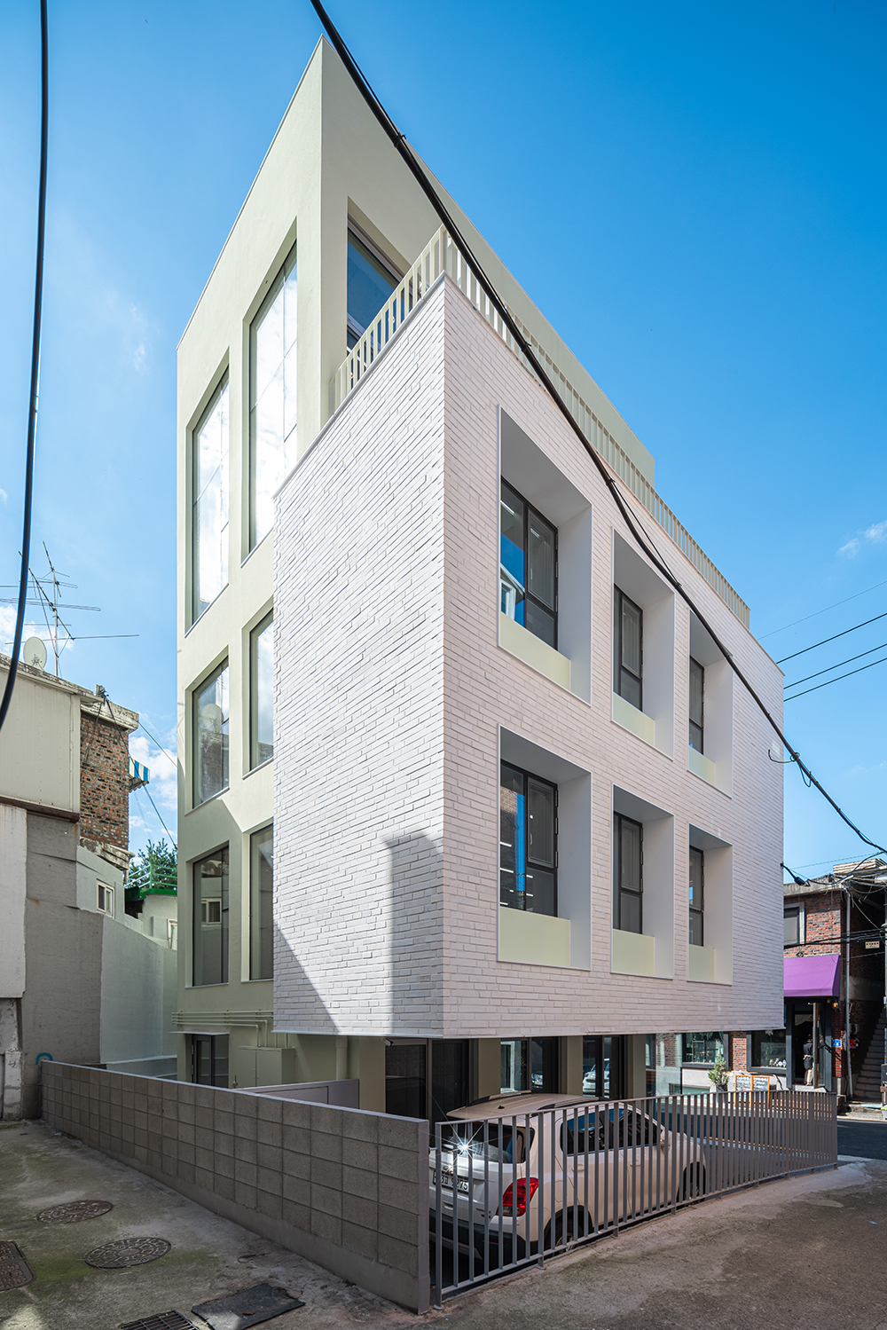 It may be natural, but they could not transplant the emotions they felt in Paris into Dangin-dong. The modern interpretation, persuaded after a long period of consideration, was to emphasize the regular arrangement of pillars and windows, which are characteristic of old brick house buildings. In this way, concrete pillars were surrounded by the frame of the building at regular intervals and exposed to the surface, thereby simplifying the internal structure to secure a relatively large rental space. Such a structure naturally creates a grid of columns and slabs, and for more neat and tidier look, a regular pattern was constructed by adding walls. Since the complex and irregular alignment of the old neighborhood is the background, the facade of the new building to be built is arranged, the decoration is minimized, and a clear contrast is achieved with simple repetition of windows. In particular, the second and third floors are made of white bricks, which are the same material as the surrounding buildings, but they feel like a lump, and the eyes are naturally looked up. The fourth floor is designed to replace the continuous pattern of the grid in the form of a column, making the building look larger and giving it a special sense of space that only the space has, linked to the terrace.