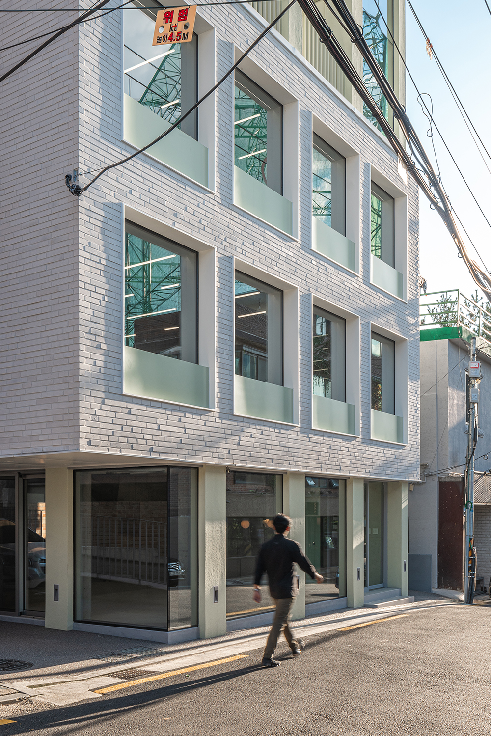 당연한 이야기겠지만 무작정 그들이 파리에서 느꼈던 감성 그대로 당인동에 이식할 수 없었다. 나름 오랜 고민 끝에 설득한 현대적인 해석은 옛 벽돌집 건축물의 특징인 규칙적인 기둥과 창의 배열을 좀 더 강조시키는 것이었다. 그렇게 콘크리트 기둥을 일정한 간격으로 건축물 테두리를 따라 둘러 입면으로 노출되게 하여, 내부의 구조를 단순화하여 비교적 넓은 임대공간을 확보했다. 그러한 구조로 자연스럽게 기둥과 슬라브로 그리드가 만들어지고, 좀 더 반듯하고 정갈한 느낌을 위해 벽을 덧대어 규칙적인 패턴을 구성하였다. 오래된 동네의 복잡하고 불규칙한 선형이 배경이 되므로, 새롭게 들어설 건축물의 면을 정돈하고 장식은 최소화하면서 단순한 창의 반복으로 분명한 대비를 이루도록 만들었다. 특히 2, 3층은 백색 벽돌로 주변 건축물과 동일한 재료지만 하나의 덩어리라는 느낌을 주며 시선은 자연스럽게 위를 바라보도록 만들었다. 4층은 그리드의 연속적 패턴이 열주의 형태로 치환되며 건축물이 더 커 보이게 하고 테라스와 연계된, 그 공간만이 갖는 특별한 공간감을 부여하도록 설계했다.