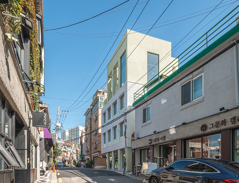 Above all, the characteristic of Lime-Rhyme is its bold use of lime colors. I think it was acceptable because there were colorful walls in the emotions and memories of the clients I felt in the alley in Paris. A fresh newbie appeared in the cracks of old and dull brick buildings in the alley, which had not been newly built for nearly 20 years. Although it is somewhat intense, such energy and vitality also cause a new wind to blow up in Dangin-dong, an old neighborhood. It is fortunate that the old residents of the alley are already welcoming and paying attention to Newbie, contrary to our concerns.