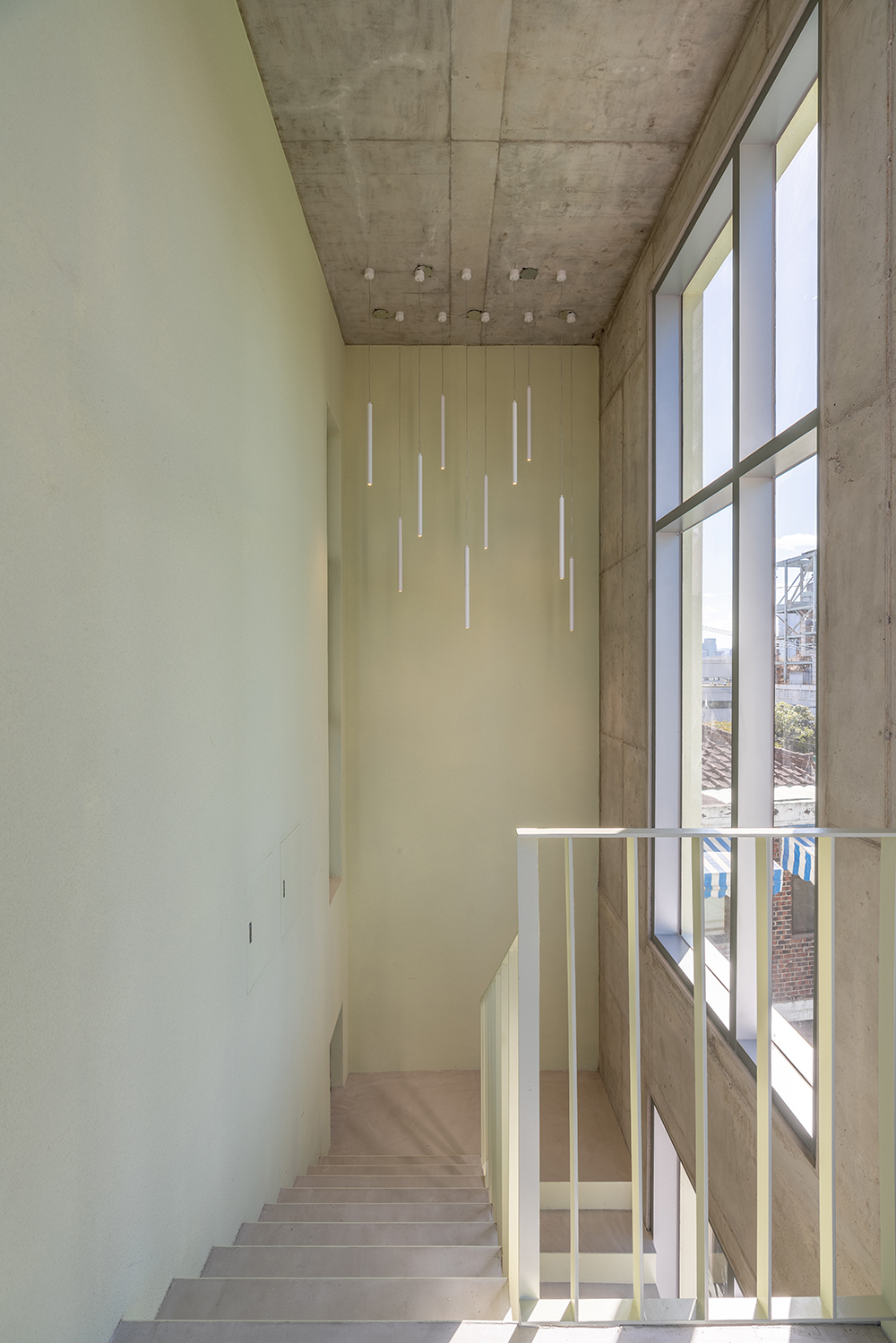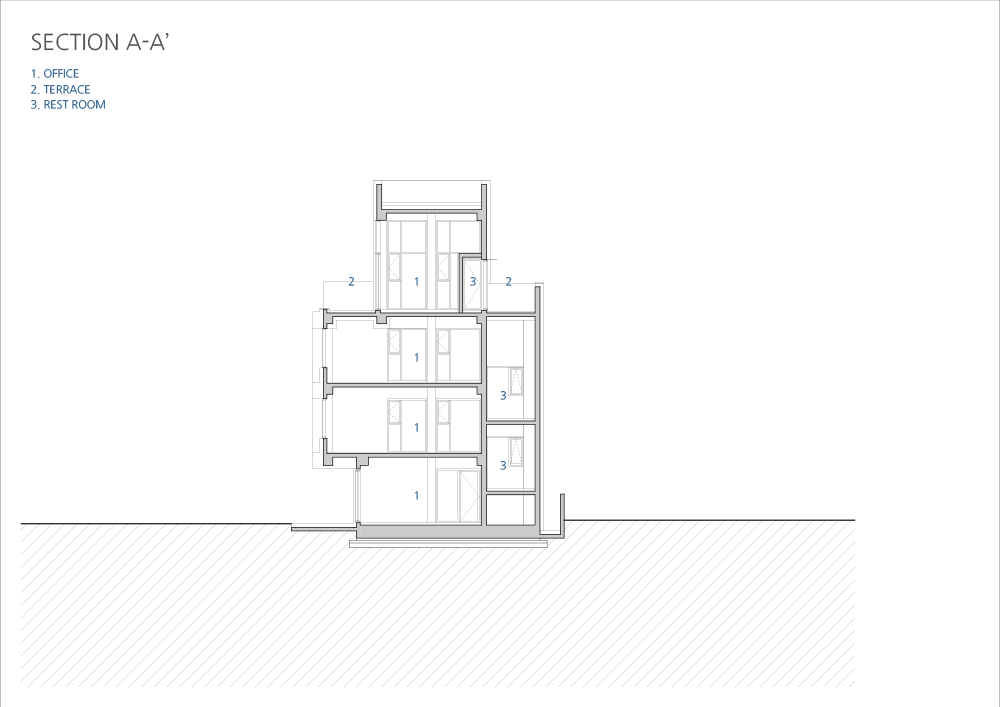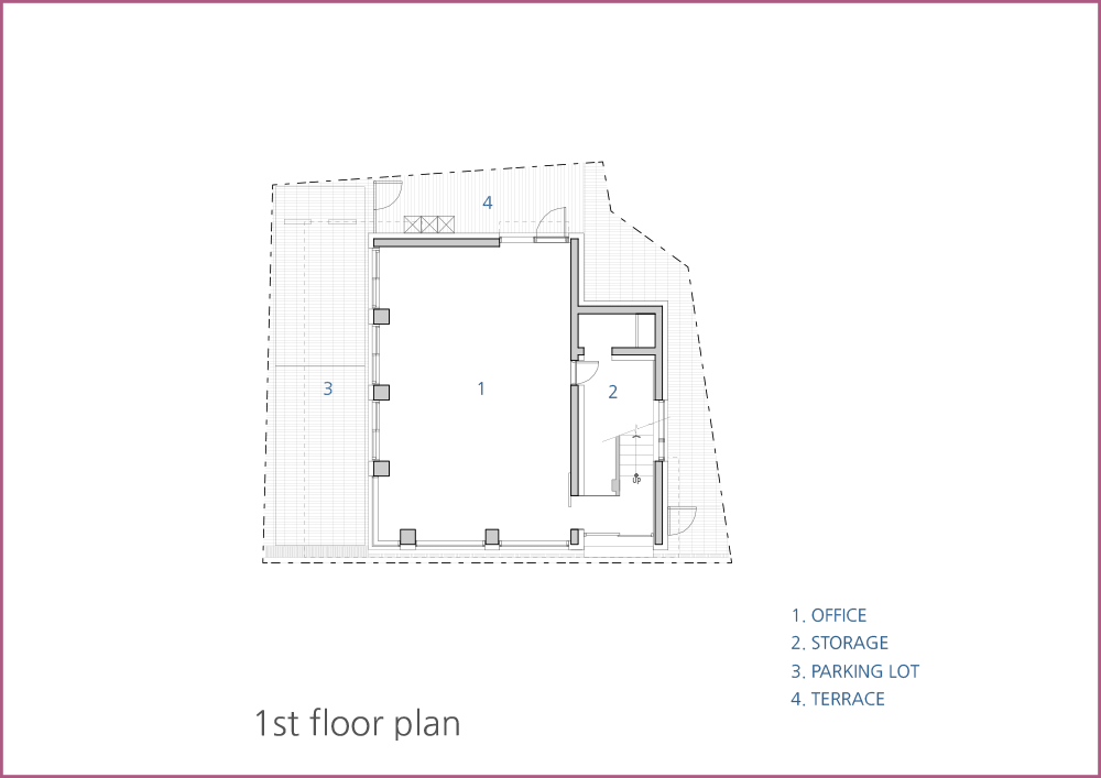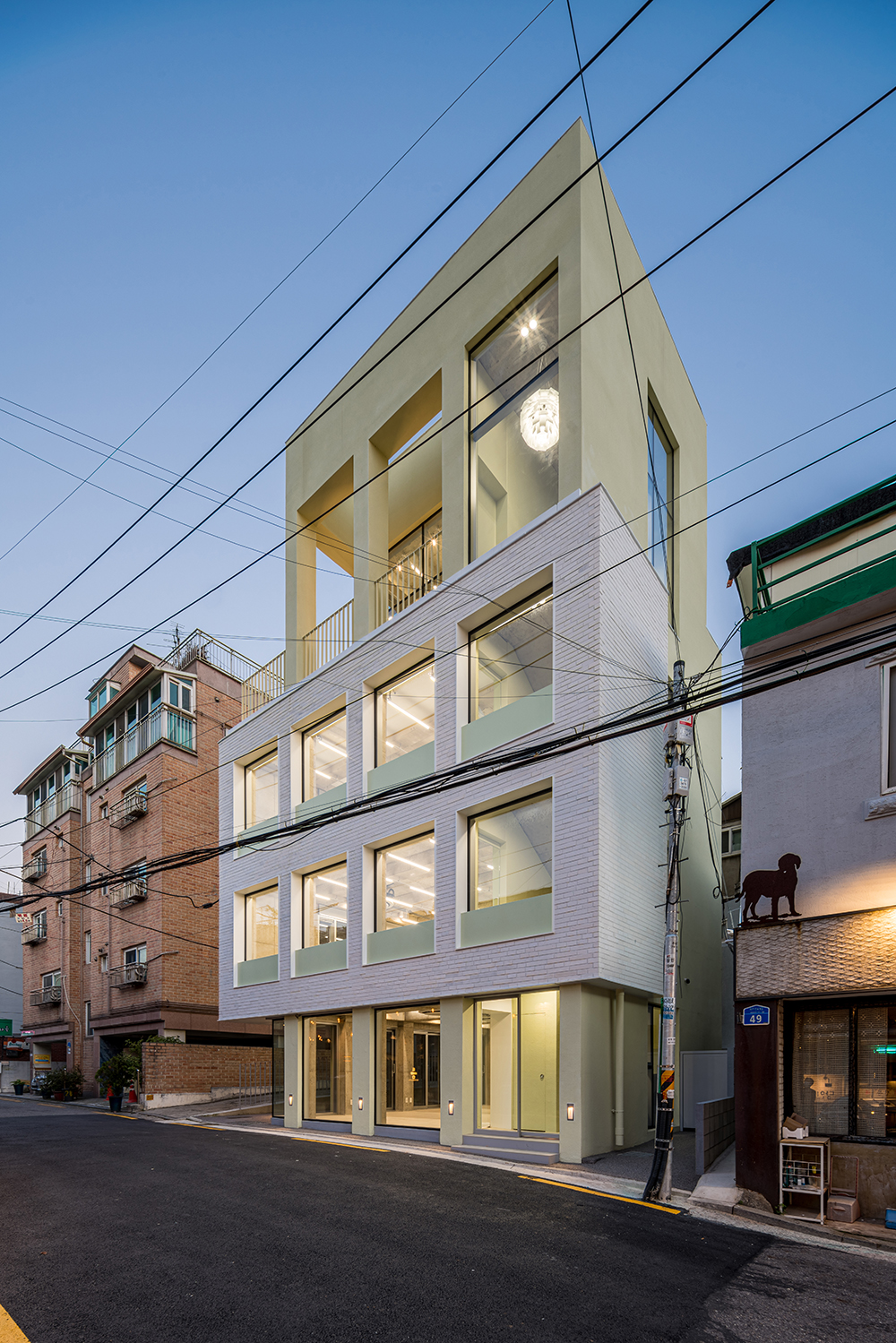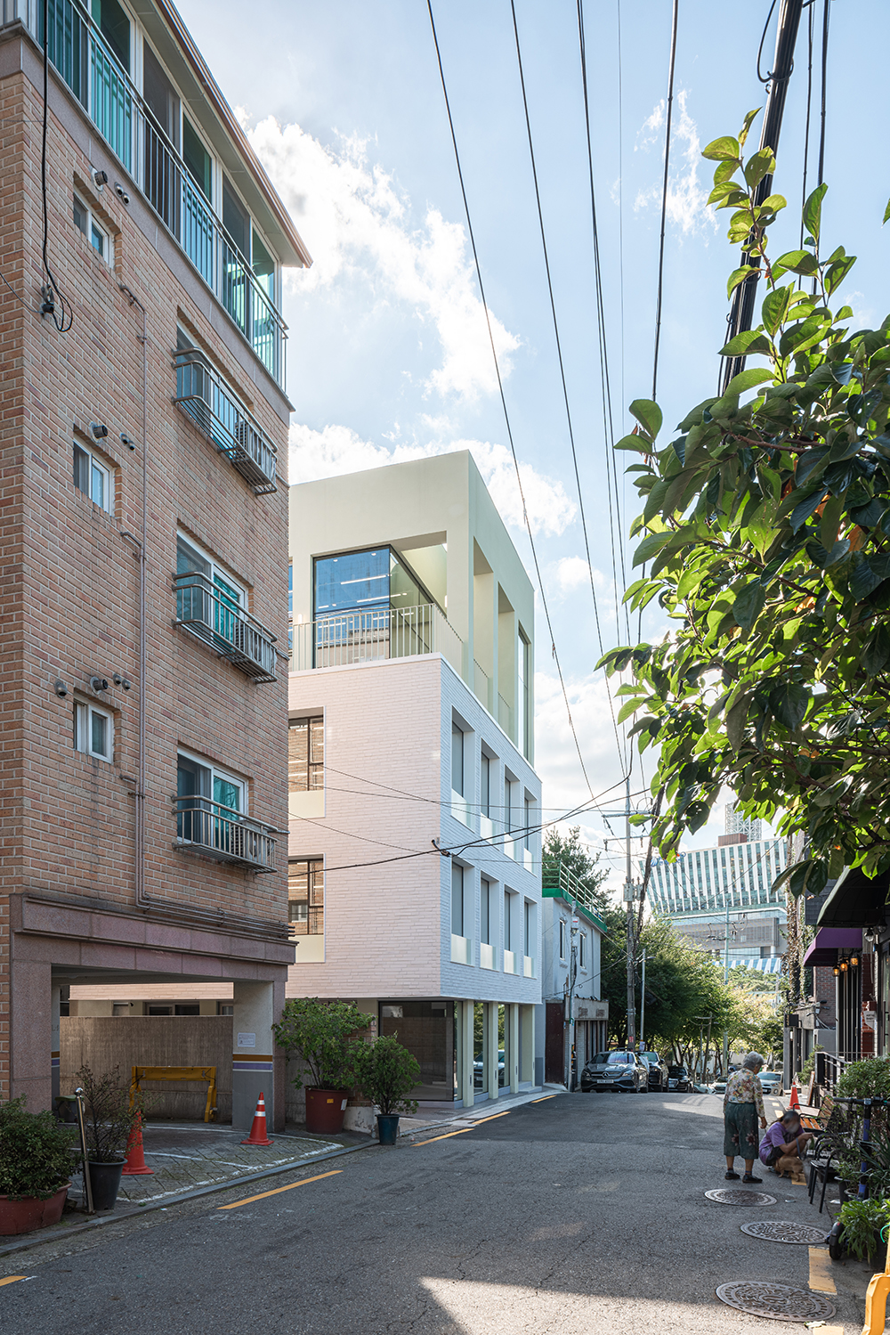 당연한 이야기겠지만 무작정 그들이 파리에서 느꼈던 감성 그대로 당인동에 이식할 수 없었다. 나름 오랜 고민 끝에 설득한 현대적인 해석은 옛 벽돌집 건축물의 특징인 규칙적인 기둥과 창의 배열을 좀 더 강조시키는 것이었다. 그렇게 콘크리트 기둥을 일정한 간격으로 건축물 테두리를 따라 둘러 입면으로 노출되게 하여, 내부의 구조를 단순화하여 비교적 넓은 임대공간을 확보했다. 그러한 구조로 자연스럽게 기둥과 슬라브로 그리드가 만들어지고, 좀 더 반듯하고 정갈한 느낌을 위해 벽을 덧대어 규칙적인 패턴을 구성하였다. 오래된 동네의 복잡하고 불규칙한 선형이 배경이 되므로, 새롭게 들어설 건축물의 면을 정돈하고 장식은 최소화하면서 단순한 창의 반복으로 분명한 대비를 이루도록 만들었다. 특히 2, 3층은 백색 벽돌로 주변 건축물과 동일한 재료지만 하나의 덩어리라는 느낌을 주며 시선은 자연스럽게 위를 바라보도록 만들었다. 4층은 그리드의 연속적 패턴이 열주의 형태로 치환되며 건축물이 더 커 보이게 하고 테라스와 연계된, 그 공간만이 갖는 특별한 공간감을 부여하도록 설계했다.