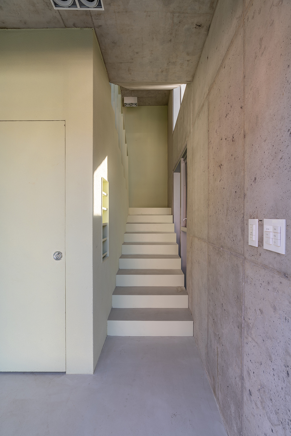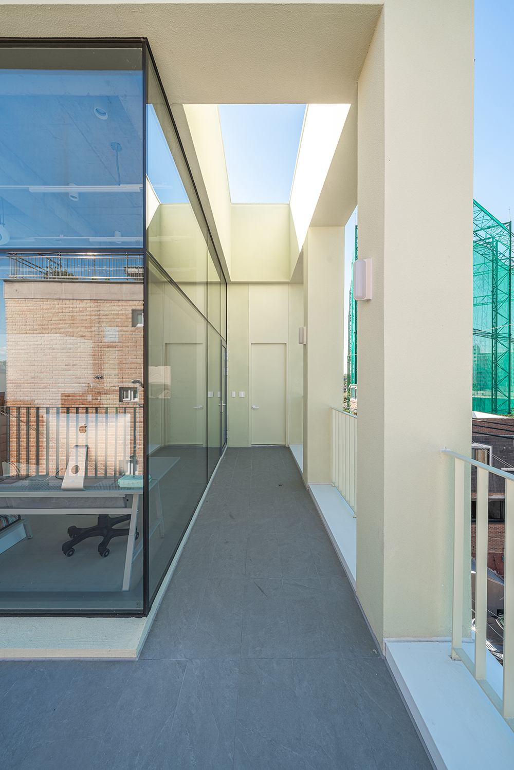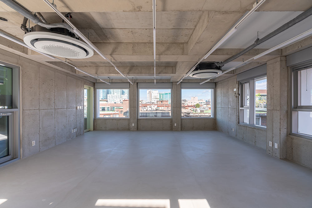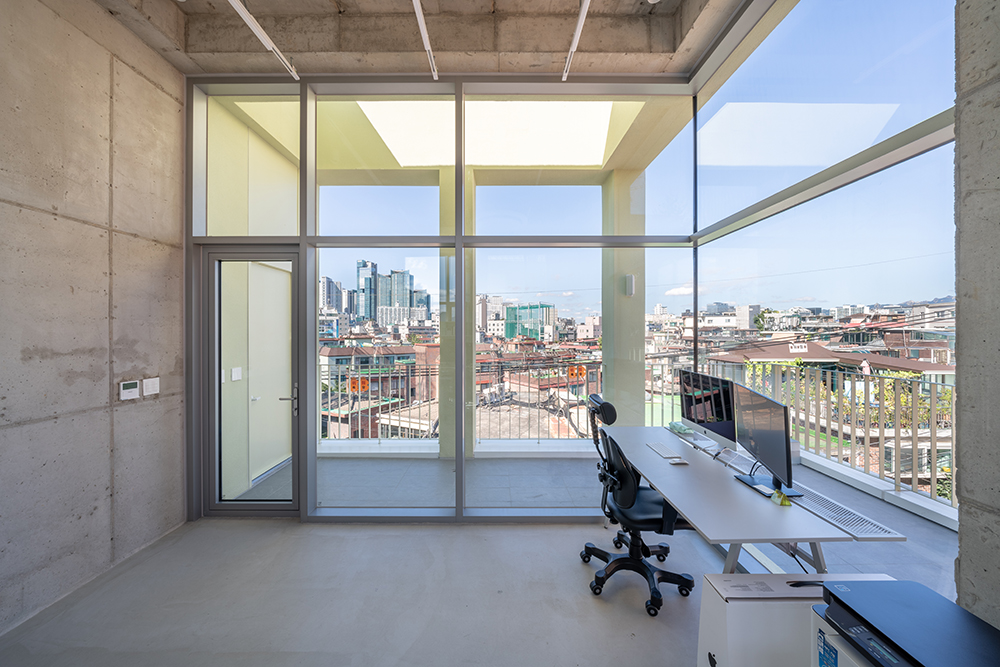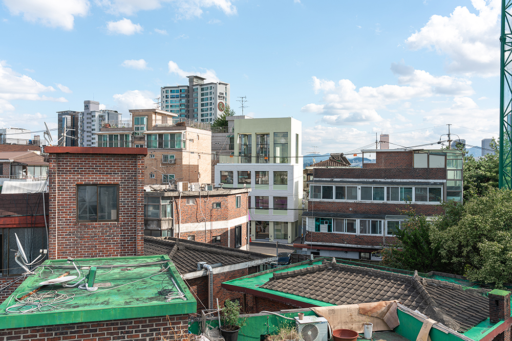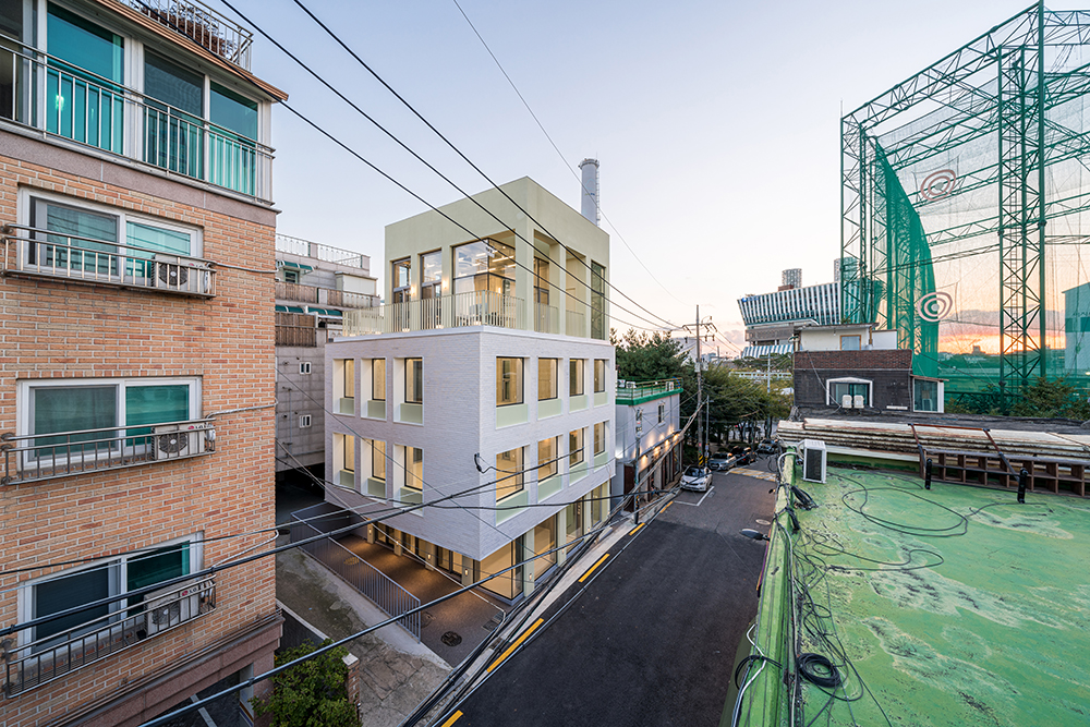 It may be natural, but they could not transplant the emotions they felt in Paris into Dangin-dong. The modern interpretation, persuaded after a long period of consideration, was to emphasize the regular arrangement of pillars and windows, which are characteristic of old brick house buildings. In this way, concrete pillars were surrounded by the frame of the building at regular intervals and exposed to the surface, thereby simplifying the internal structure to secure a relatively large rental space. Such a structure naturally creates a grid of columns and slabs, and for more neat and tidier look, a regular pattern was constructed by adding walls. Since the complex and irregular alignment of the old neighborhood is the background, the facade of the new building to be built is arranged, the decoration is minimized, and a clear contrast is achieved with simple repetition of windows. In particular, the second and third floors are made of white bricks, which are the same material as the surrounding buildings, but they feel like a lump, and the eyes are naturally looked up. The fourth floor is designed to replace the continuous pattern of the grid in the form of a column, making the building look larger and giving it a special sense of space that only the space has, linked to the terrace.