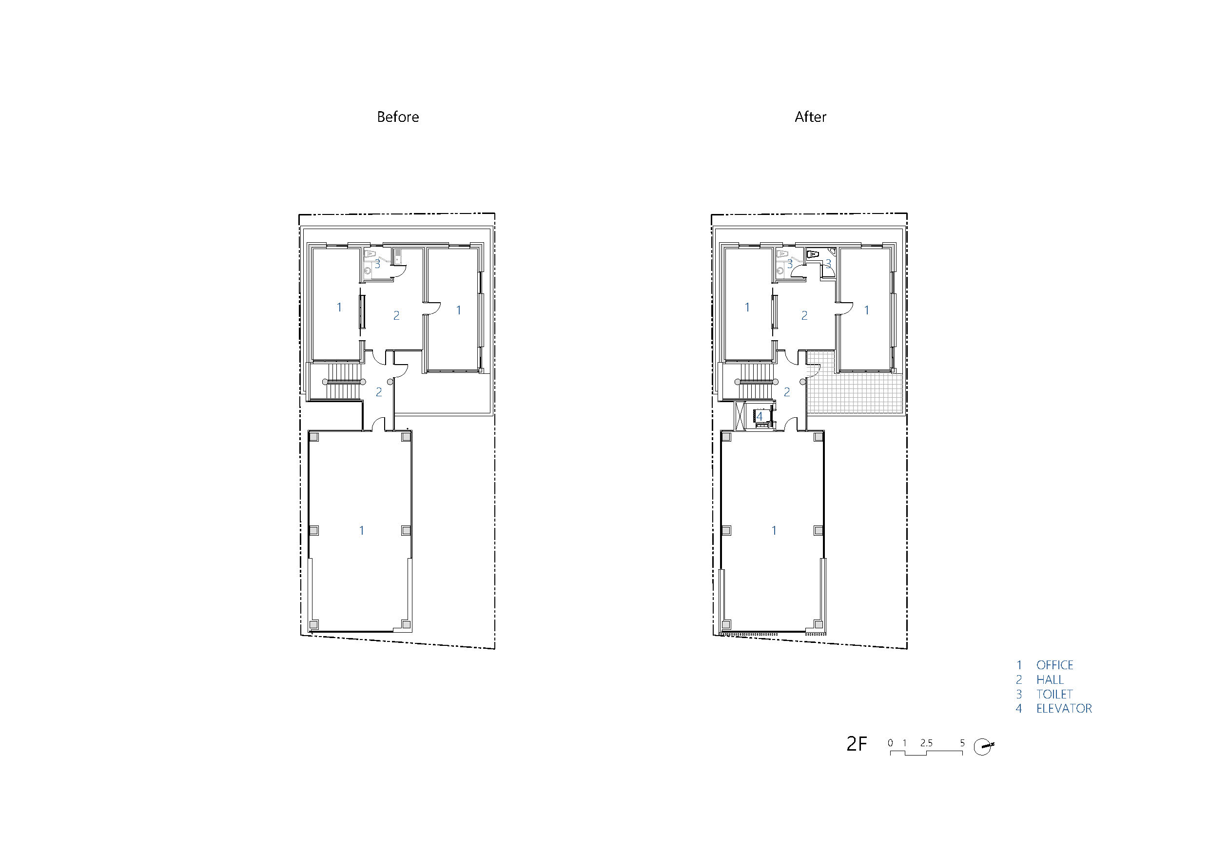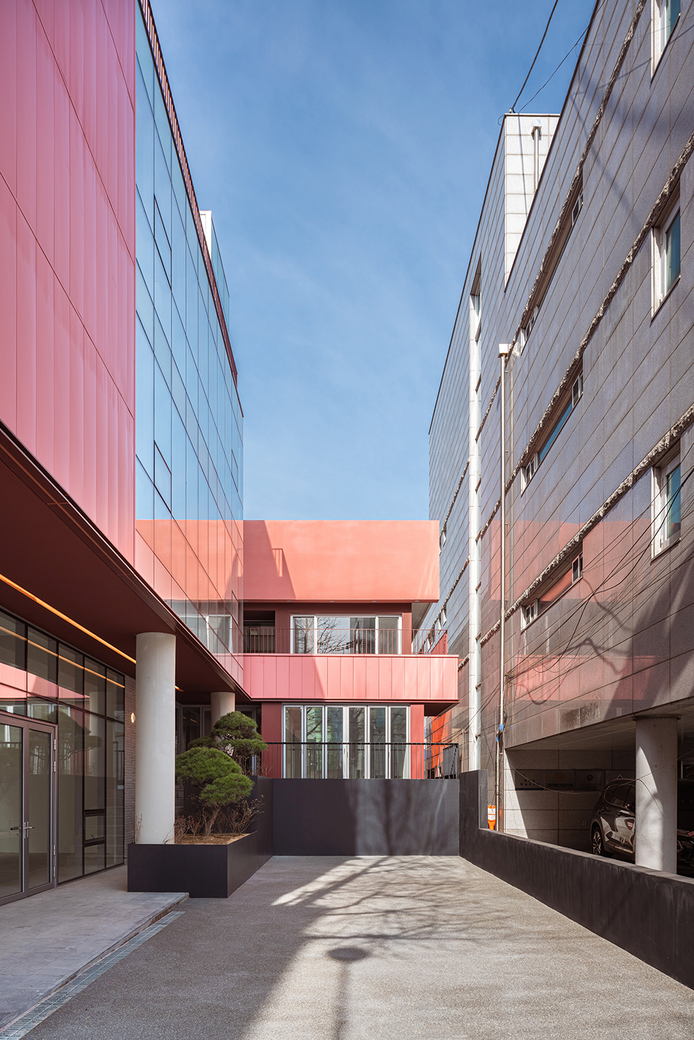 The efforts to revitalize this street at any rate seemed to have been going on for a long while besides ours. The building on the left has the yellow wall, and the building on the right has the blue window. What is left out in this place full of all kinds of colors from blue sky to the green leaves of the tree in front of the building is definitely the color of red. We proposed to the client that we should actively use the sense of 'tone-on-tone', and boldly painted colors. As the most feasible way to respond to the street in terms of business, we thought of relocating the existing piloti parking lot to the outdoor place, then expanding the remaining space and building a new elevator. Given that it is highly likely each floor is separately rented out due to the nature of the size of the building and the nature of the street, the locations of the elevator and the lobby were arranged closest to the staircase located in the rear side of the building.