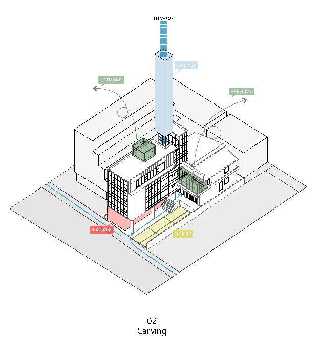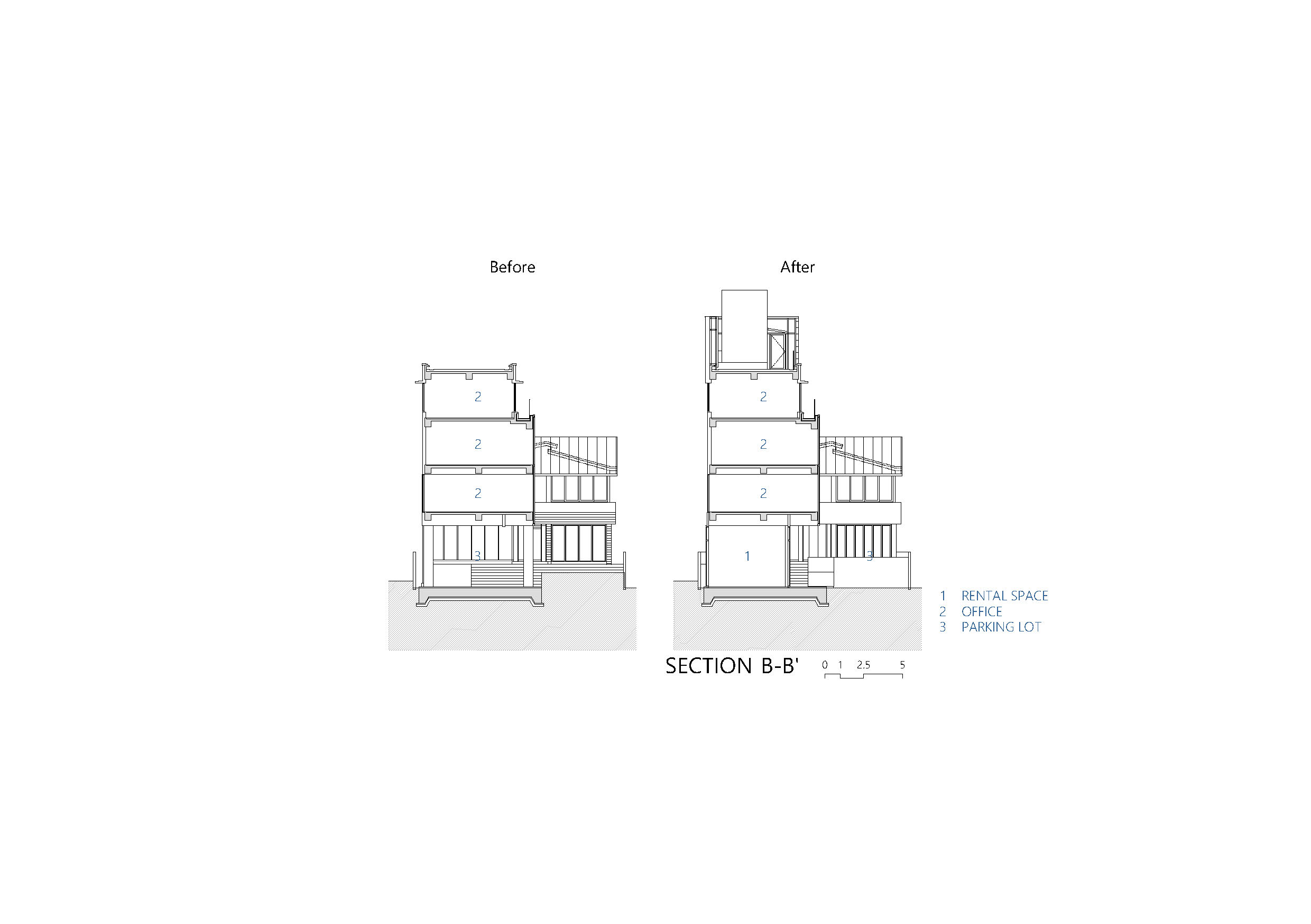 클라이언트는 주변 동네의 오랜 시간 때 묻은 분위기를 쇄신하고자 무엇보다 건축물이 돋보이길 원했다. 과거의 여러 번의 용도변경과 건축물 증축을 하였음에도 불구하고 이번에도 신축이 아닌 대수선을 요청하는 바로는 이 땅의 역사를 존중하려는 남다른 애정이 있었던 것 같다. 억겁의 세월 동안 묻어져 있던 것을 다듬고 깎아낸 노력 끝에 발견해 낸 암염과 같은 귀중한 느낌이면 좋겠다고 생각했다.