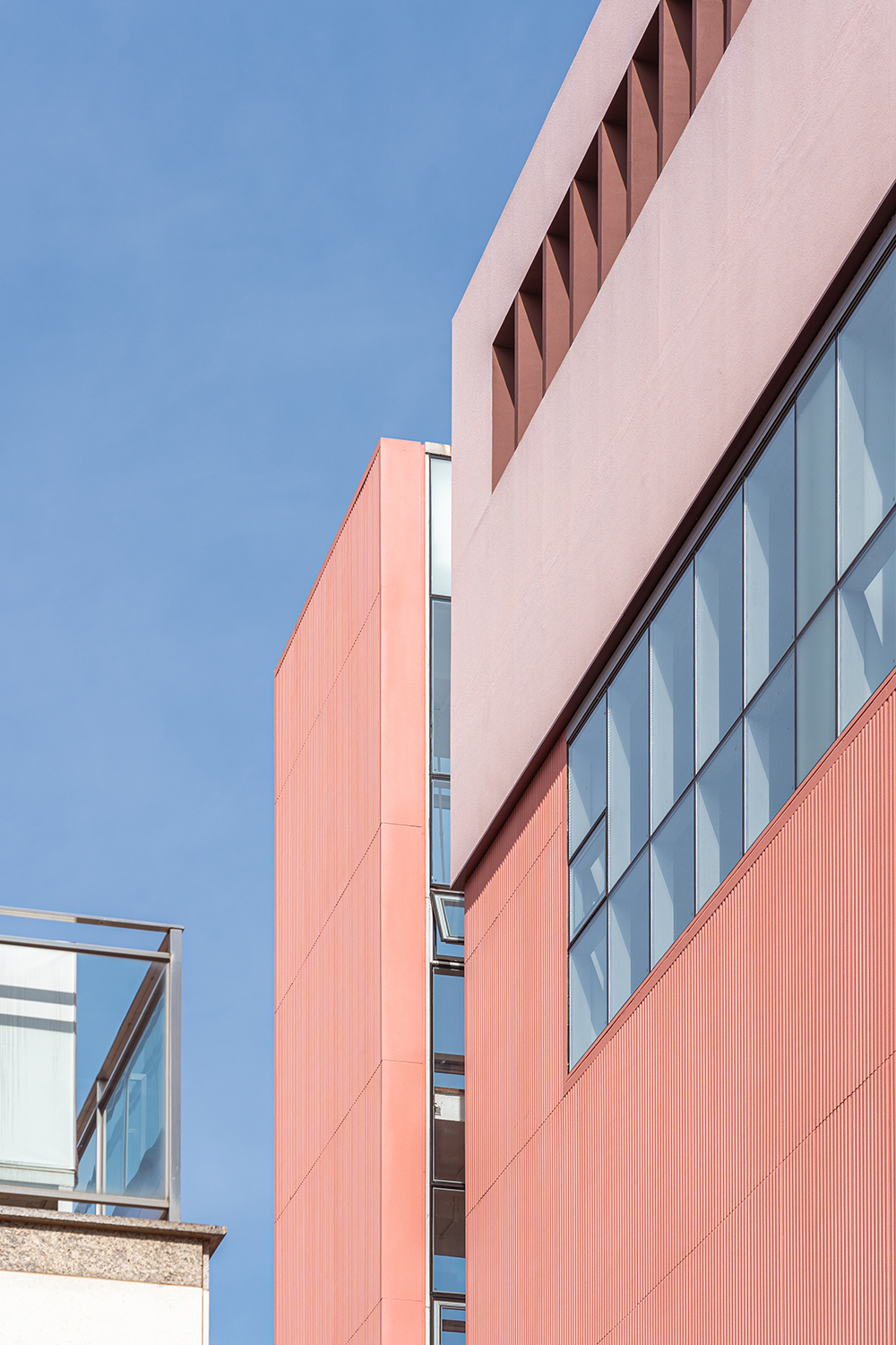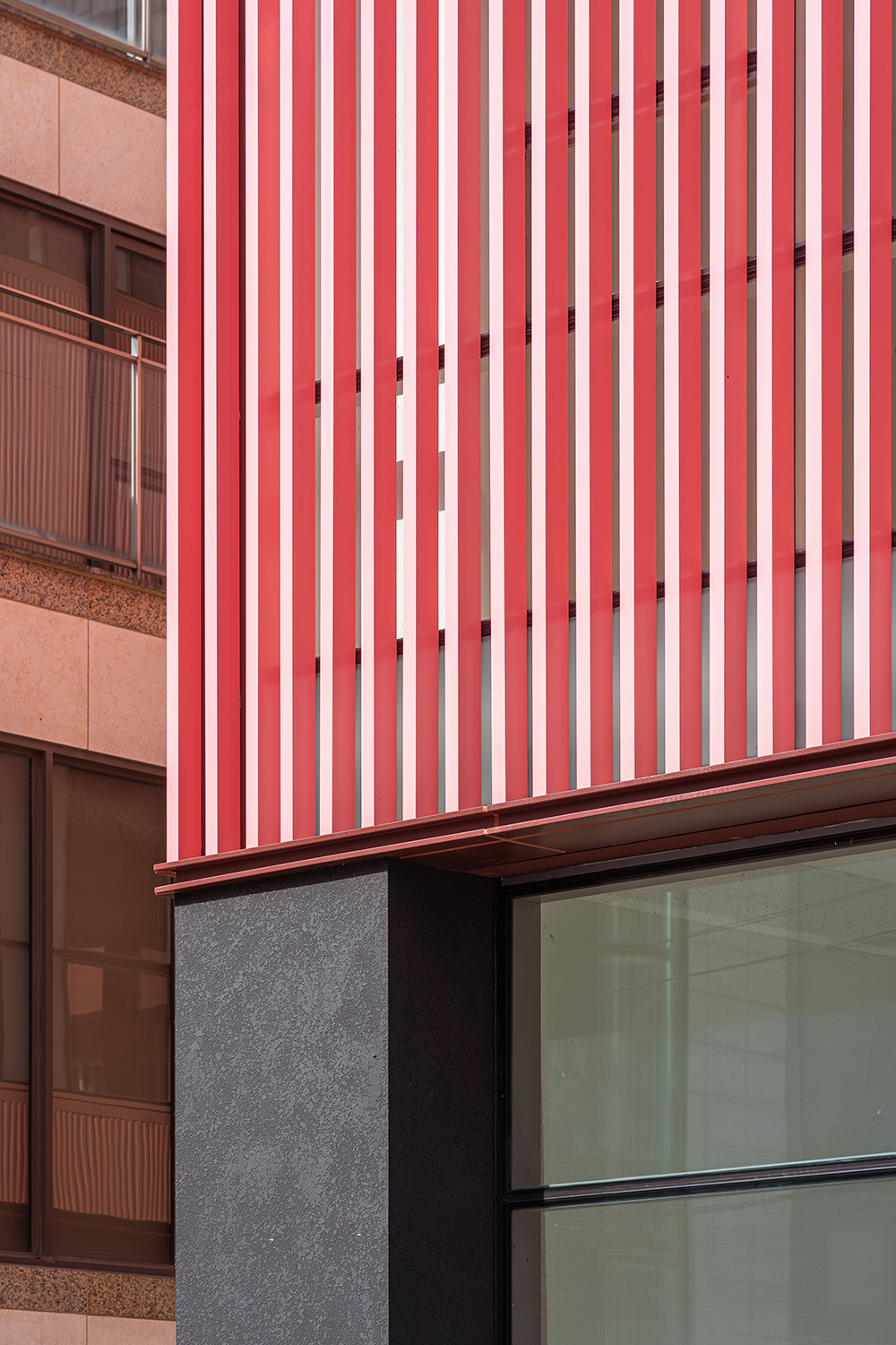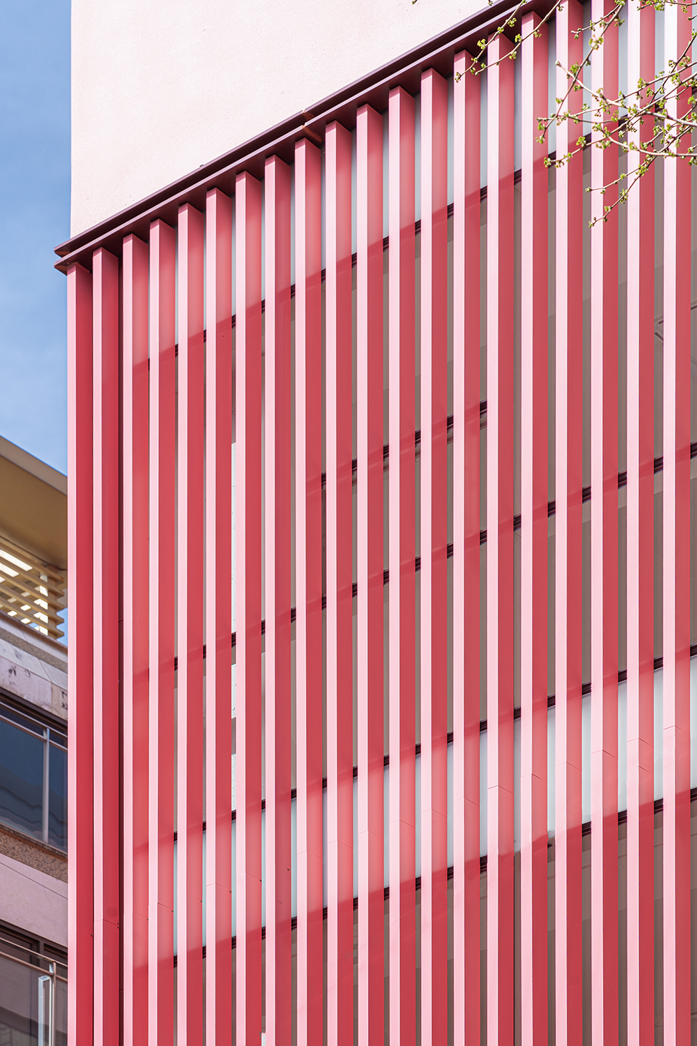 For this reason, it was necessary to arrange the location of the main entrance to the building delicately so that there was no loss or interference in the 1st floor space for rent. The composition of lines and surfaces based on the thickness and spacing of the lines and the depth that may be seen as a surface depending on the angle of the louver reminds us of pink halite. We hope that the Halite Platz will make a complementary color contrast with the green trees and blue sky on a sunny summer day, and matches the yellow leaves and white snow, thus contributing to a more active street as a lively organism wherever it is viewed from.