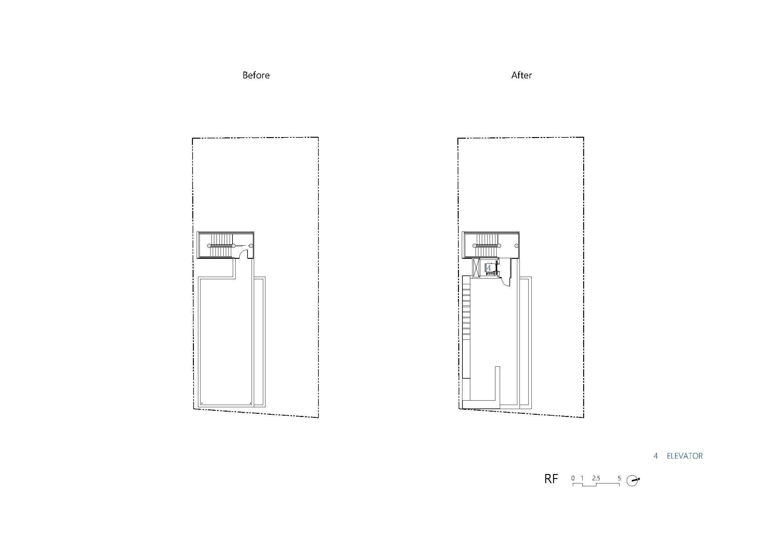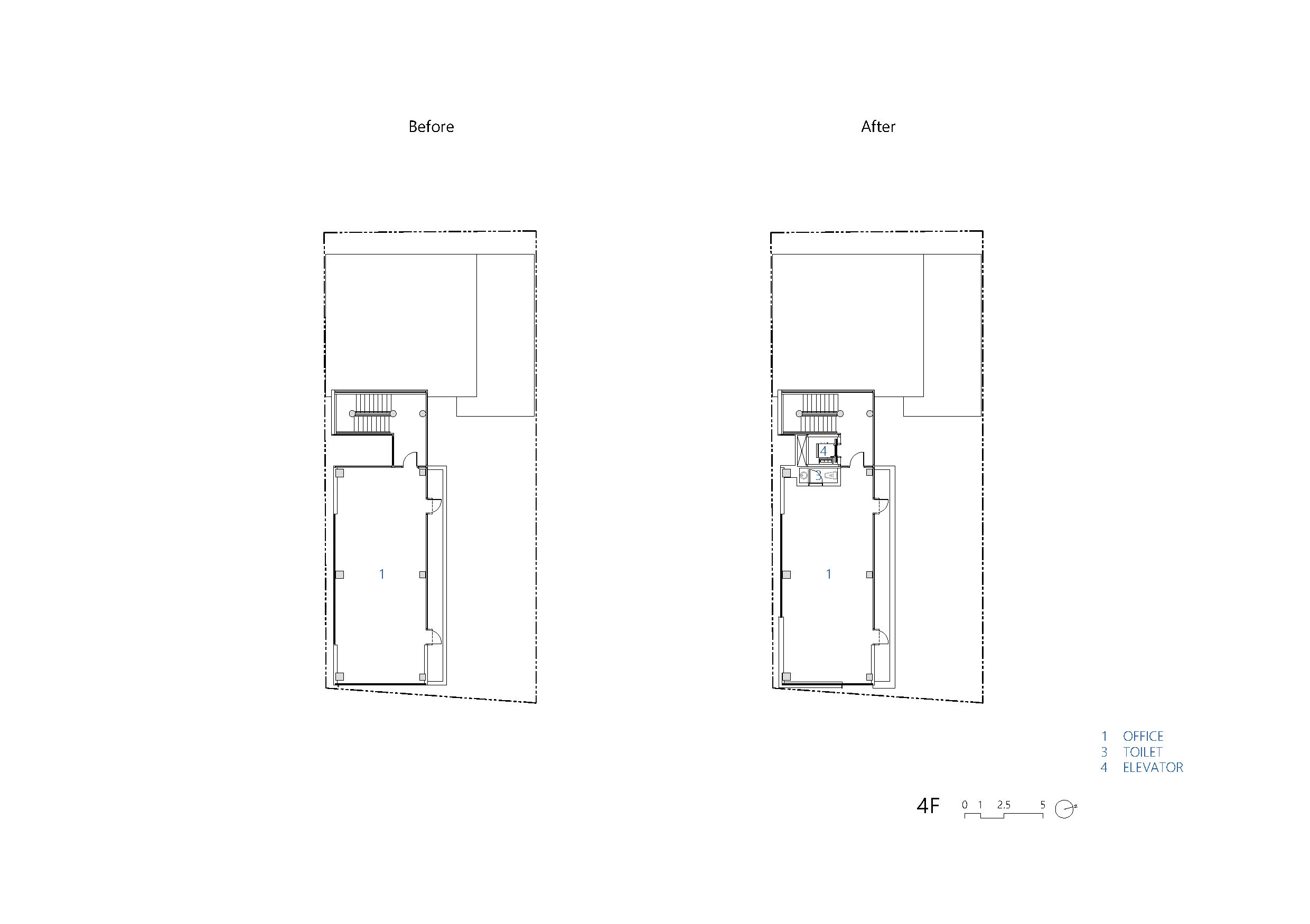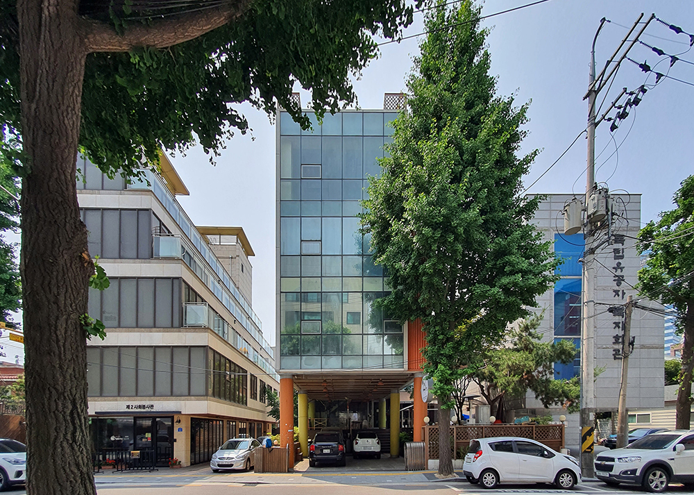 The efforts to revitalize this street at any rate seemed to have been going on for a long while besides ours. The building on the left has the yellow wall, and the building on the right has the blue window. What is left out in this place full of all kinds of colors from blue sky to the green leaves of the tree in front of the building is definitely the color of red. We proposed to the client that we should actively use the sense of 'tone-on-tone', and boldly painted colors. As the most feasible way to respond to the street in terms of business, we thought of relocating the existing piloti parking lot to the outdoor place, then expanding the remaining space and building a new elevator. Given that it is highly likely each floor is separately rented out due to the nature of the size of the building and the nature of the street, the locations of the elevator and the lobby were arranged closest to the staircase located in the rear side of the building.
