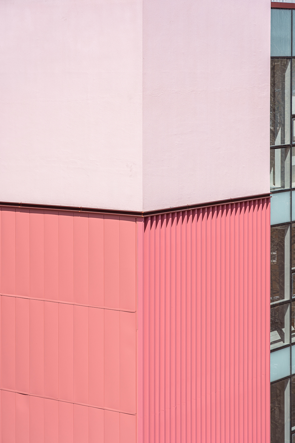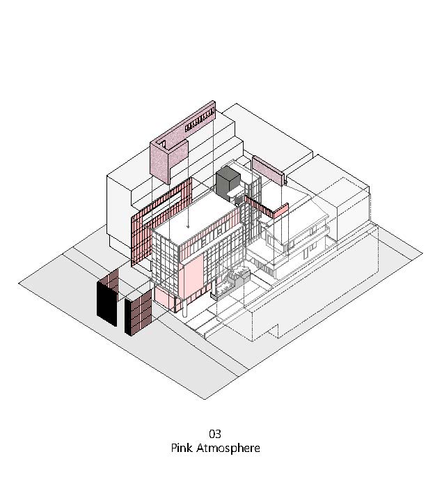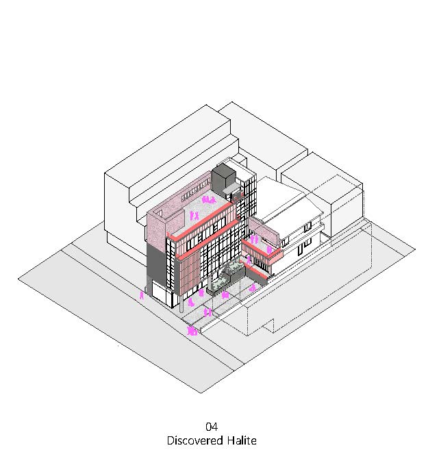 이 거리를 어떻게든 활성화하려는 노력이 우리 말고도 오랫동안 지속되었나 보다. 좌측 건물은 노란색 벽, 우측 건물은 파란색 창. 파란 하늘과 건축물 앞 푸른 나뭇잎까지 온갖 색이 가득한 이곳에 남겨진 것은 단연 붉은 기운이 있는 색이었다. 존재감을 드러내고 좀 더 입체감을 표현하기 위해서는 톤온톤(Tone-on-tone)의 감각을 적극적으로 사용하는 것으로 클라이언트에게 제안, 과감하게 칠을 해 나갔다. 우리는 가로에 대응하는 가장 사업성 높은 방법으로서 기존 필로티 주차장을 옥외로 위치 이동시키고, 대신에 그 공간을 증축하는 것과 엘리베이터를 새롭게 설치했다. 건축물 규모 및 가로의 특성상 각 층 따로 임대를 둘 가능성이 크다는 것을 감안하여 엘리베이터 및 로비의 위치를 기존의 건축물 후면 계단실과 최대한 가까운 곳에 배치했고, 건축물로 진입하는 주 출입구의 위치를 1층 임대공간의 손실 및 간섭이 없도록 해야 했다. 선의 두께감과 간격, 루버의 각도에 따라 면으로 보일 수 있는 깊이를 바탕으로 한 선과 면의 컴포지션은 마치 핑크색 암염(Halite)이 떠오른다. 하라이트 플라츠는 화창한 여름날 푸른 나무와 파란 하늘로 보색대비를 이루고, 노란 낙엽과 하얀 눈발에도 어울리는 생동감 넘치는 유기체로, 좀 더 활발한 가로를 만드는 데 보탬이 되길 희망한다.