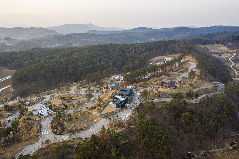 The house is located in a village built by long-time acquaintances who shared the will to differentiate it from general rural housing complexes. Villagers set their own rules, and there was an internal examination process for the height of the building, the area and location of the window, the facade material, the height and composition of the fence, the landscaping and the green area. There were strict conditions in which construction could only be carried out only after passing these rules. The planned site was located in a place where the terrain of Gyeryongsan Mountain range from the south and complex ridges intersect, so there were severe restrictions on the height of the building in order to preserve the flow.
