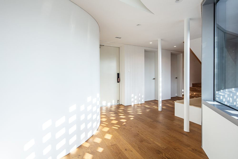 땅의 형상은 남측 방향의 쐐기형이었다. 넓은 공간을 쓸 수 있는 북측으로 건축물 배치를 해야만 했는데, 북측 대지의 3.6m 옹벽이 자리하고 있는 관계로 1층 북측의 채광이 좋지 않았고, 주차장과 주방 및 다용도실을 배치했다. 동쪽에는 마을의 주도로가 있어, 프라이버시 방해에 대한 우려가 컸다. 다행히 서측은 능선이 살짝 솟아 올라왔다가 급경사로 이어져 있어 특별한 방해 없이 자연 조망이 가능했기에 그렇게 동쪽의 도로 쪽을 등진 ㄱ자 형태로 건축물을 배치, 반대편 능선과 연계하여 오목한 공간을 만들었다. 이는 ㄷ자 전통가옥처럼 작은 마당을 둘 수 있게 되어, 그 마당에 연계되는 거실을 연이어 배치할 수 있었다. 가족의 단합과 화합을 중요하게 생각했던 클라이언트는 그들 대부분의 시간을 1층 거실에서 함께 보내길 희망했다. 그러한 이유로 현관에 들어서자마자 자연스럽게 거실로 시선을 유도했고 그러한 역할로서 보이드와 곡선을 활용했다. 계단실을 구석에 배치한 것은 상대적으로 사적 공간인 2층으로의 이동을 어렵게 하기 위해서였는데, 2층 복도를 곡선 보이드 공간에 면하게 하여 그 반대편에 위치한 방까지 가는 길이 길어짐으로 인한 지루함을 창 너머의 파노라믹 뷰를 바라보며 상쇄하게 했다. 이는 수평적인 시선 뿐만 아니라 수직적으로도 다양한 시점에서 공간을 다채롭게 느끼게 하고, 각 공간에서 소통이 가능하게 한다.