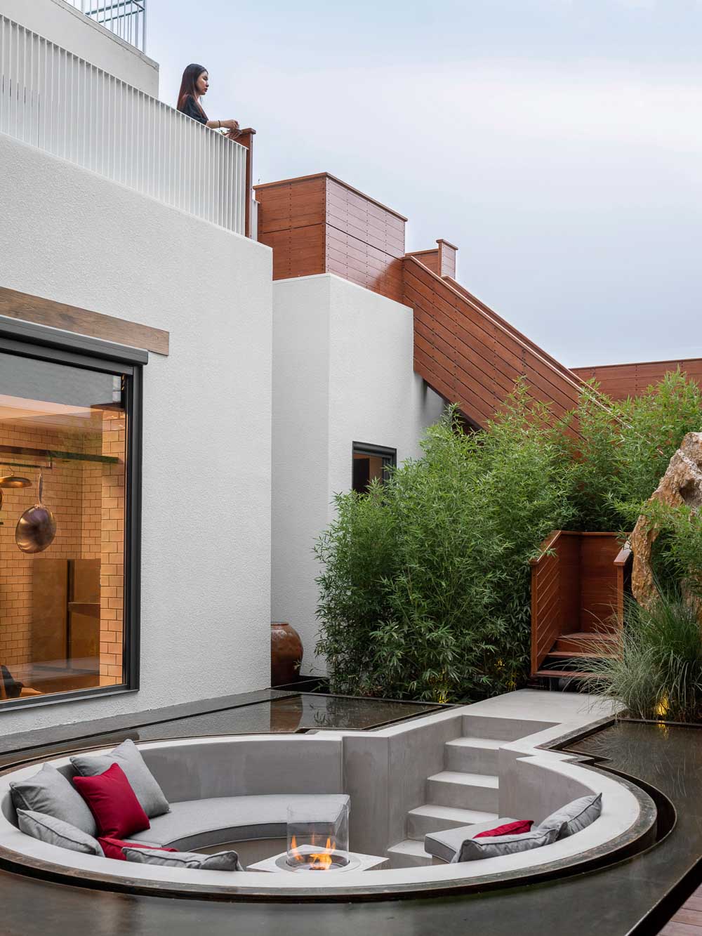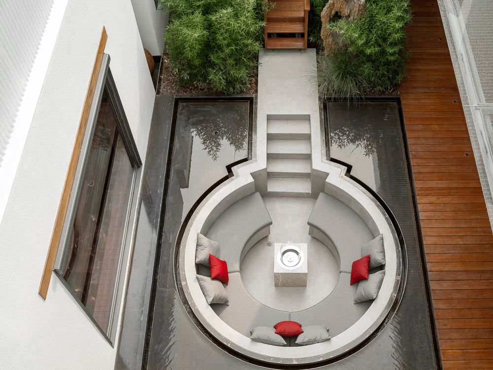 집 중앙에는 정자 같은 공간을 넣어, 긴장된 실내 공간을 풀어주었다. 시멘트로 만들어진 낮은 공간에는 물이 고여 있는데, 아이들이 웅덩이 사이를 뛰어다니기 일쑤였다. 물길의 너비는 아이들의 보폭을 고려했다.