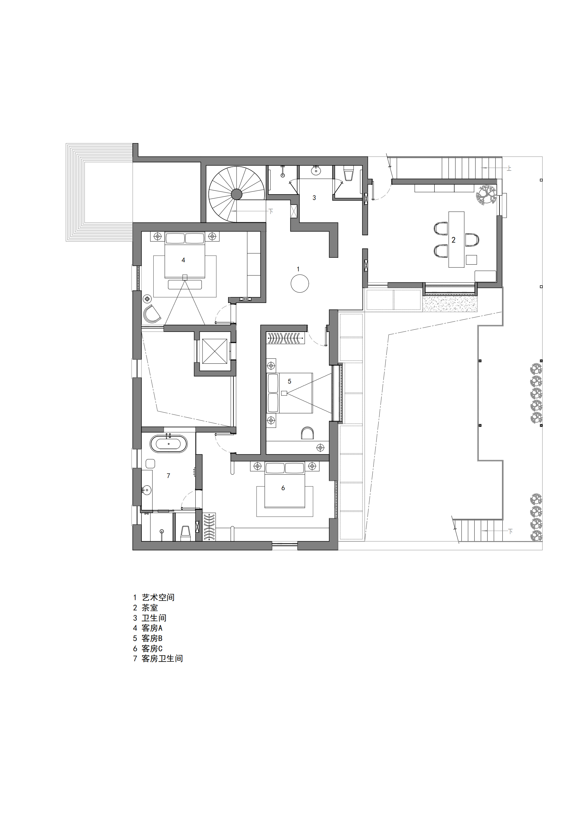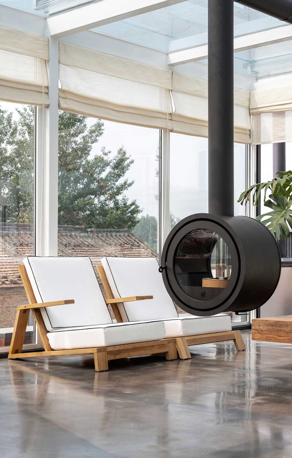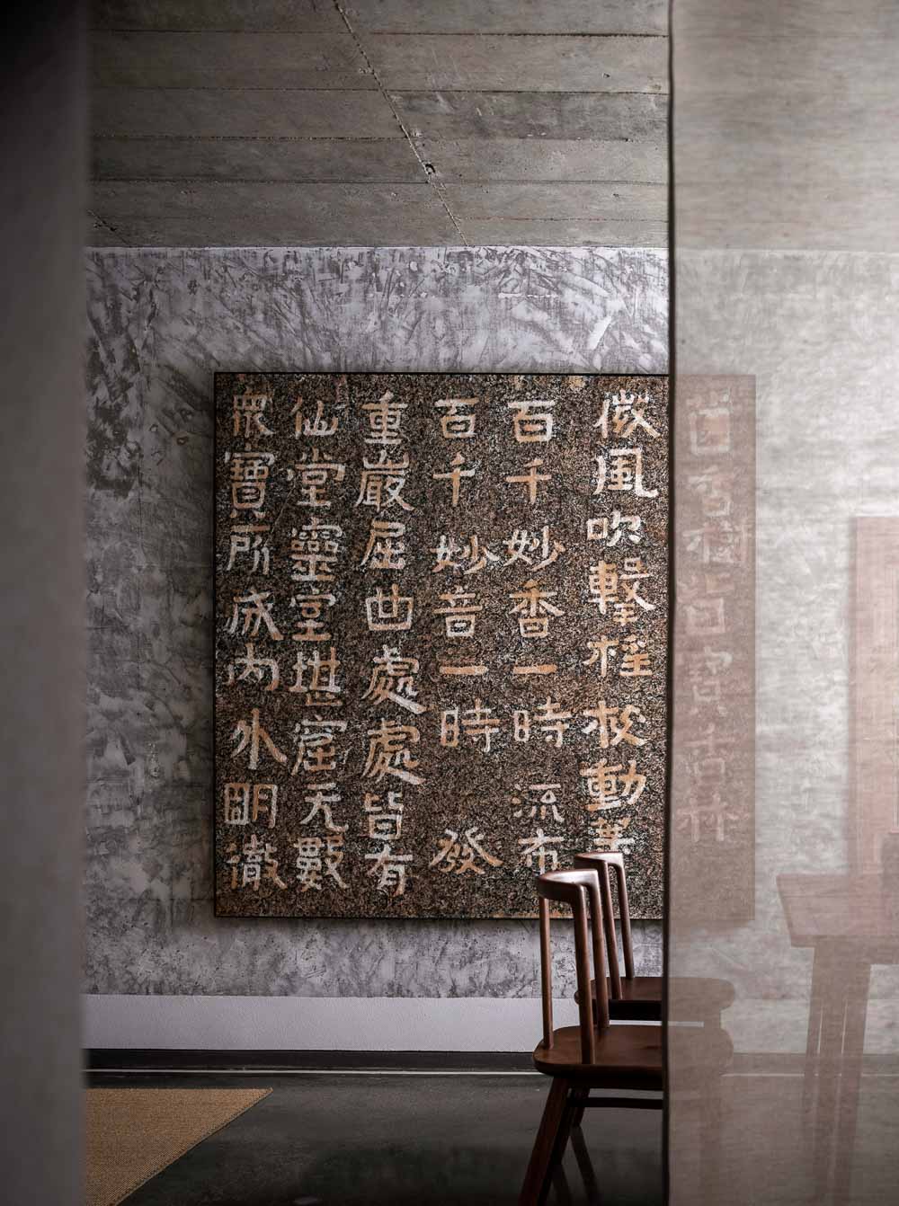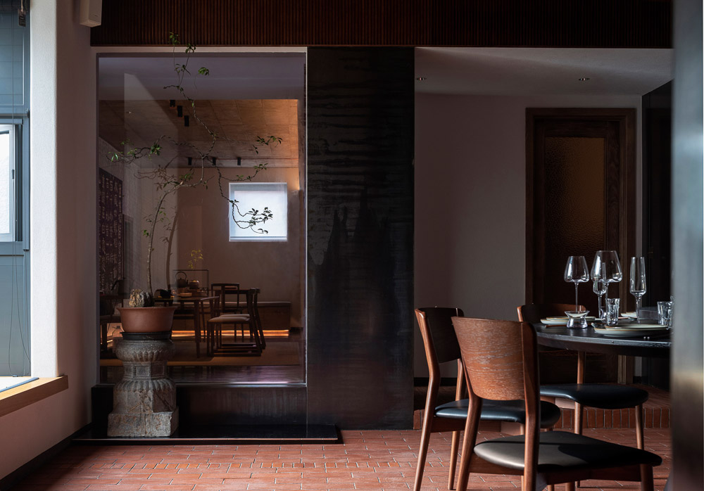To arrange the air-conditioning pipeline and ventilation, the door head fixed plates form a double-sided slope, which unexpectedly looks like a small tower from a distance, and the owner likes its implied meaning of promoting to a higher position. What’s more, the black half-enclosed wall gives entering the door meaning of approaching and retreating.