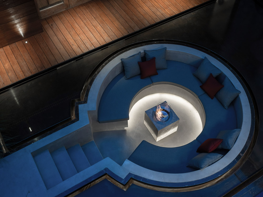 집 중앙에는 정자 같은 공간을 넣어, 긴장된 실내 공간을 풀어주었다. 시멘트로 만들어진 낮은 공간에는 물이 고여 있는데, 아이들이 웅덩이 사이를 뛰어다니기 일쑤였다. 물길의 너비는 아이들의 보폭을 고려했다.