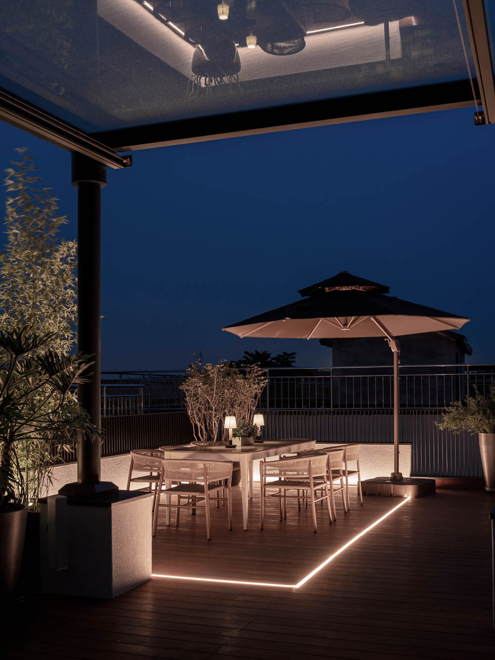 To arrange the air-conditioning pipeline and ventilation, the door head fixed plates form a double-sided slope, which unexpectedly looks like a small tower from a distance, and the owner likes its implied meaning of promoting to a higher position. What’s more, the black half-enclosed wall gives entering the door meaning of approaching and retreating.