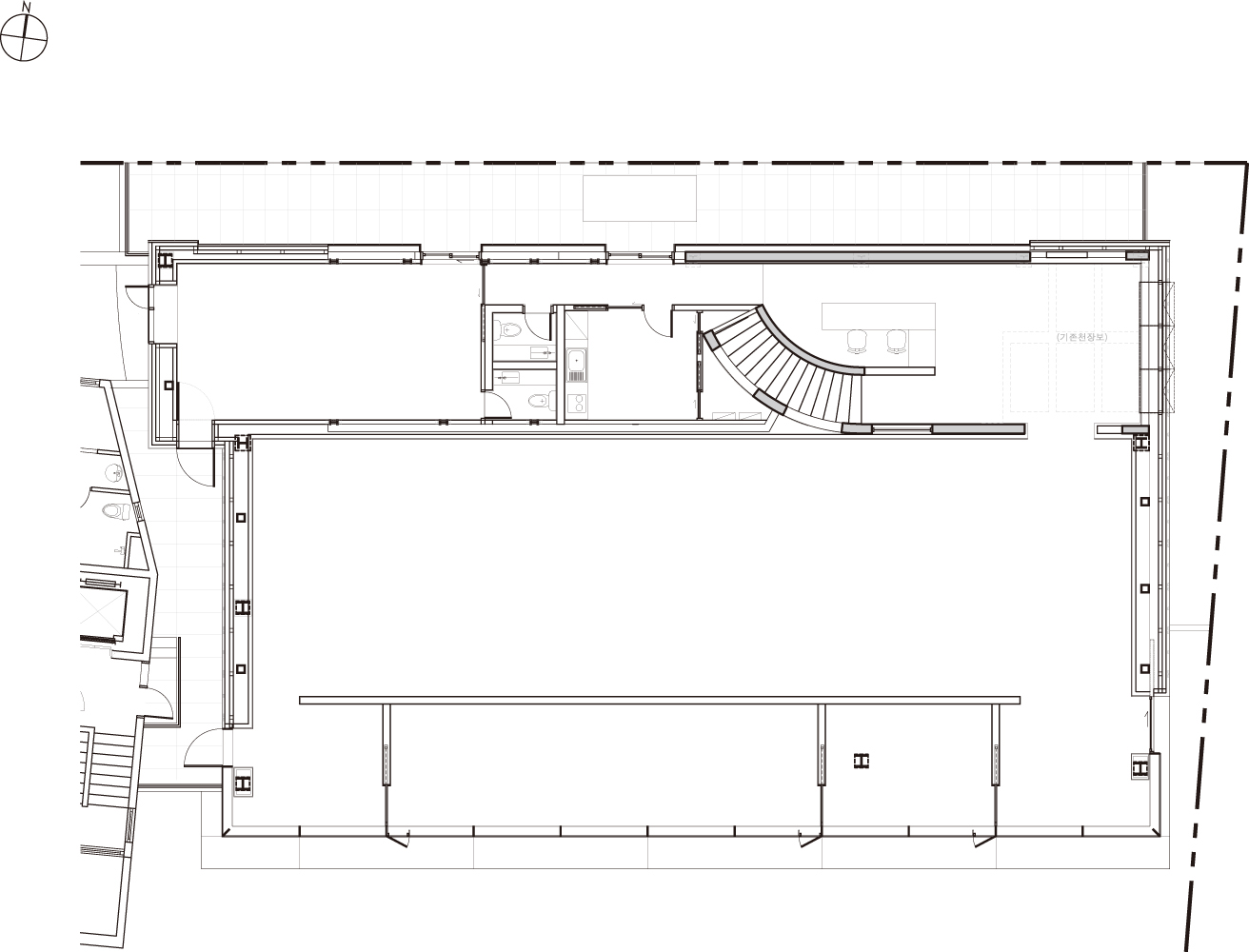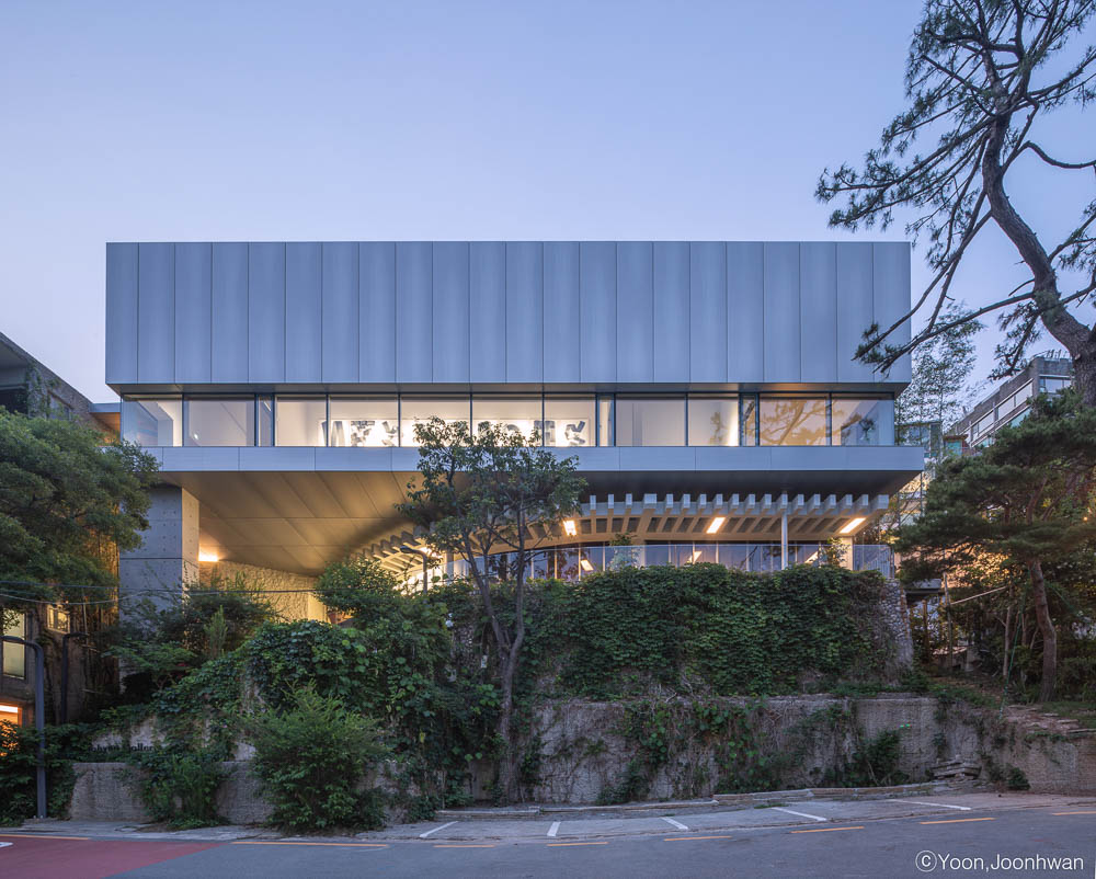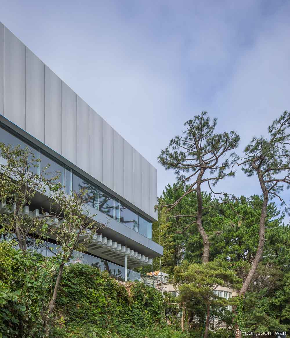 Haeundae Dalmaji Hill is a main tourist destination and residential area in Busan overlooking the sea. In recent years, the urban landscape of coastal sprawl has become paradoxically dramatic. In 2007, in this place facing a forested park, Johyun Gallery built a four-story gallery and then acquired the adjacent two-story building. Constructed in 1994, this building has been used as a cafe and exhibition space. This extension was a work to secure the necessary space with overlaying construction while maintaining the second floor of 49.05㎡, which was used as a warehouse. The size of the extension was determined based on the number of existing parking spaces and legal limit of building-to-land ratio, and it is a program with a 7m-wide exhibition room, a consultation room with sea and park views, and an employee space facing the backyard.