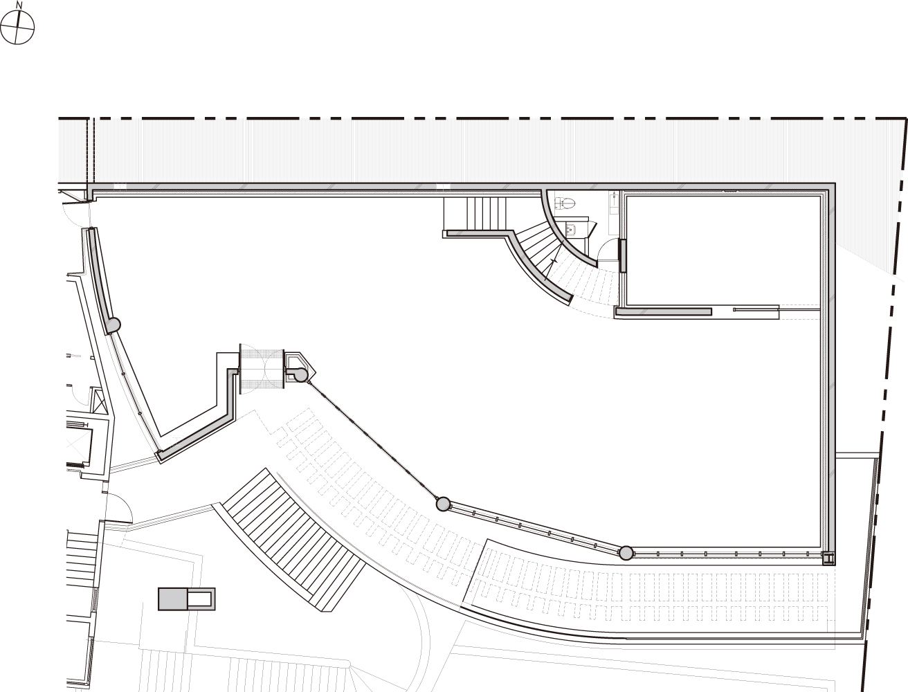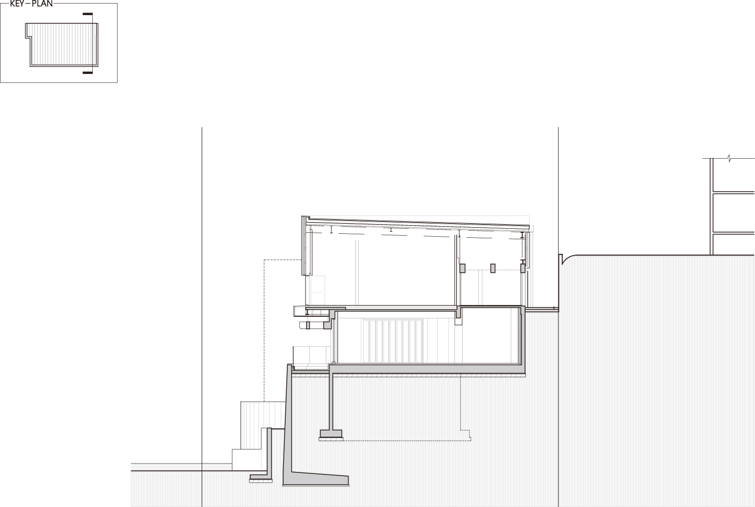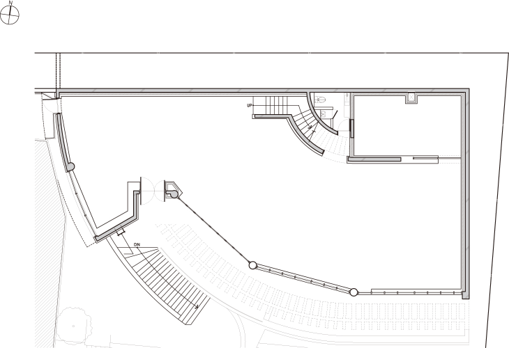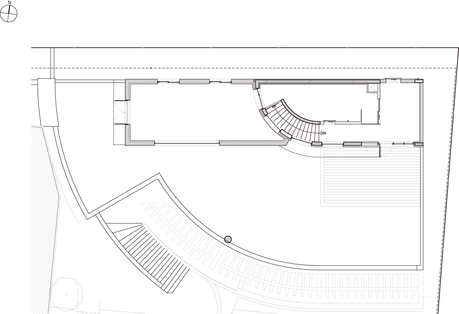 The existing building is located on a 7.5m retaining wall with an attached landscape. The first floor is a building with a decorative concrete awning in the form of a cogwheel on a heterogeneous plane with a semicircular side drawn into the entrance. In order to fit in naturally with the existing building with such strong character, a simple mass that edits complex lines was appropriate for the extension.