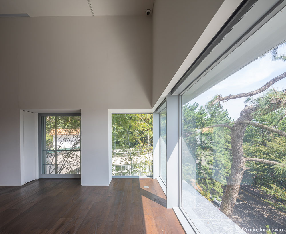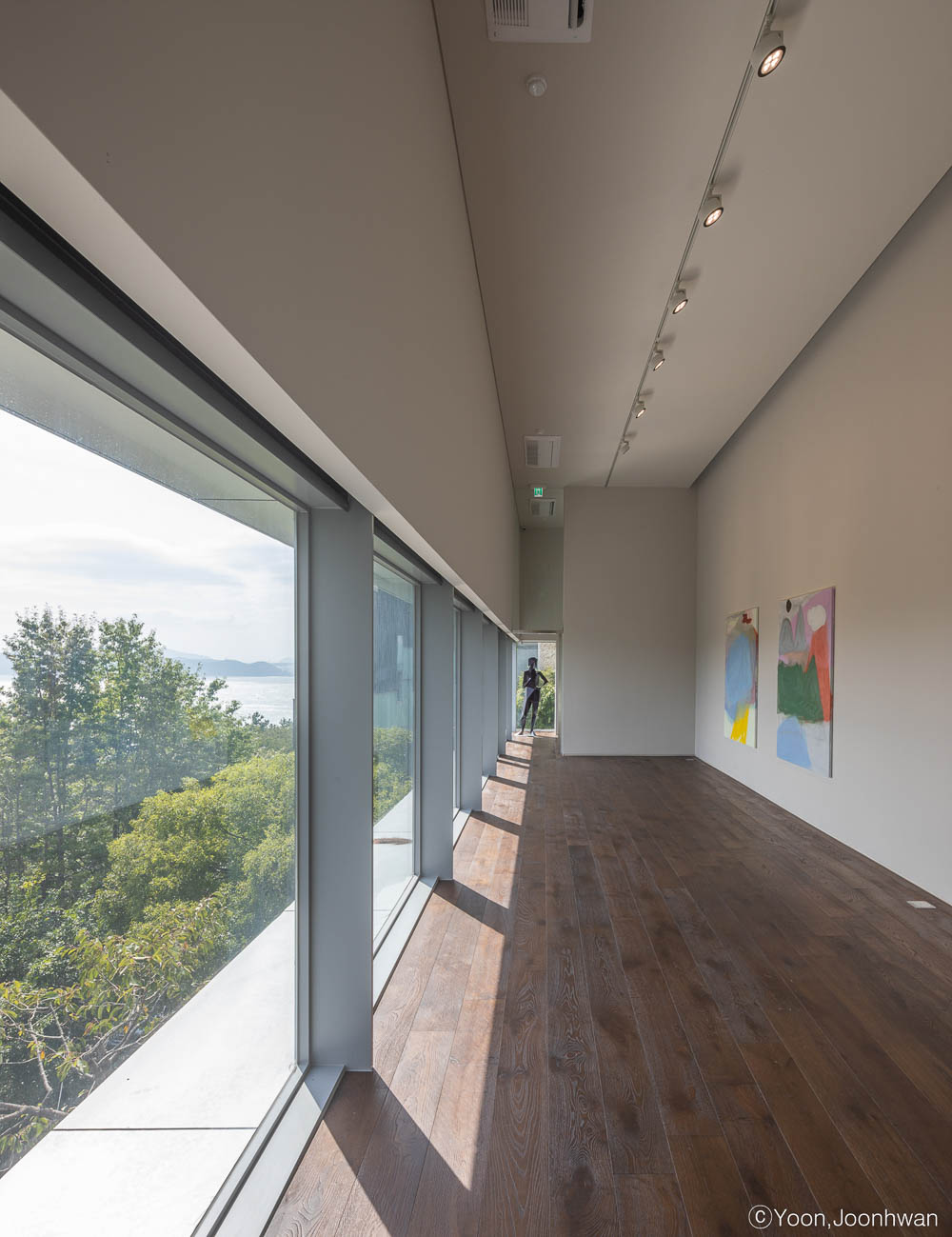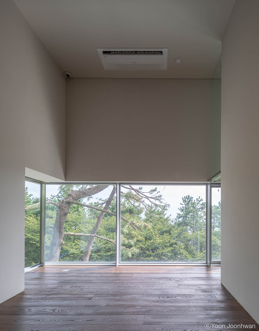 The extension part consists of three internal spaces and two external spaces. A park forest that overlaps with the sea, a linear consultation room that faces this landscape and is connected by a gap, an exhibition room that opens dramatically into the forest, but avoids light and raises the floor height, an employee space where the lower height of the existing building and the higher floor height of the extension are overlapped, and a 2.5m high adjacent site and a yard built in between. The design prioritized spatially combining architecture and the surrounding environment, existing and extension, art and architecture, and establishing a relationship that is natural and does not reduce tension. The interior space is neutralized so that the space becomes an artistic device in relation to the exhibited works. In addition, by processing it in a simple way rather than putting a spatial change in place, it does not interfere with the visual appreciation of the work. The scenery seen at the beginning and end of the high and deep exhibition room creates a space where tension and relaxation are repeated by creating a space for appreciation.
