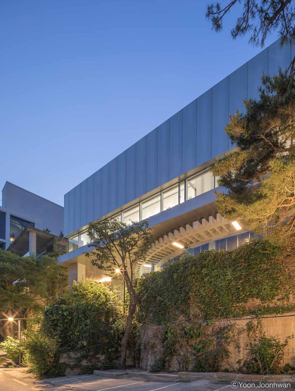Haeundae Dalmaji Hill is a main tourist destination and residential area in Busan overlooking the sea. In recent years, the urban landscape of coastal sprawl has become paradoxically dramatic. In 2007, in this place facing a forested park, Johyun Gallery built a four-story gallery and then acquired the adjacent two-story building. Constructed in 1994, this building has been used as a cafe and exhibition space. This extension was a work to secure the necessary space with overlaying construction while maintaining the second floor of 49.05㎡, which was used as a warehouse. The size of the extension was determined based on the number of existing parking spaces and legal limit of building-to-land ratio, and it is a program with a 7m-wide exhibition room, a consultation room with sea and park views, and an employee space facing the backyard.