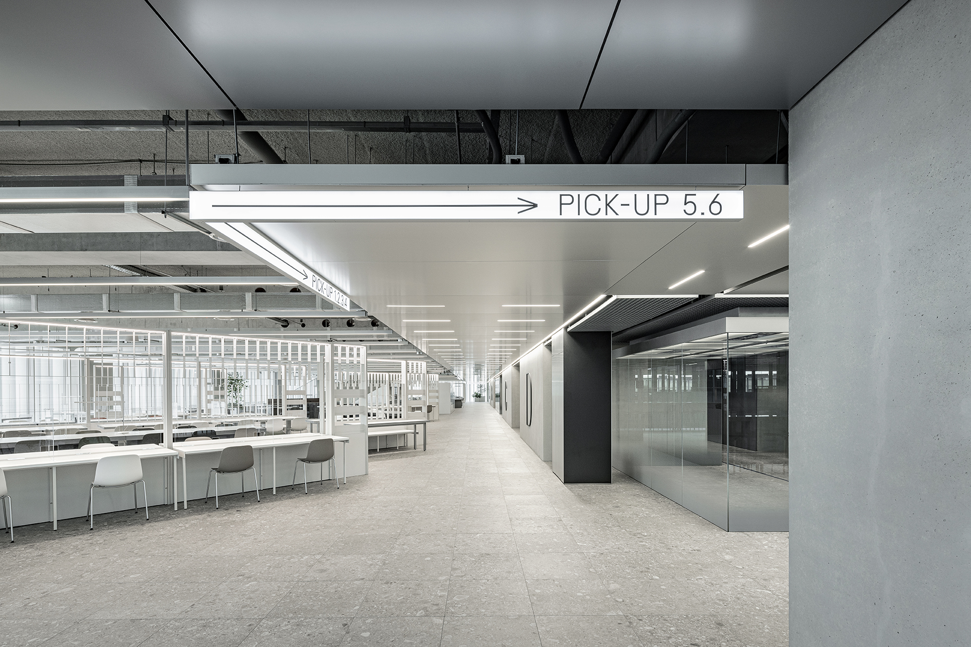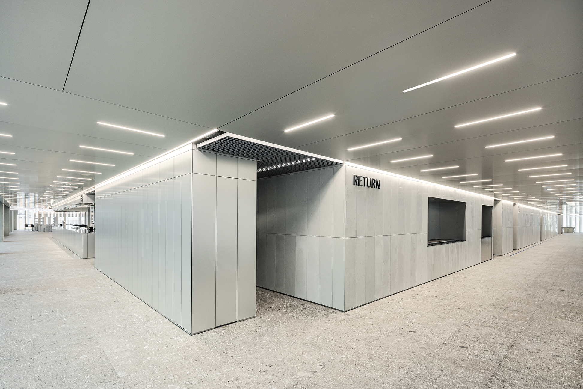 동선의 효율적인 시스템을 위해 코어 중심으로 키친부스가 설치되어 운영 시간에는 키친부스의 오픈 카운터에서 히든스크린 시스템을 활용해 표출되는 해당 넘버를 확인하여 음식을 픽업할 수 있고, 식사 시간이 끝나면 키친부스의 개구부는 자동으로 닫혀 주방의 운영 이후 작업 공간과 직원들의 식사, 업무 공간을 완전히 분리할 수 있다.