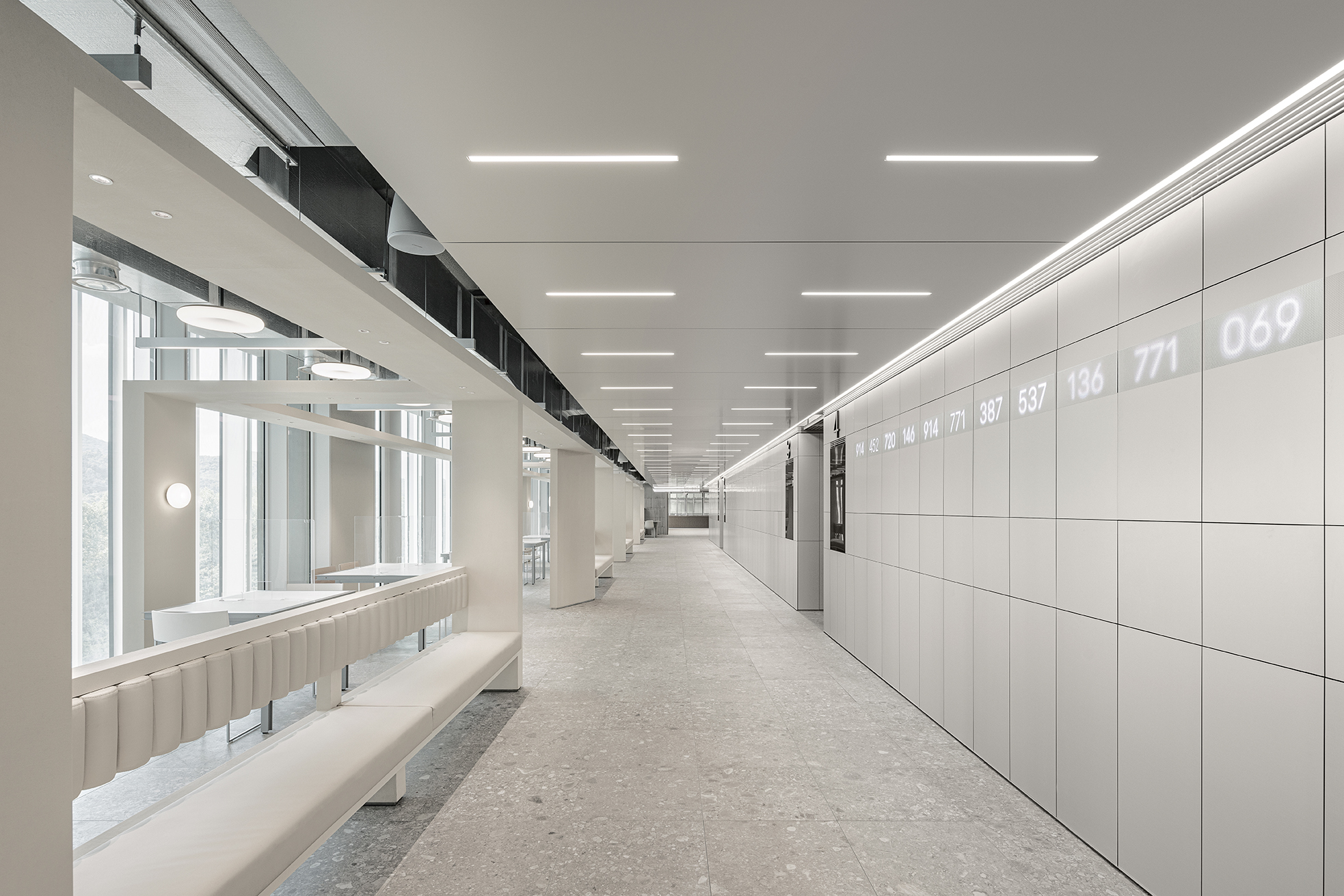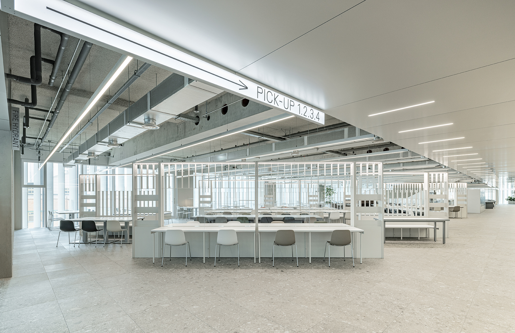 식당의 좌석 공간은 코어의 엘리베이터홀에서 나와 우측으로 진입하는 동선 기준으로 코너를 돌며 다양한 좌석 영역을 경험할 수 있는데 홀에 들어서면 제일 먼저 워싱스테이션에서 손을 닦고 어떤 메뉴를 먹을지 고를 수 있는 미디어가 있다. 또한 남쪽 좌석 영역은 ‘라이브버리’ 컨셉으로 넓은 개방감과 혼밥 또는 그룹 회의를 하기에 적합한 좌석타입과 사선 방향의 파티션 배치 구성으로 안정감과 다양한 입체감을 동시에 주고자 했다.