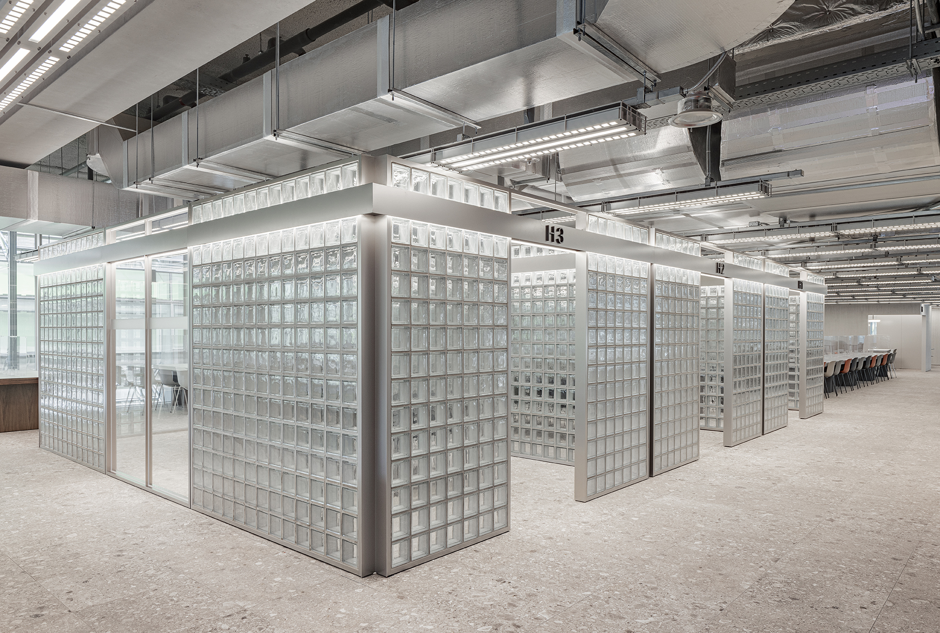 Considering the balance and harmony of NAVER 1784's existing architecture and interior finish, the main finish was a modern natural tone and manner that naturally matches concrete and natural tone gray floor tiles, and concrete, aluminum, glass blocks, metal louvers, and wood were used.