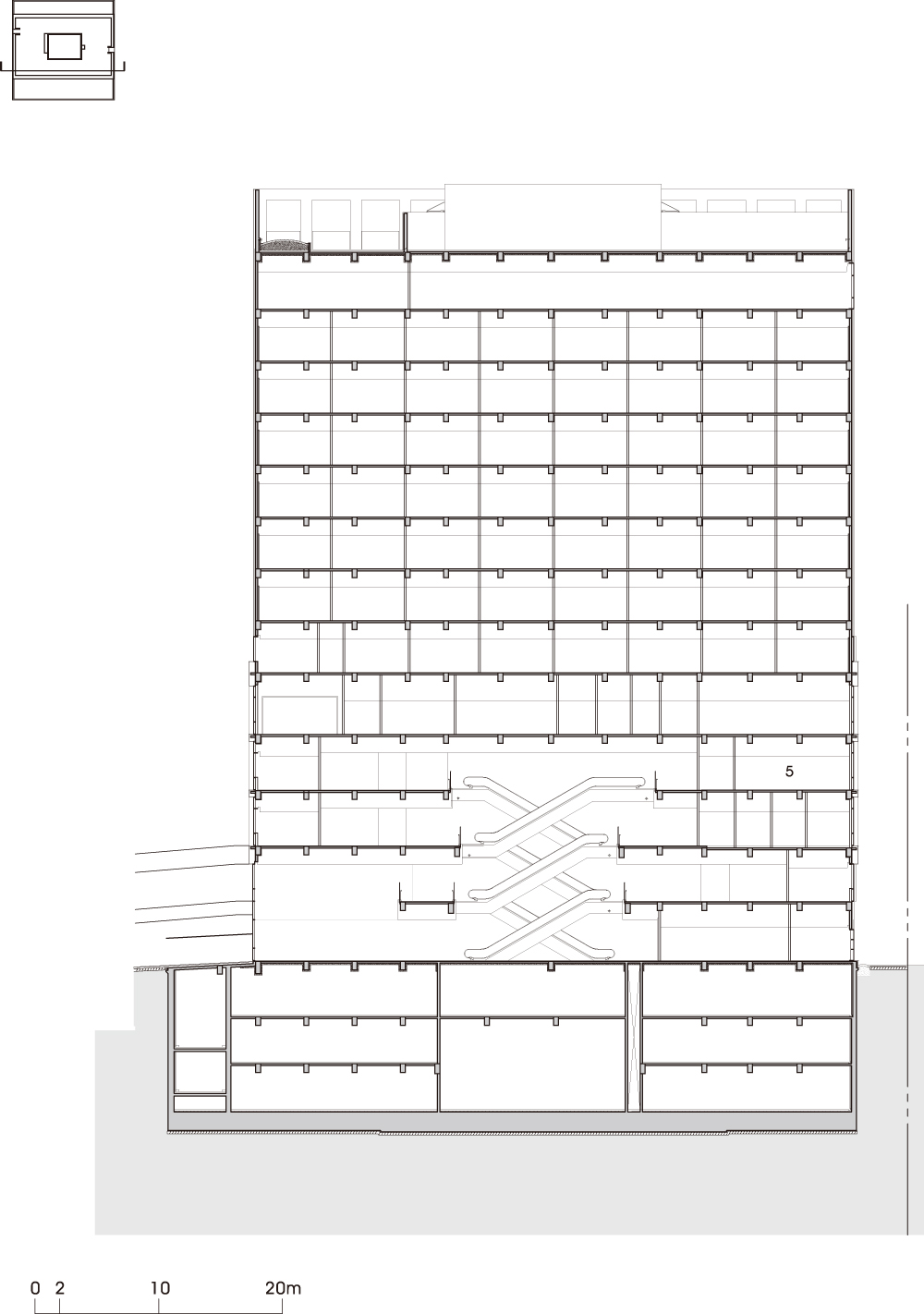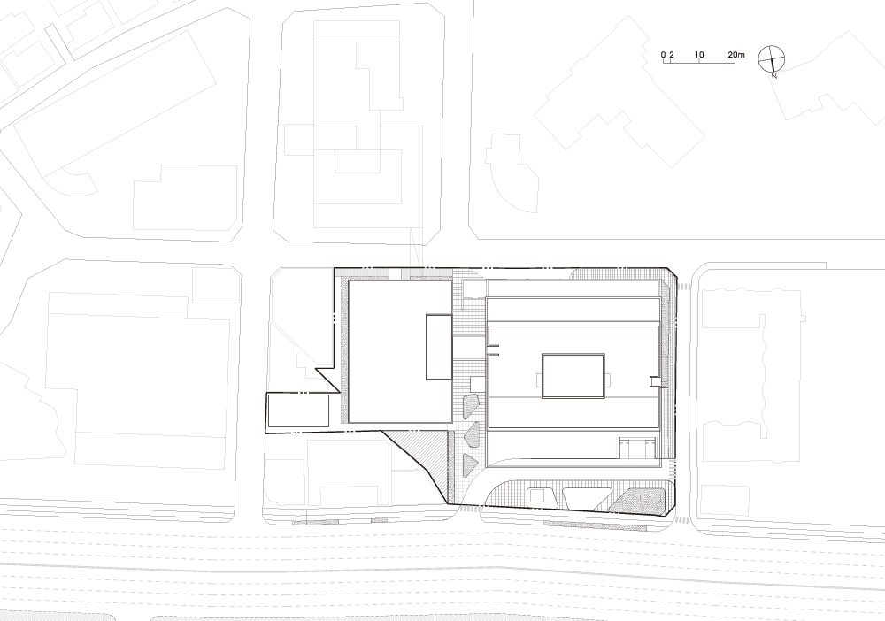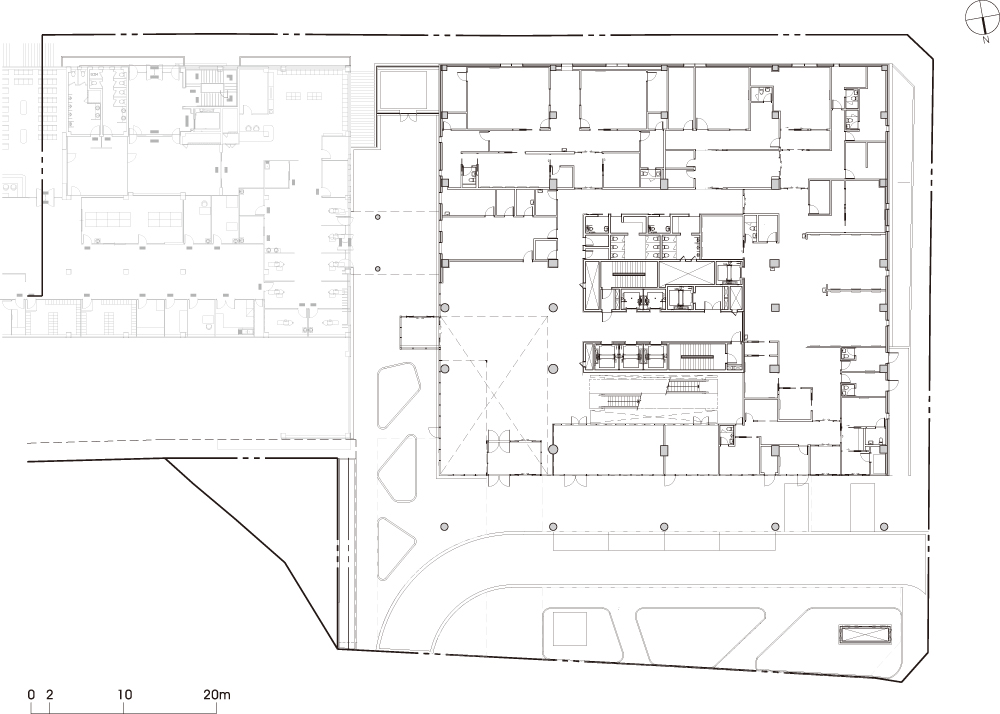 The overall form is a traditional hospital consisting of a podium with outpatient functions and a high-rise ward. The above ground program consists of outpatient treatment and examination (1st to 4th floor), operating rooms and intensive care unit (5th floor), hospital rooms (6th to 12th floor), office and cafeteria (13th floor), and rooftop garden (14th floor). The façade expresses these different functions through changing patterns in the windows. First, the ward windows were expressed uniformly with depth. With the motif of the operating rooms being on a windowless floor, a regular but overall change was made by switching the front, rear, right, and left windows with each other. In the ward, a corridor was created for hospital rounds, and the wards were arranged in the north and south around the core, nursing, and service areas to secure an open view.