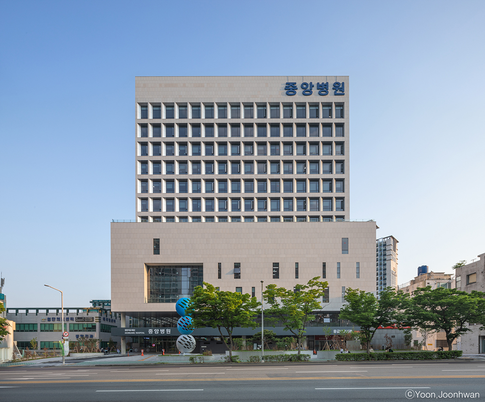 In such a functional building, formative design tends to be a head-scratcher for architects. As a regional general hospital, recognizing the representation related to the professionalism of treatment through architecture is closely related to the management of the hospital. In the design of this specialized hospital, the design direction was focused on exposing functions in form rather than various architectural devices that have been used traditionally. The honesty of hospital management that cares about patients is branded and expressed in the image of architecture. The simple but honest and consistent format will serve as an icon representing the management characteristics of Joongang Hospital.