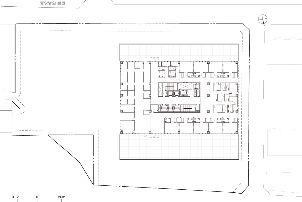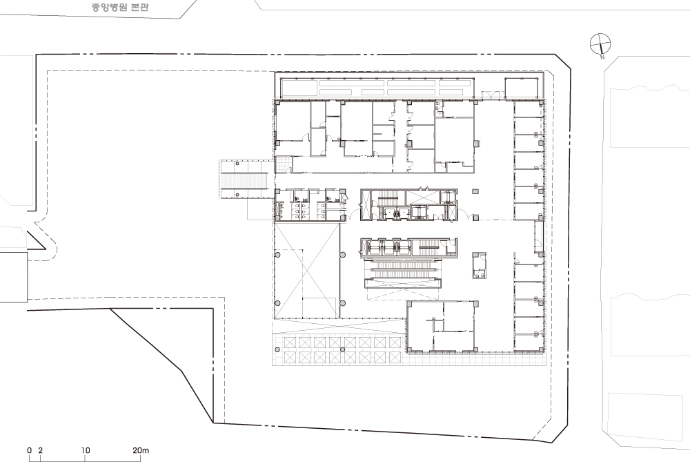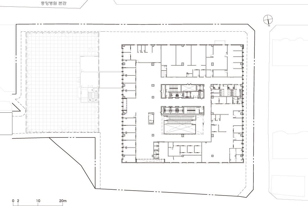 Joongang Hospital already runs a general hospital in close contact with the planned site, and wanted an extension to house 400 inpatient beds on the site that was used as a parking lot. According to the marketing strategy, the scale of outpatient treatment and examination programs, operating rooms, and inpatient beds was provided. The beginning of the plan prioritized the layout and floor plan that accommodated the operating programs, shortening of the movement and facility efficiency, and patient-oriented convenience and comfort. As a result, it became a floor plan in consideration of appropriate facility allocation, establishment of a clear circulation system for medical treatment, medical staff, supplies, and support, flexibility to respond to medical changes, and economic feasibility of construction.