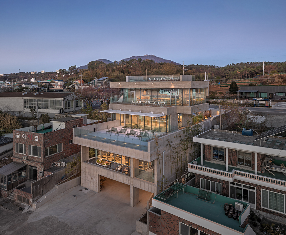 최근 바다 조망이 좋은 기장, 일광 지역은 카페 격전지라고 해도 지나치지 않다. 인스타그램과 코로나19의 영향이 크다. 이 프로젝트는 기장 해안길에 또 하나의 카페를 더하는 일이었다. 대지는 어촌마을 끝자락의 더이상 영업을 하지 않는 1~2층 규모의 낡은 횟집들과 주택들 사이에 위치하고 있다. 이곳의 바다는 근사한 바위도 없고, 흔한 해송 하나 없다. 바다는 부지에서 30m나 떨어졌고, 그 사이는 다시마를 말리는 어민들의 일상공간이다. 이곳에 들어서는 카페건축은 어떤 자세이어야 하는가 하는 고민이 계획의 시작이었다.