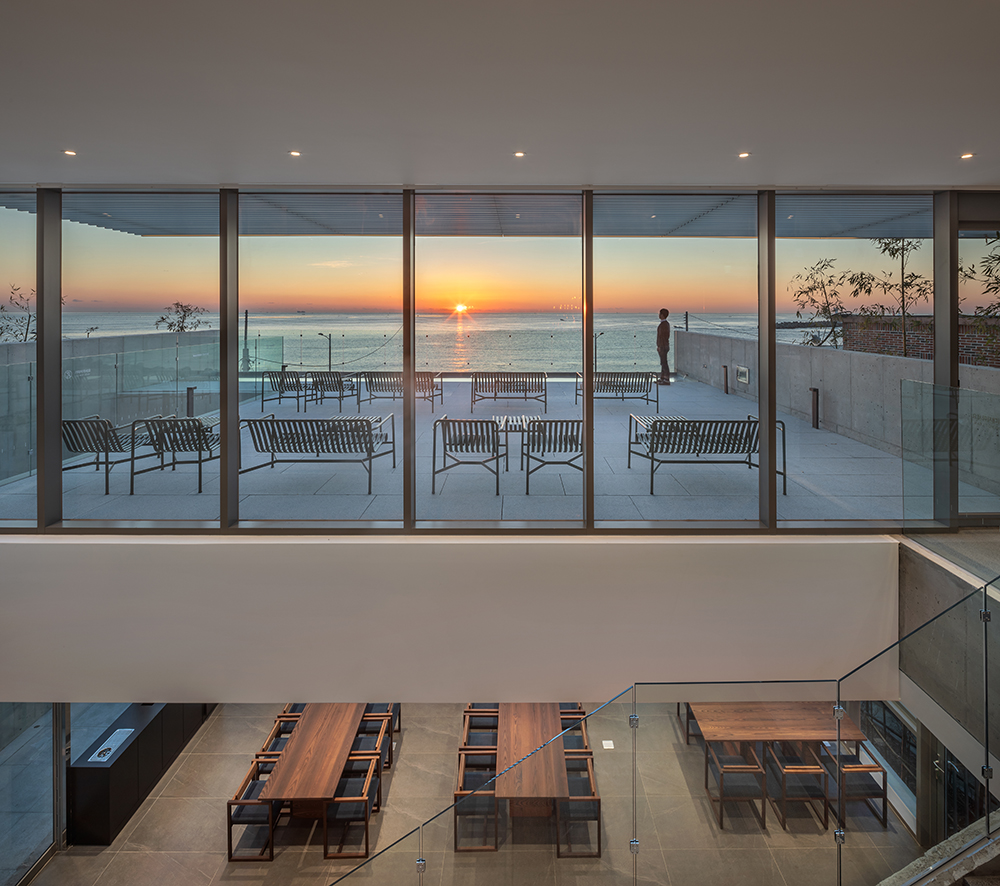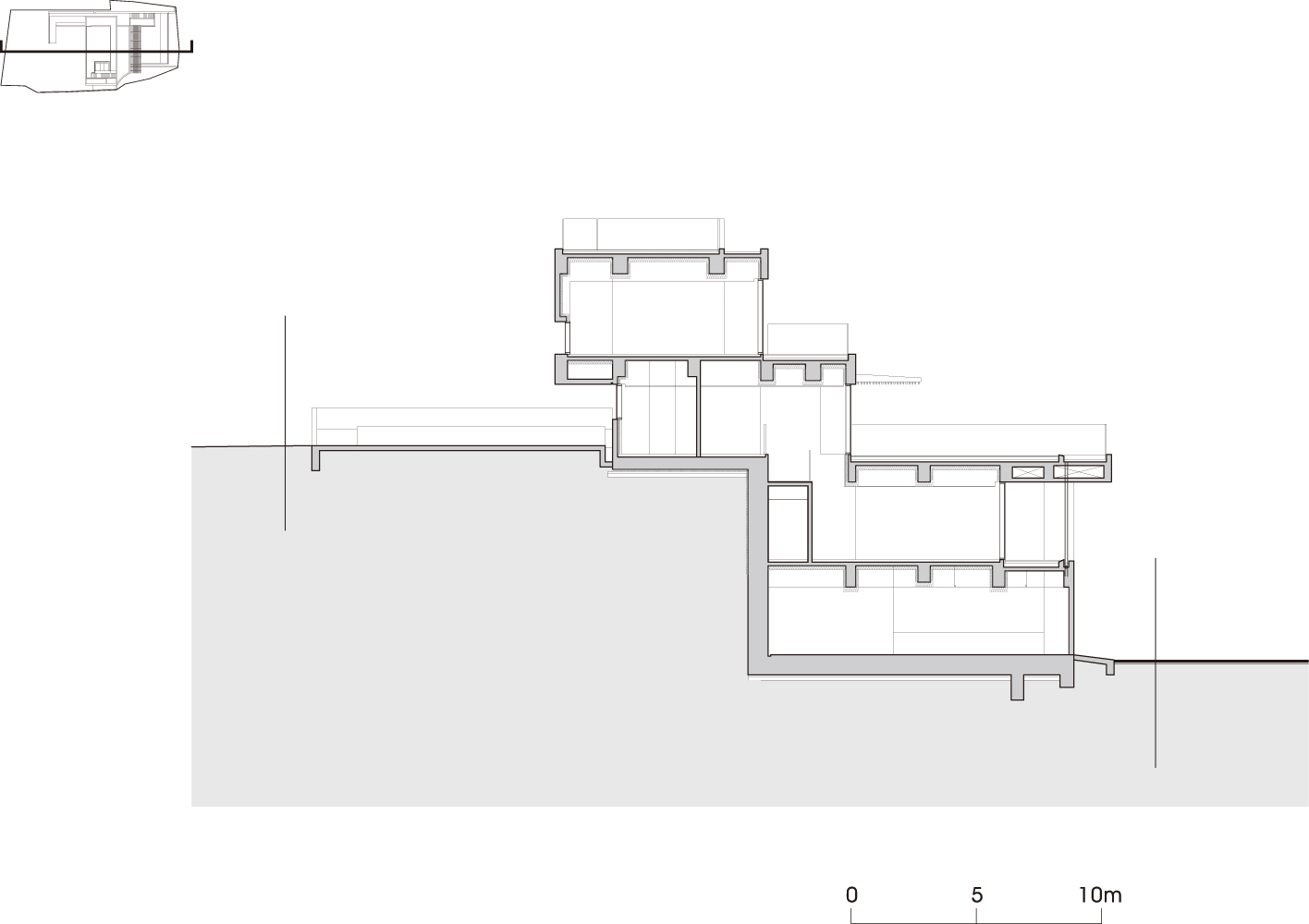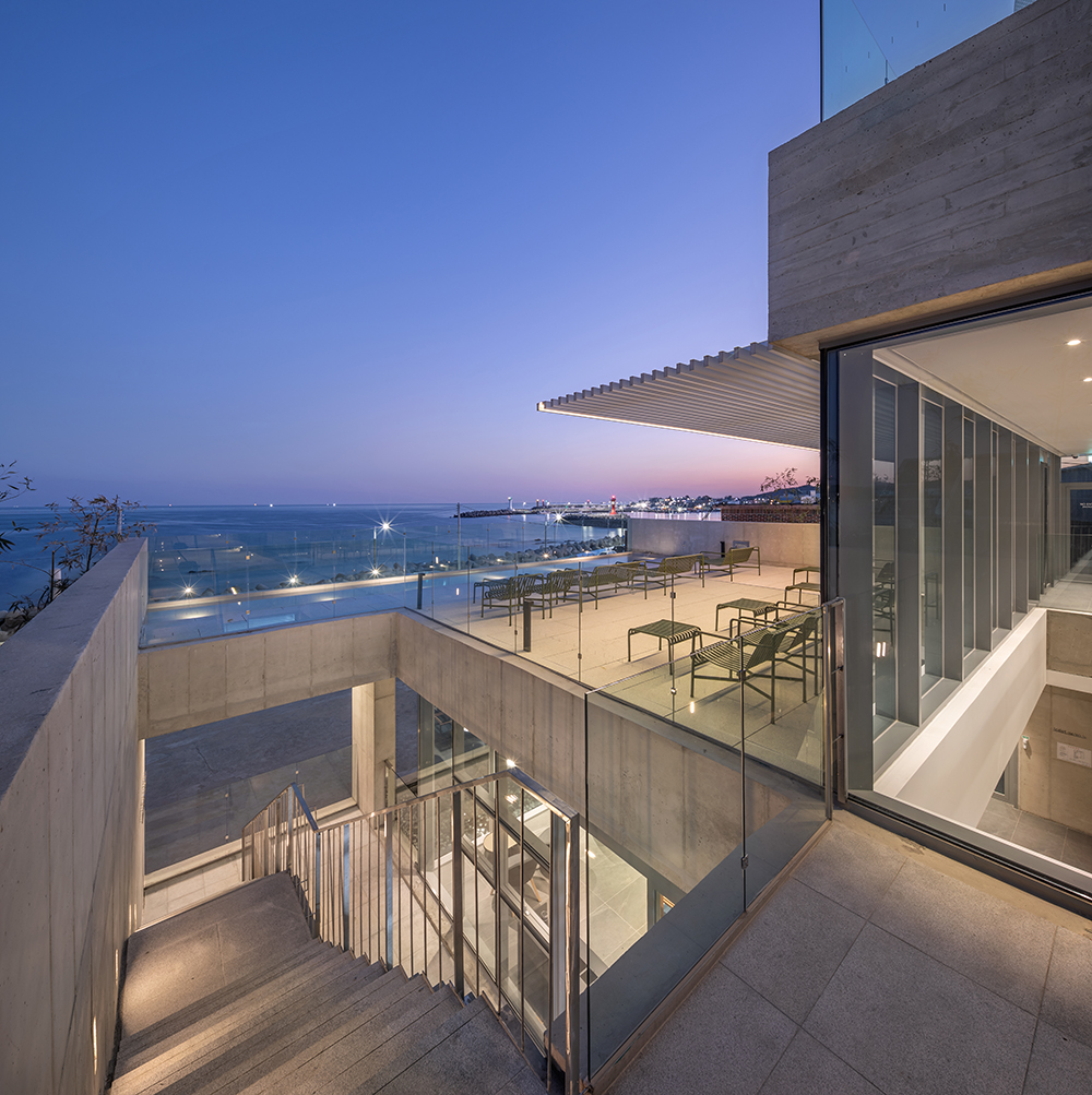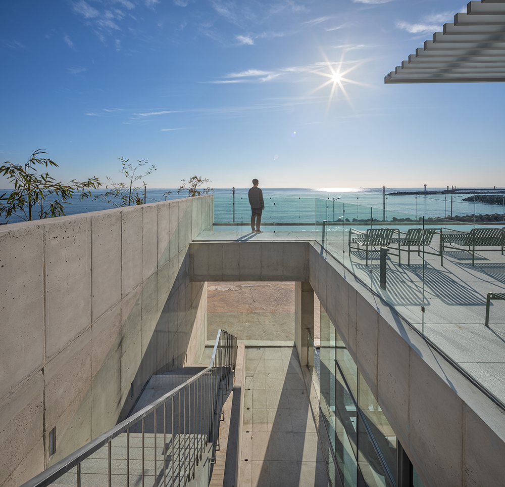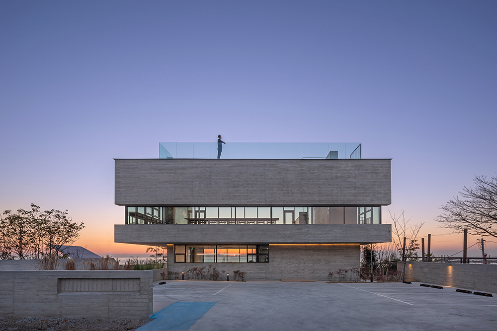 The area on the third floor where visitors enter from the main road was minimized so as not to block the entire view of the sea when the building was built. An open window and an outside space were planned to create a view that opens to the ocean. The water space planned along the access road is a transition space with the sound of calm water and the wind rushing through bamboo trees. In addition, the somewhat scattered scenery seen in the interior and exterior spaces was edited. Unnecessary elements were cut out, and the distant ocean was brought closer. The building is terraced according to the topography, and the view was controlled by placing balconies and eaves on each floor.