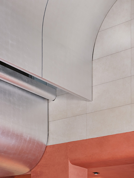 입구에 들어서면 파도를 연상시키는 형태와 빛을 머금고 있는 듯한 느낌의 은박지로 마감된 심플하지만 웅장한 천장이 손님들을 반깁니다.